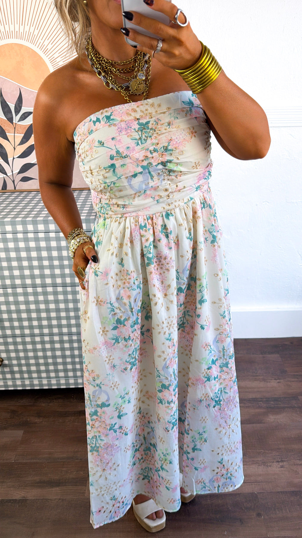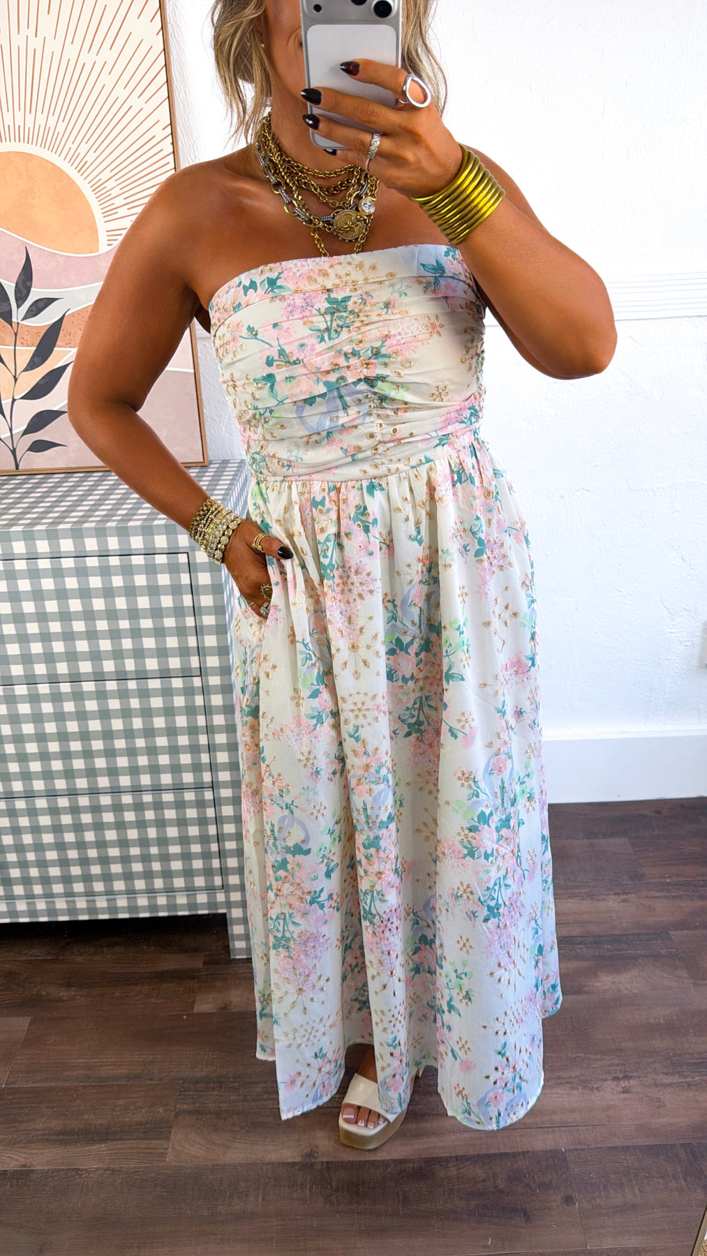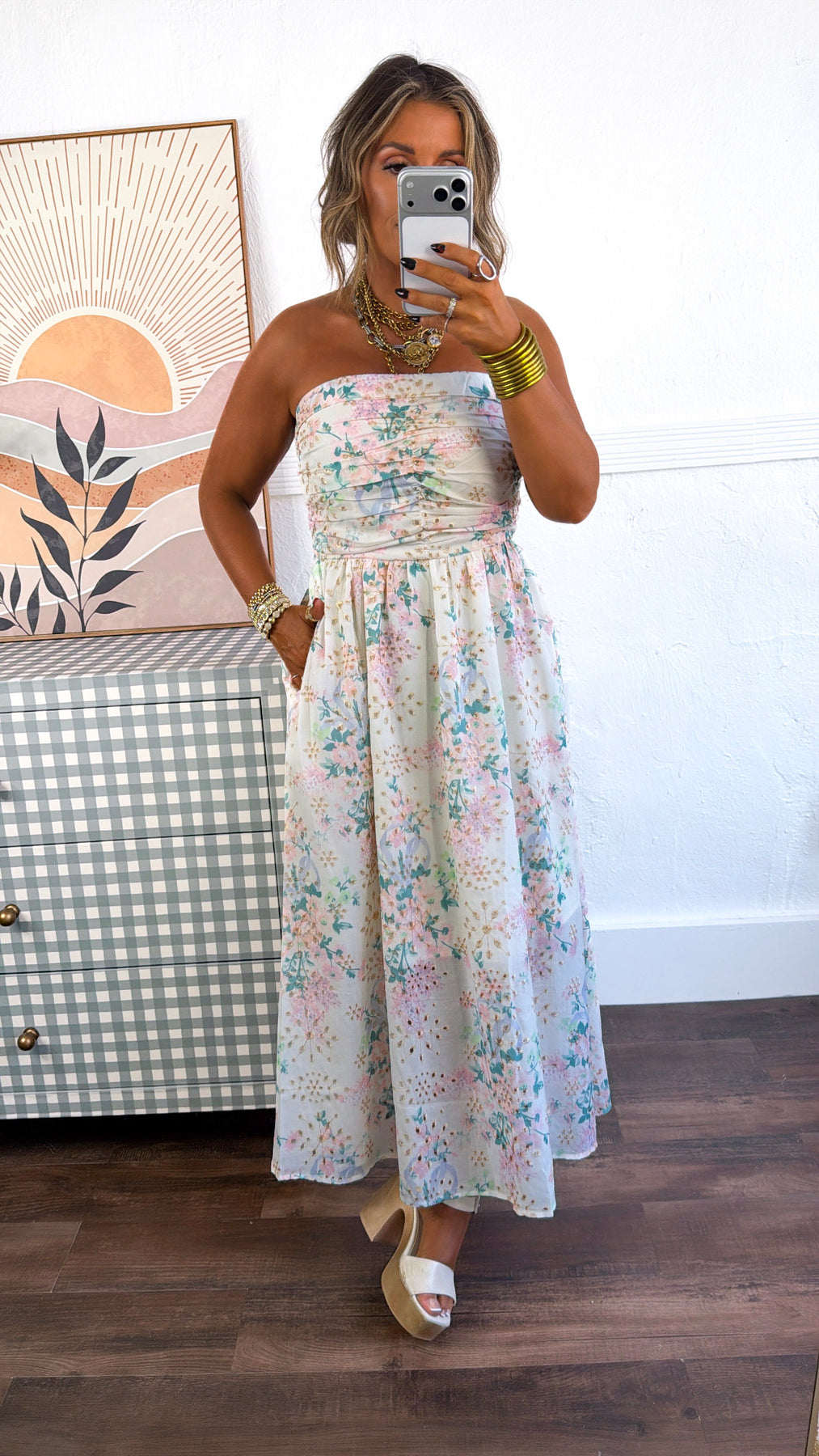 Soft, romantic, and effortlessly feminine. This dreamy floral midi is made for sunshine-filled days and sweet summer moments. With its flattering ruched bodice and flowy skirt, it gives you that easy, put-together look with zero effort.