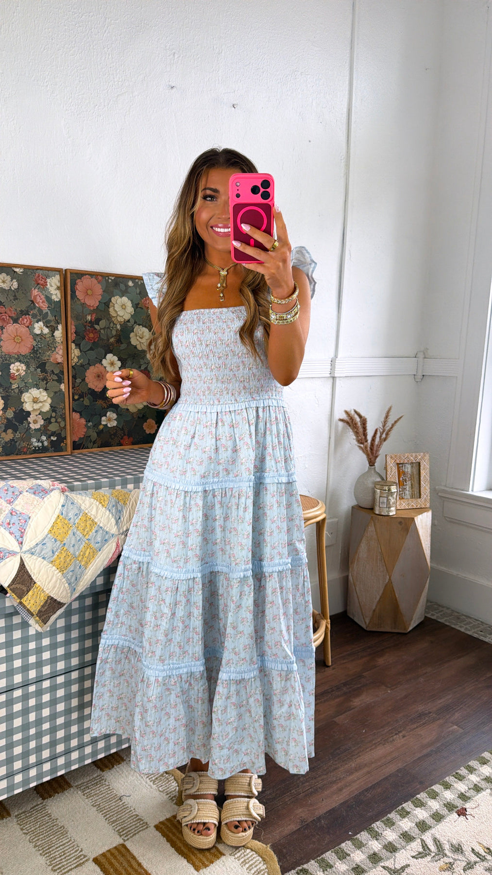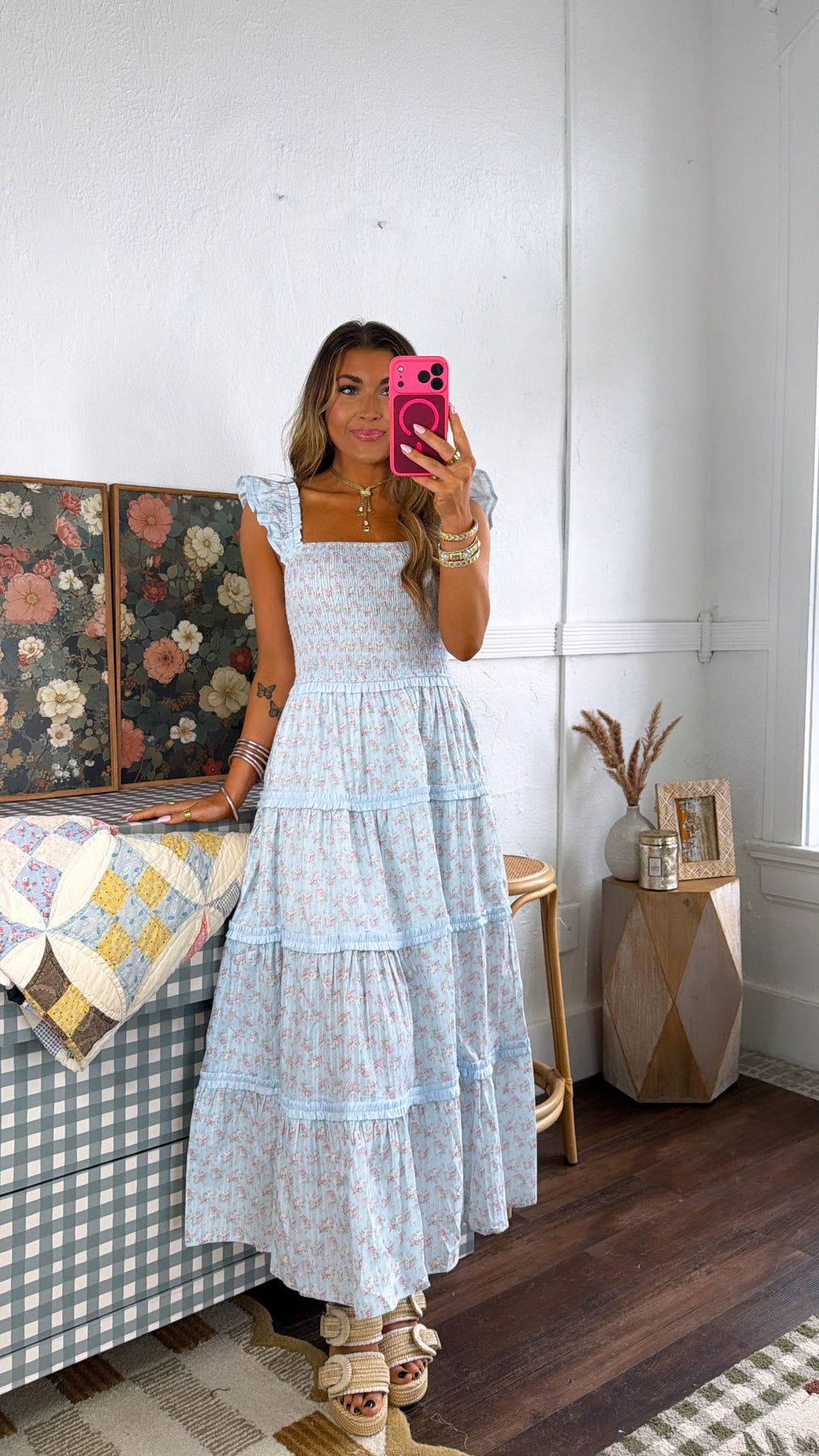 Featuring a delicate light blue floral print, this maxi is designed with a smocked bodice for a flattering fit and ruffle strap details that add the prettiest touch. The tiered skirt flows beautifully, making it perfect for any occasion.