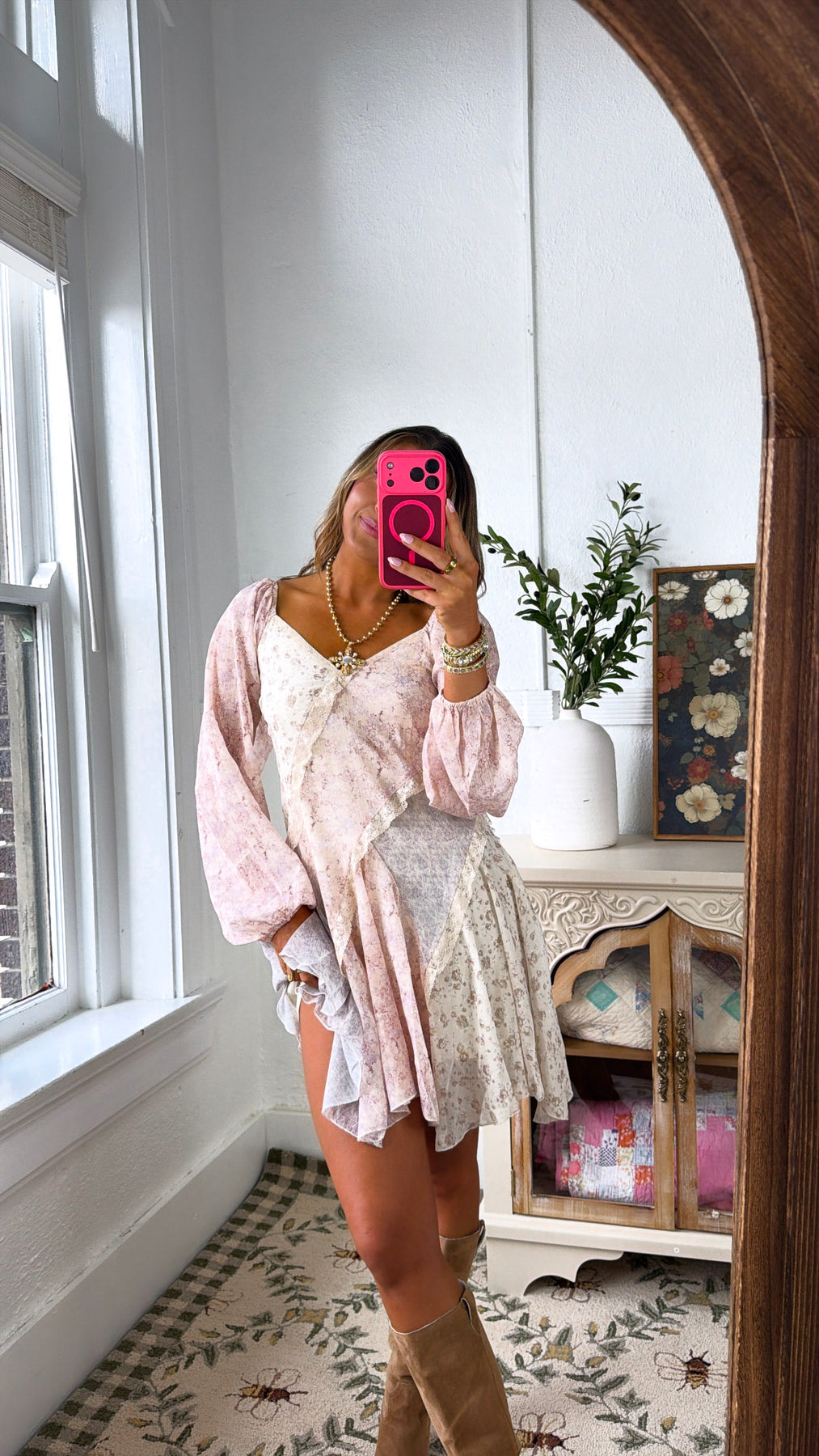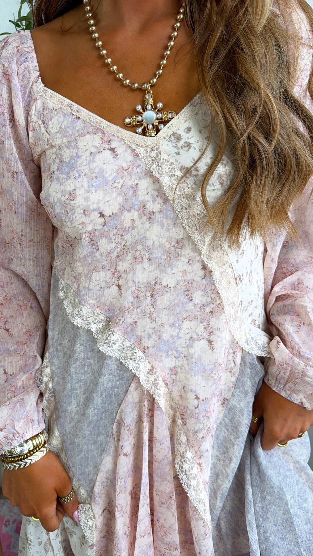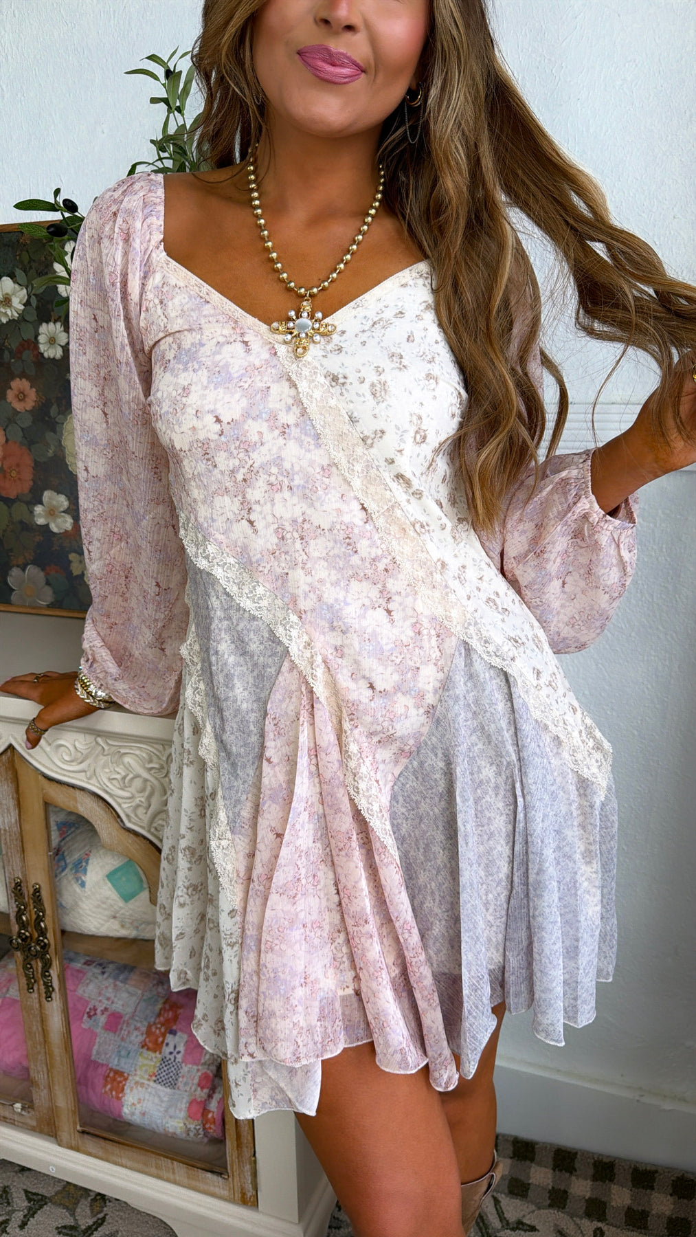 Soft, romantic, and effortlessly vintage-inspired. The Golden Bella Mini Dress is a dreamy mix of delicate florals, lace trim, and flowy movement that gives it that perfectly undone, feminine feel.