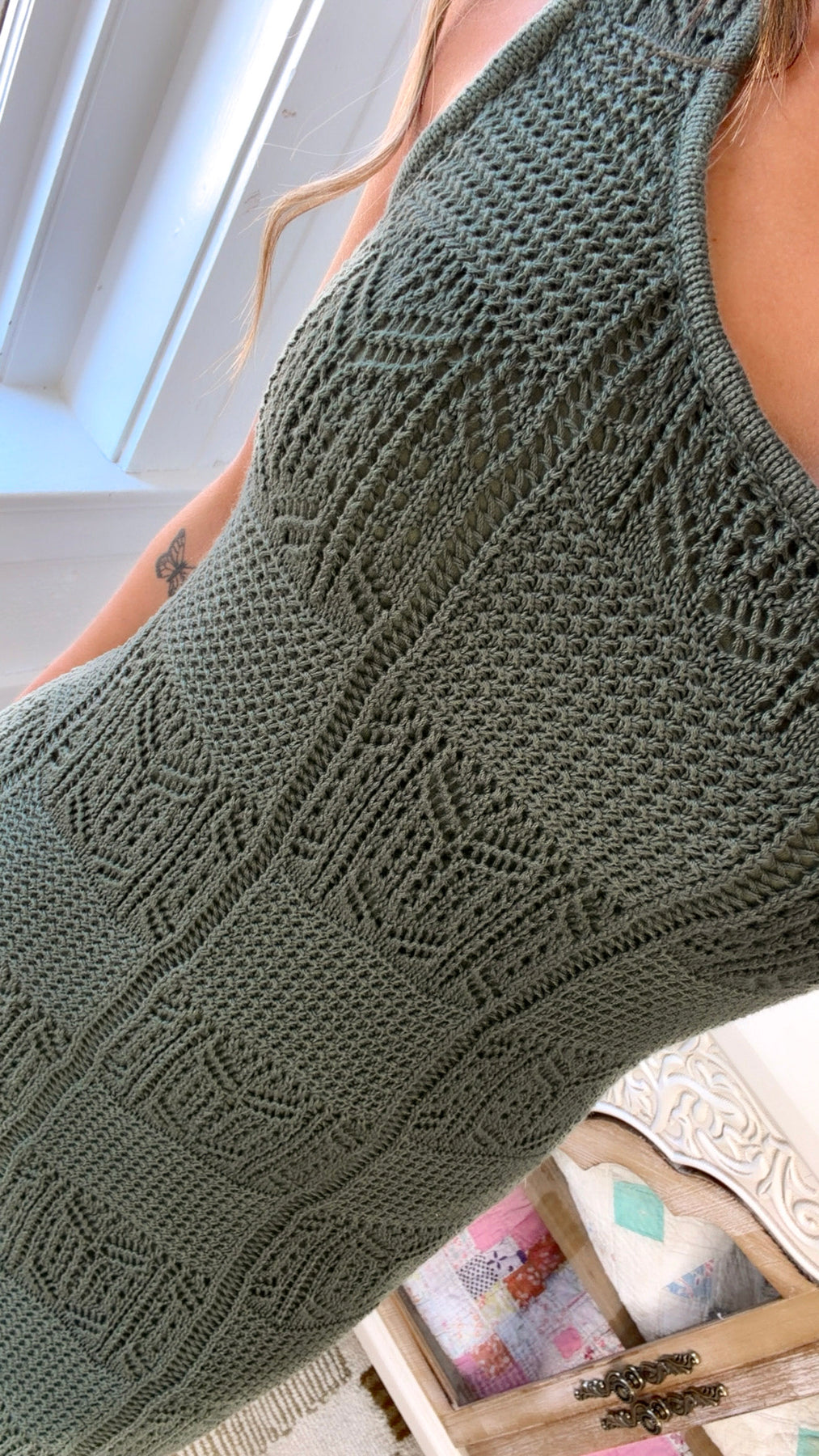 Effortlessly timeless with a hint of earthy romance. The Golden Meadows Maxi Dress in Olive is your go to for elevated everyday style. Featuring an intricate knit texture and flattering, body skimming silhouette, this piece blends cozy comfort with a refined, feminine feel. The rich olive hue adds a grounded, versatile touch that transitions beautifully from season to season.