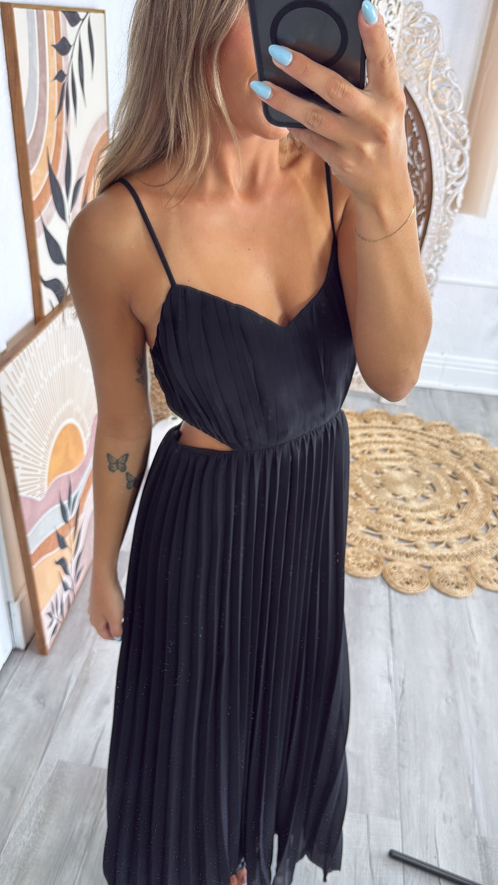 A staple for spring and summer, this so pretty Maxi dress is featured in a cut-out side silhouette with a fitted pleated bodice, elastic under bodice, open back, lined skirt, and adjustable spaghetti straps. Gorgeous for so many occasions.