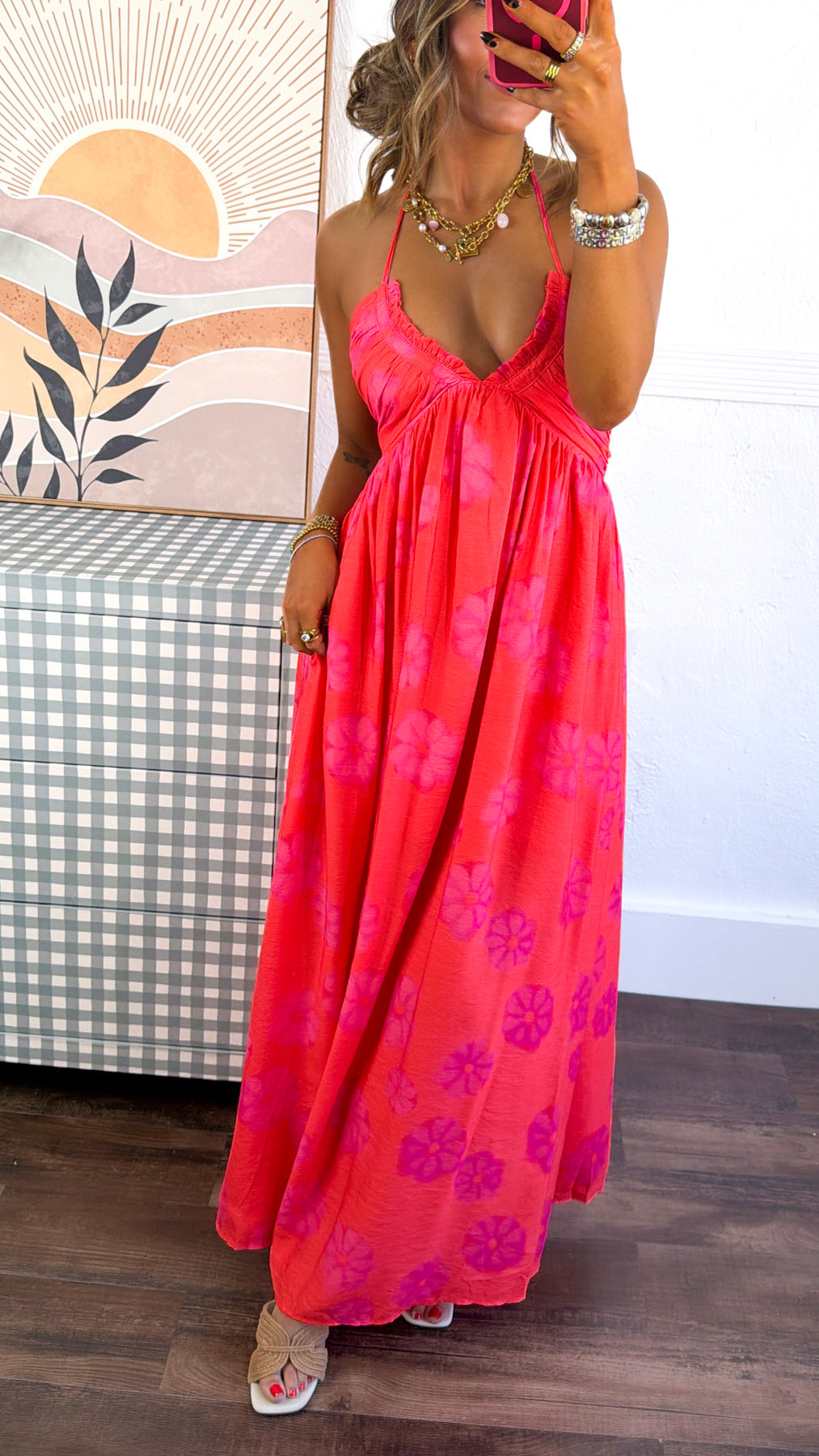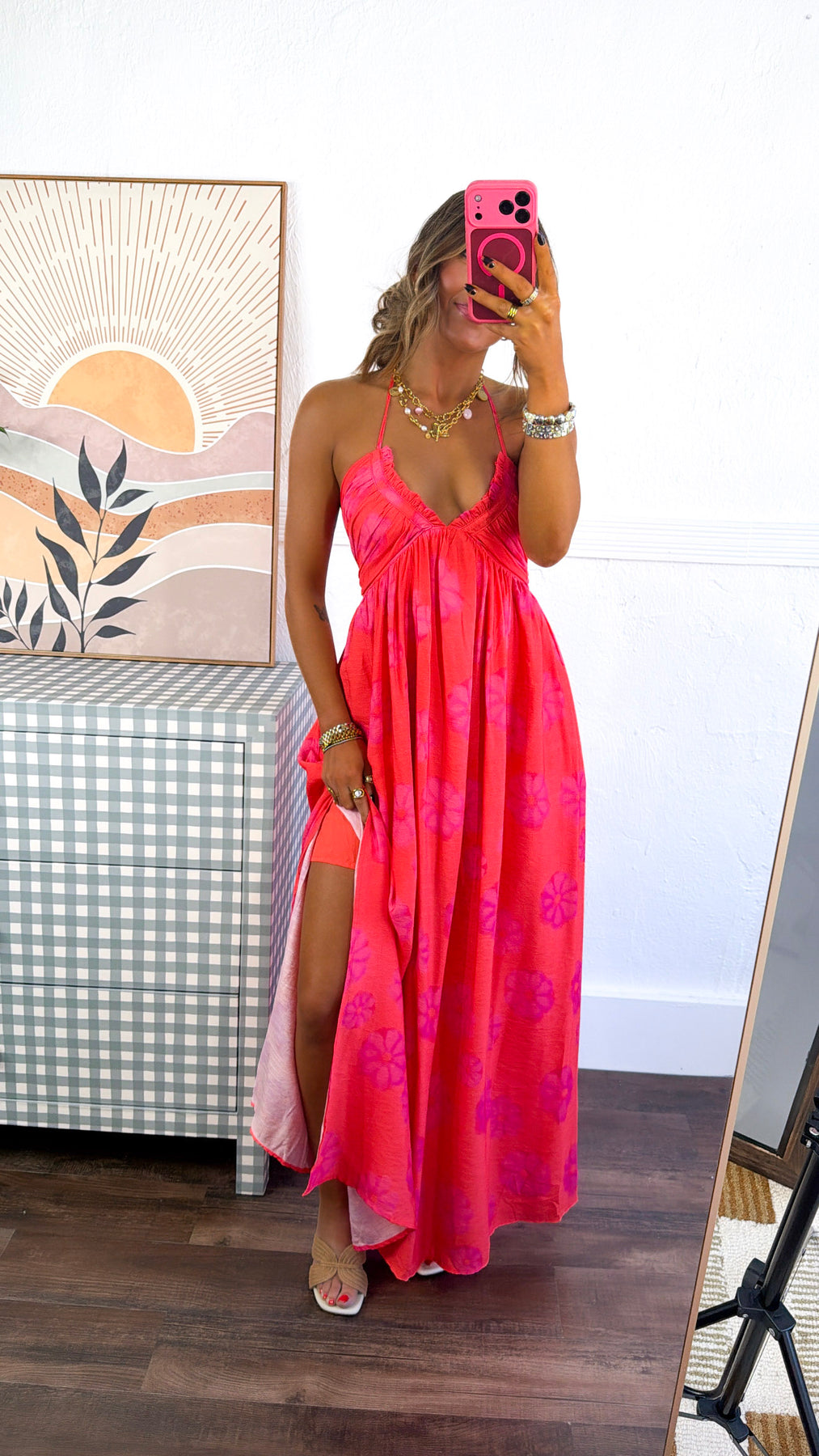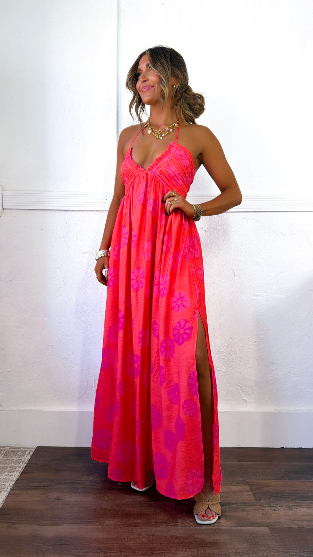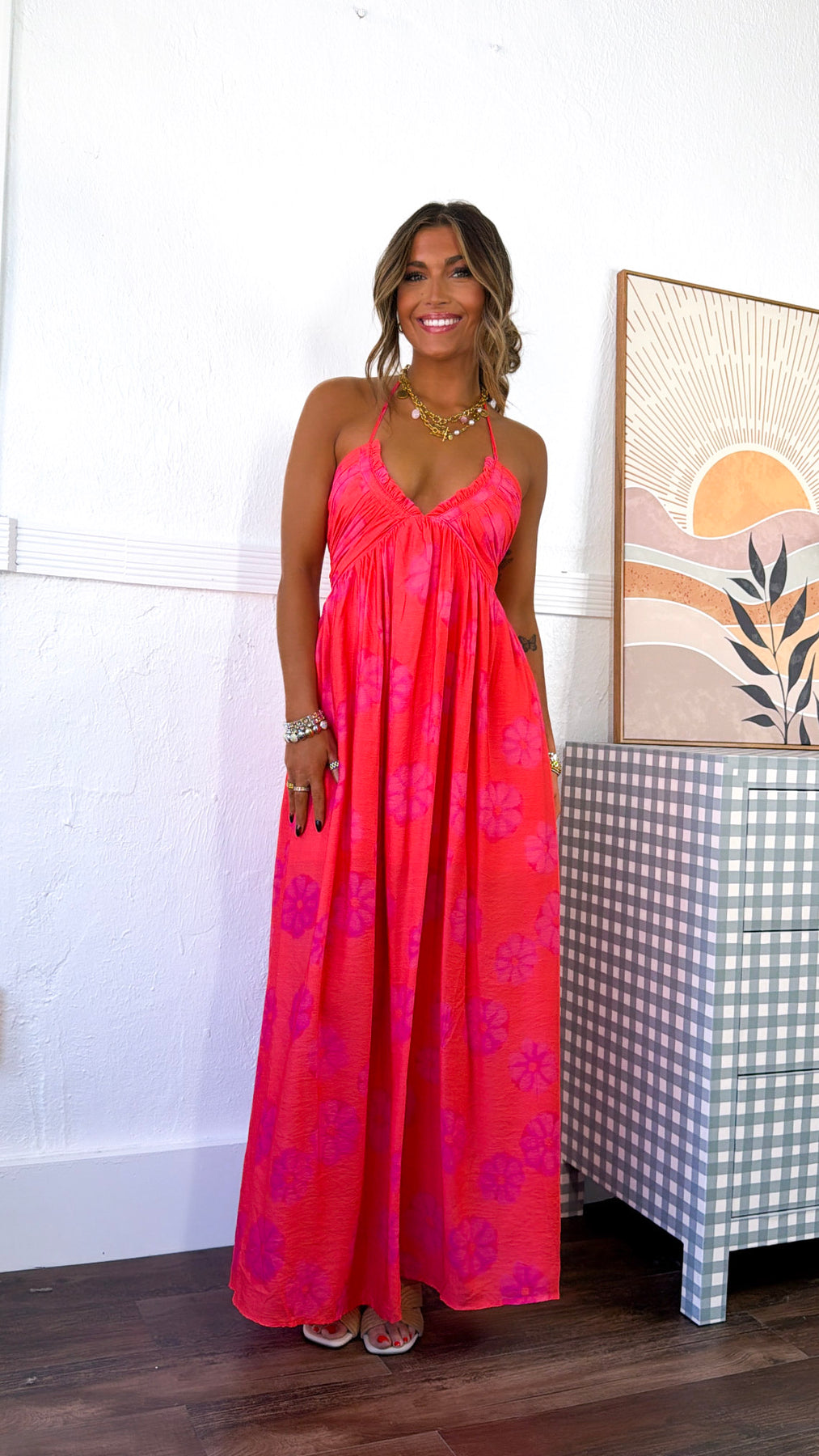 Turn heads and soak up the sunshine in the Panama Floral Halter Neck Dress a vibrant, feel good piece made for warm days and golden hour moments. Featuring a bold red orange hue with subtle tonal florals, this flowy maxi brings effortless drama with its breezy silhouette and flattering halter neckline. The open back with adjustable tie details adds a flirty finish you’ll love.
