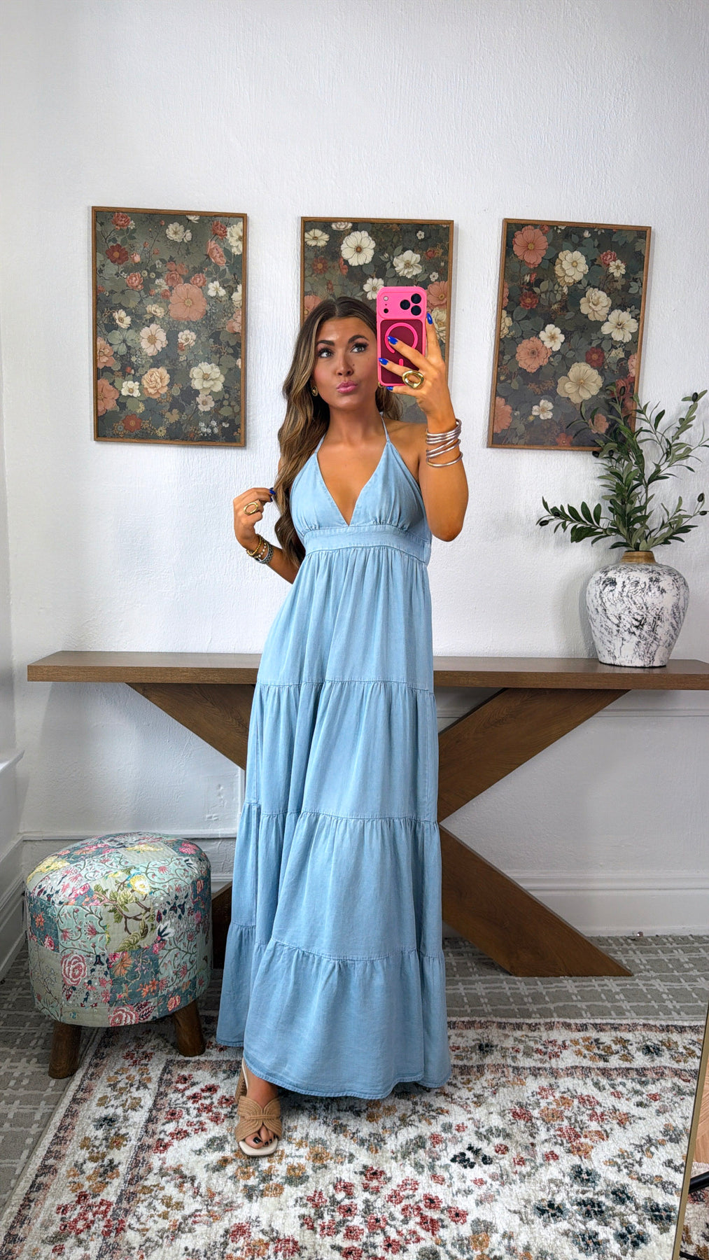 Easy, breezy, and effortlessly beautiful. The Sea Bloom Halter Maxi Dress is the perfect blend of relaxed elegance and coastal charm. Designed in a soft light chambray hue, this flowing maxi features a flattering halter neckline with a deep v-cut bodice and a comfortable empire waist that drapes into a tiered skirt for a graceful, feminine silhouette. Lightweight and airy, it’s the perfect dress for warm days, beach vacations, brunch dates, or summer events.