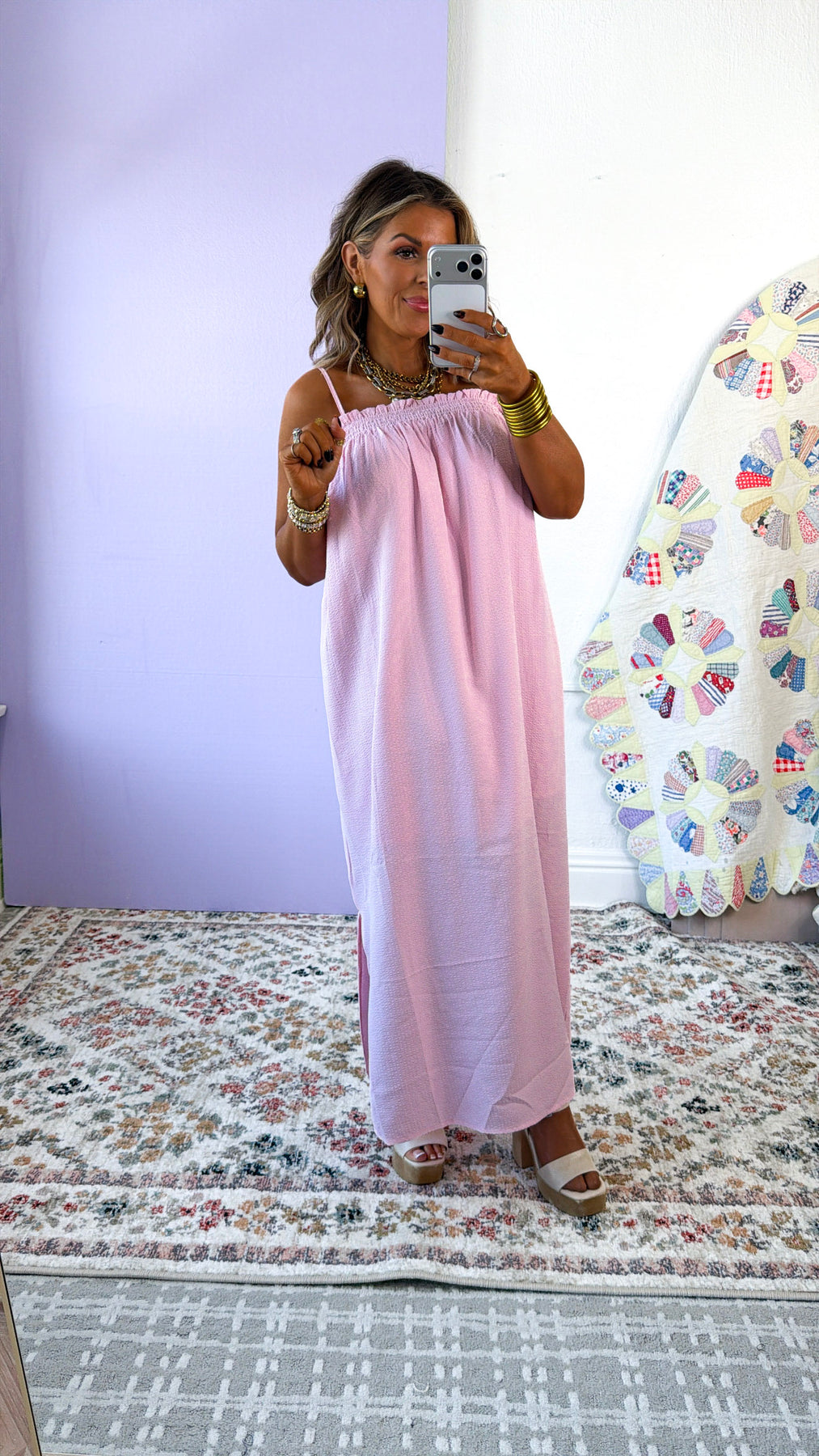 Soft, feminine, and effortlessly chic. The Sunrise Beach Maxi Dress in Blush/Pink is your perfect warm-weather staple. Designed with a breezy, relaxed silhouette and delicate textured fabric, this dress gives you that easy, throw-on-and-go feel while still looking polished. The smocked neckline and adjustable straps ensure a flattering, comfortable fit, while the subtle side slit adds just the right touch of movement and ease.
