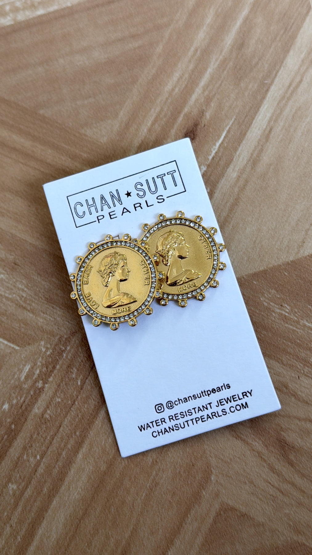 A meaningful message wrapped in timeless shine. The Love Each Other More Coin Earrings feature a classic gold coin design framed with delicate crystal accents for a subtle touch of sparkle. Etched with the heartfelt phrase “Love Each Other More,” these earrings are both stylish and sentimental perfect for everyday wear or gifting.