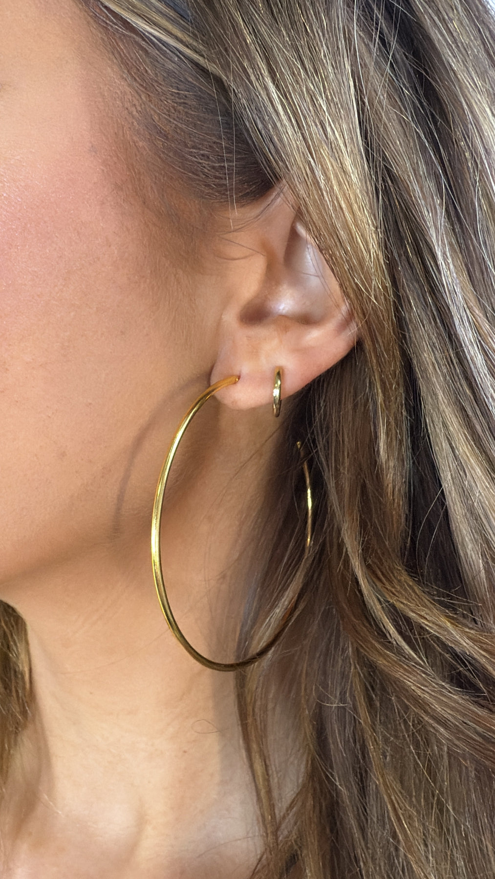 Simple, sleek, and endlessly stylish the Thin Large Hoop Earrings are a must have staple for any jewelry collection. Designed with a smooth gold-tone finish and a lightweight feel, these hoops add effortless polish to any look, from casual tees to dressed-up moments.