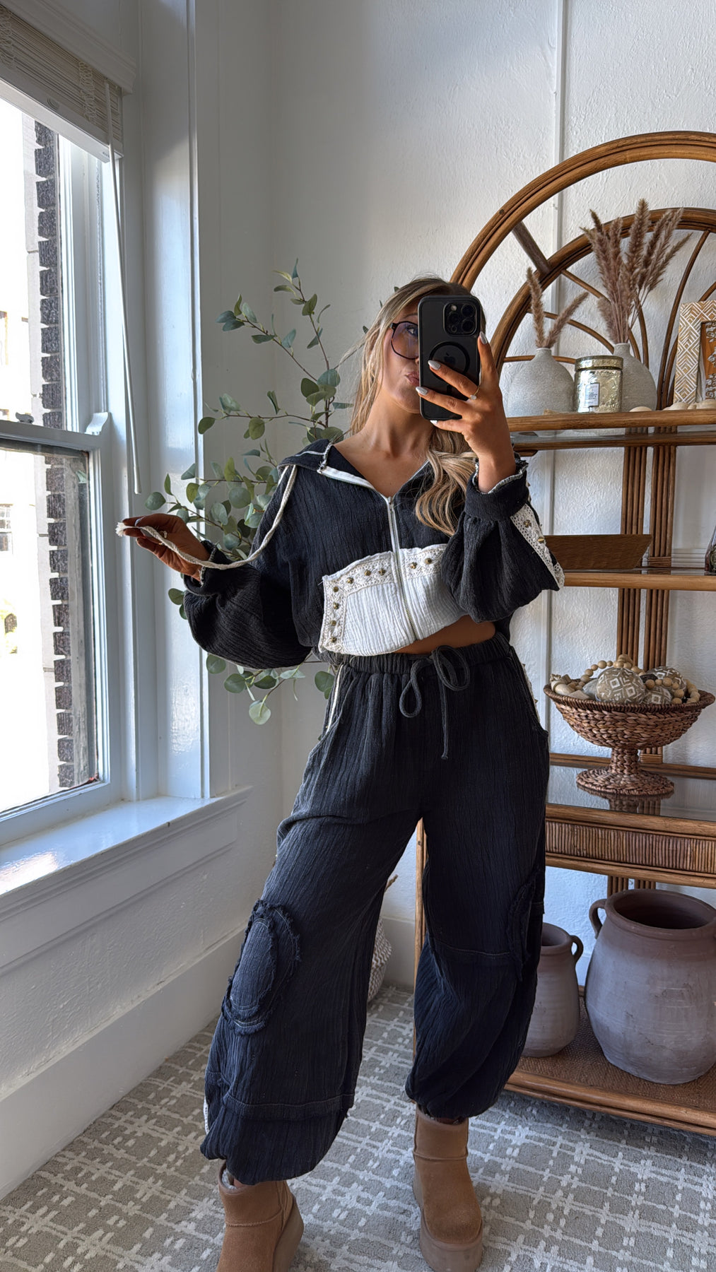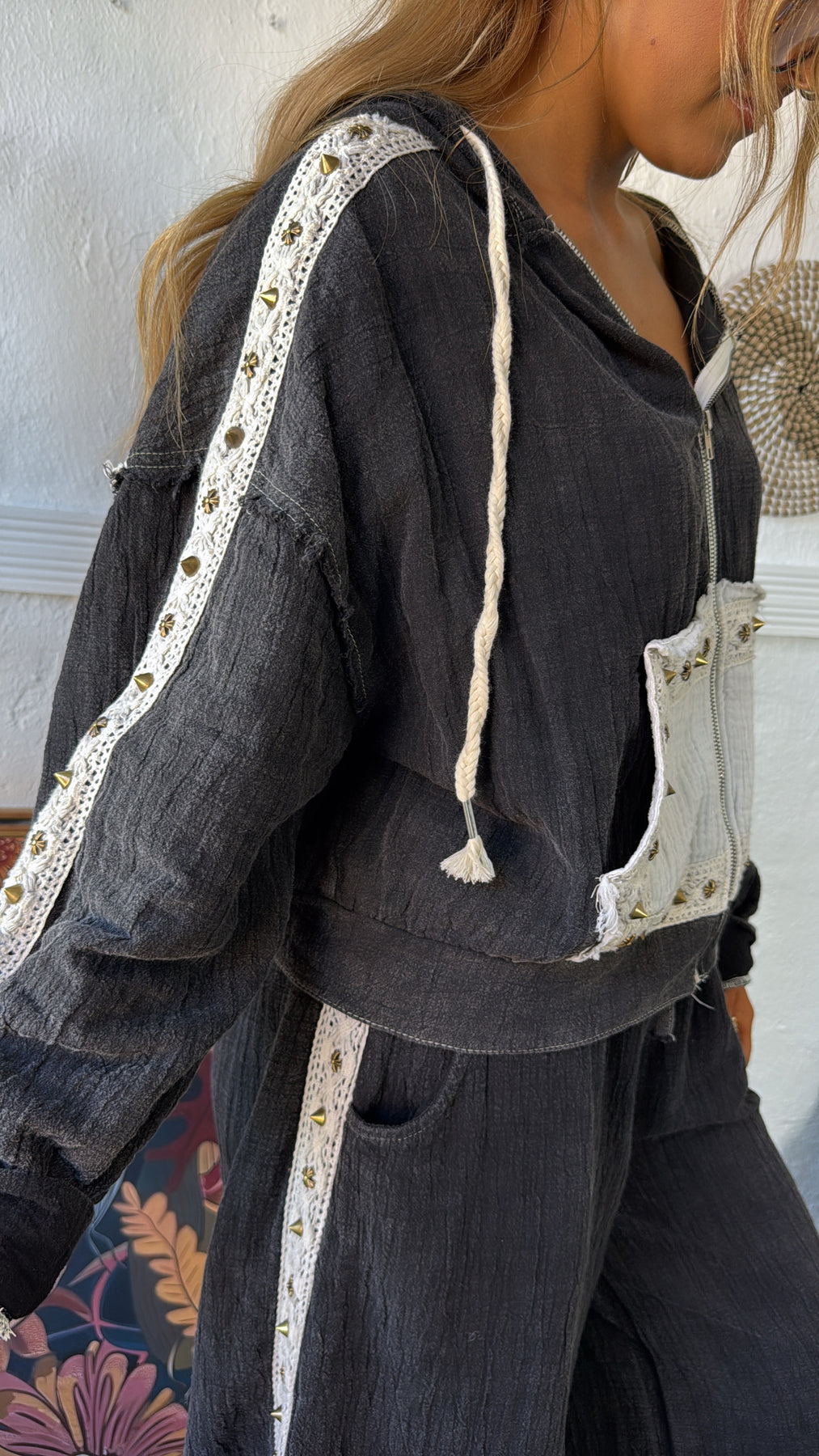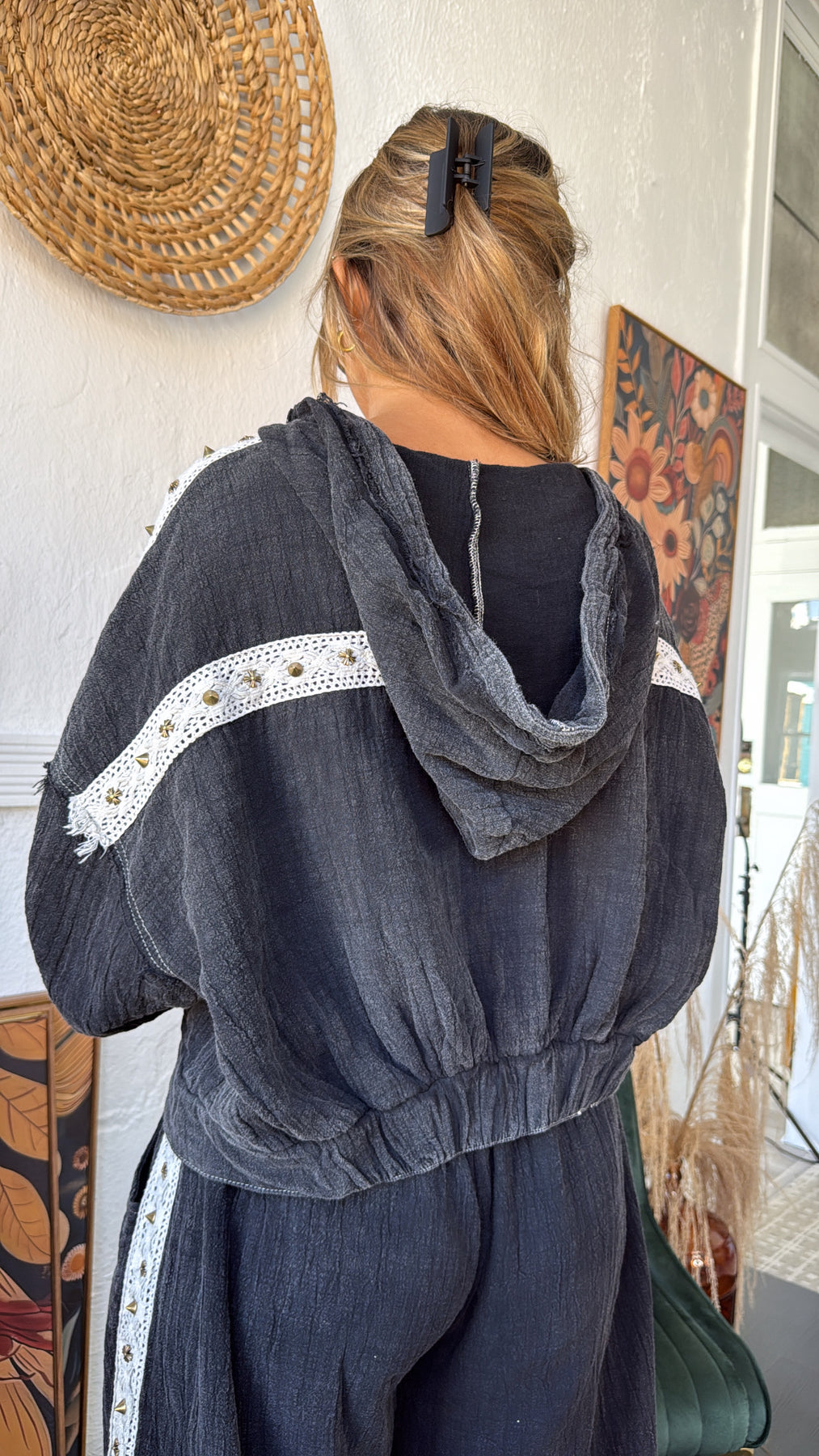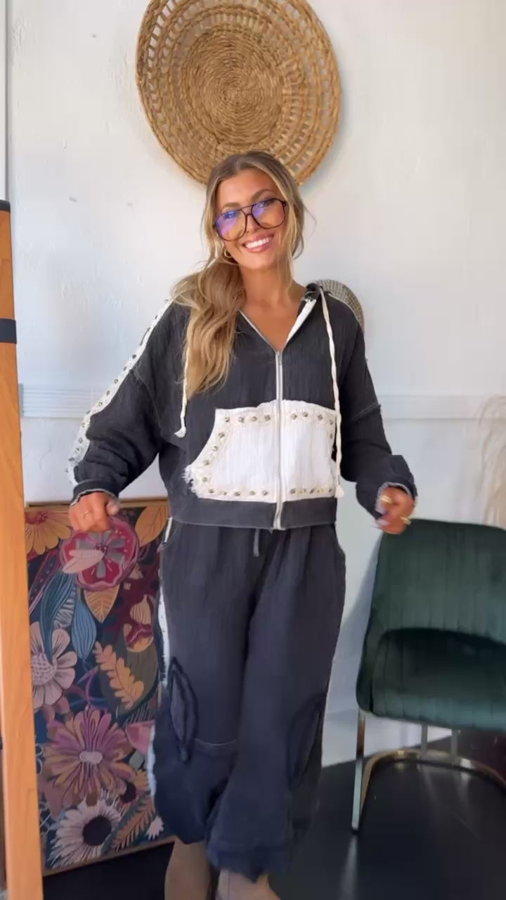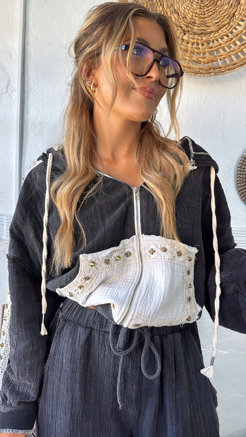 The Espresso Eclipse Zip Up is in a league of its own. Crafted from soft, garment-washed cotton with cream colorblock design and a mineral washed fabrication that gives this jacket a vintage feel. The unique charm detail elevates this piece to perfection while the classic zipper front and hooded neckline make it practical, while giving you a lived in look.