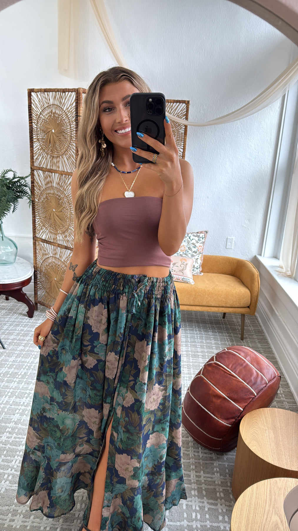 Make a gorgeous statement. Our Florence Floral Skirt in Retro Blue has a flattering elastic waistline with a functional button up front, large front slit, floral design, and an airy fabrication.