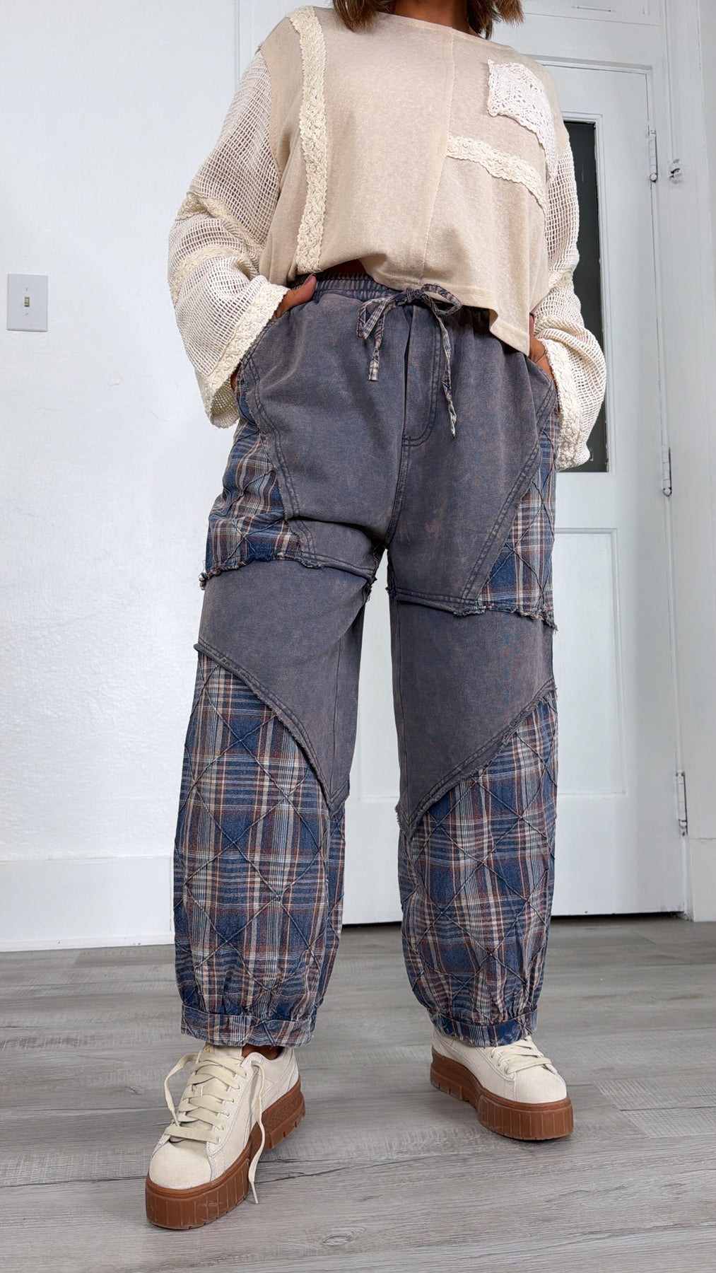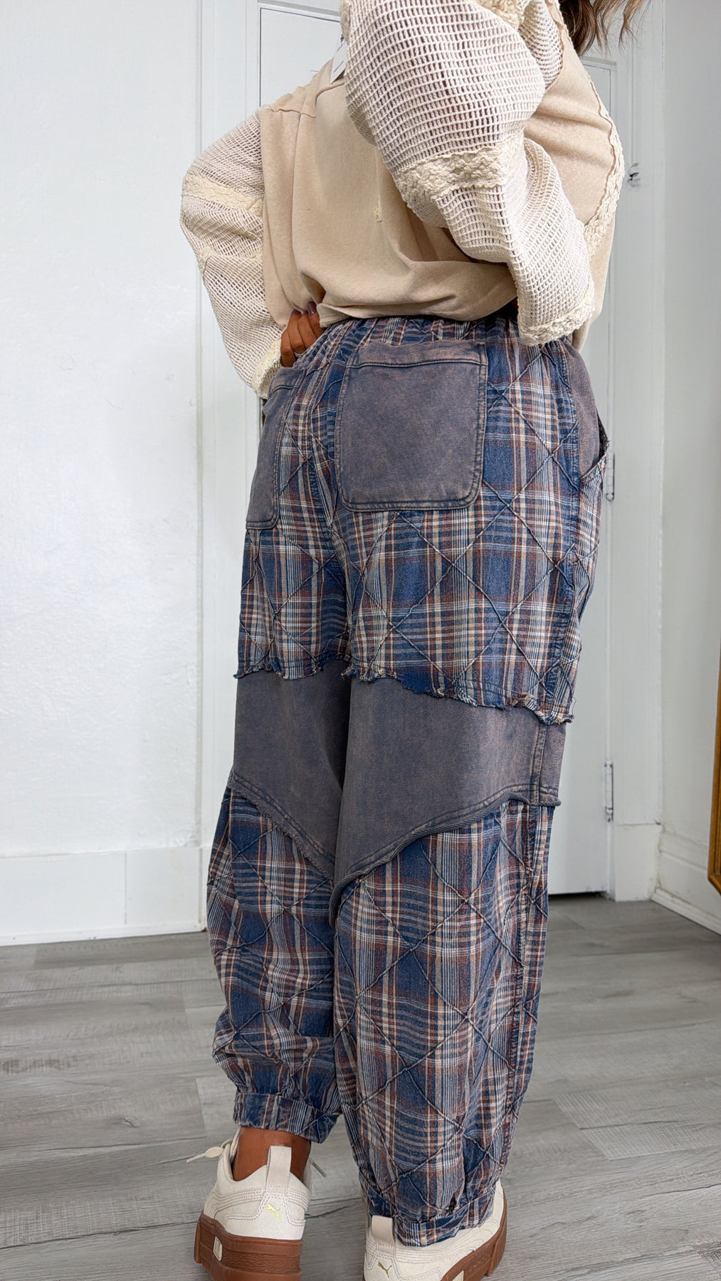 Designed for comfort with standout detail, the Tulip Trail Plaid Pant blends cozy textures with a relaxed, artsy vibe. Featuring a soft navy base with mixed plaid patchwork accents, these pants bring a perfectly worn-in feel with a unique, handcrafted look. The elastic waistband with adjustable drawstring keeps things comfortable, while the relaxed, slightly tapered leg adds an effortlessly cool silhouette.