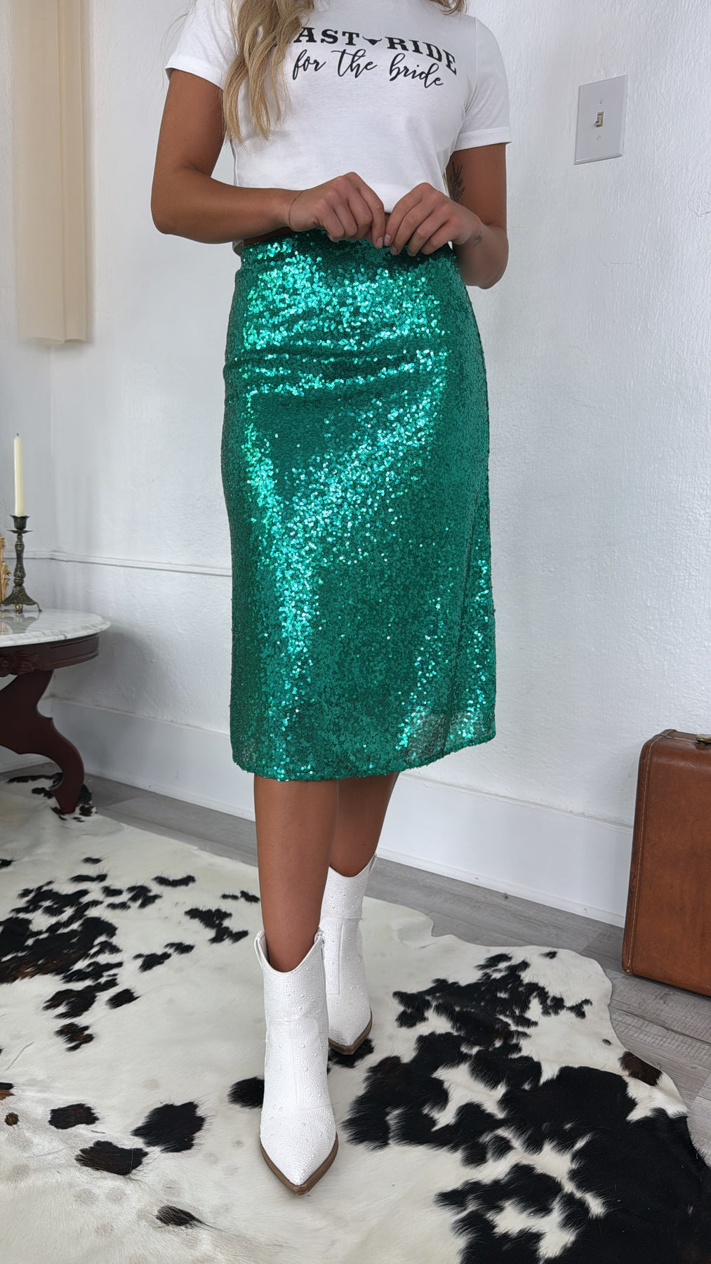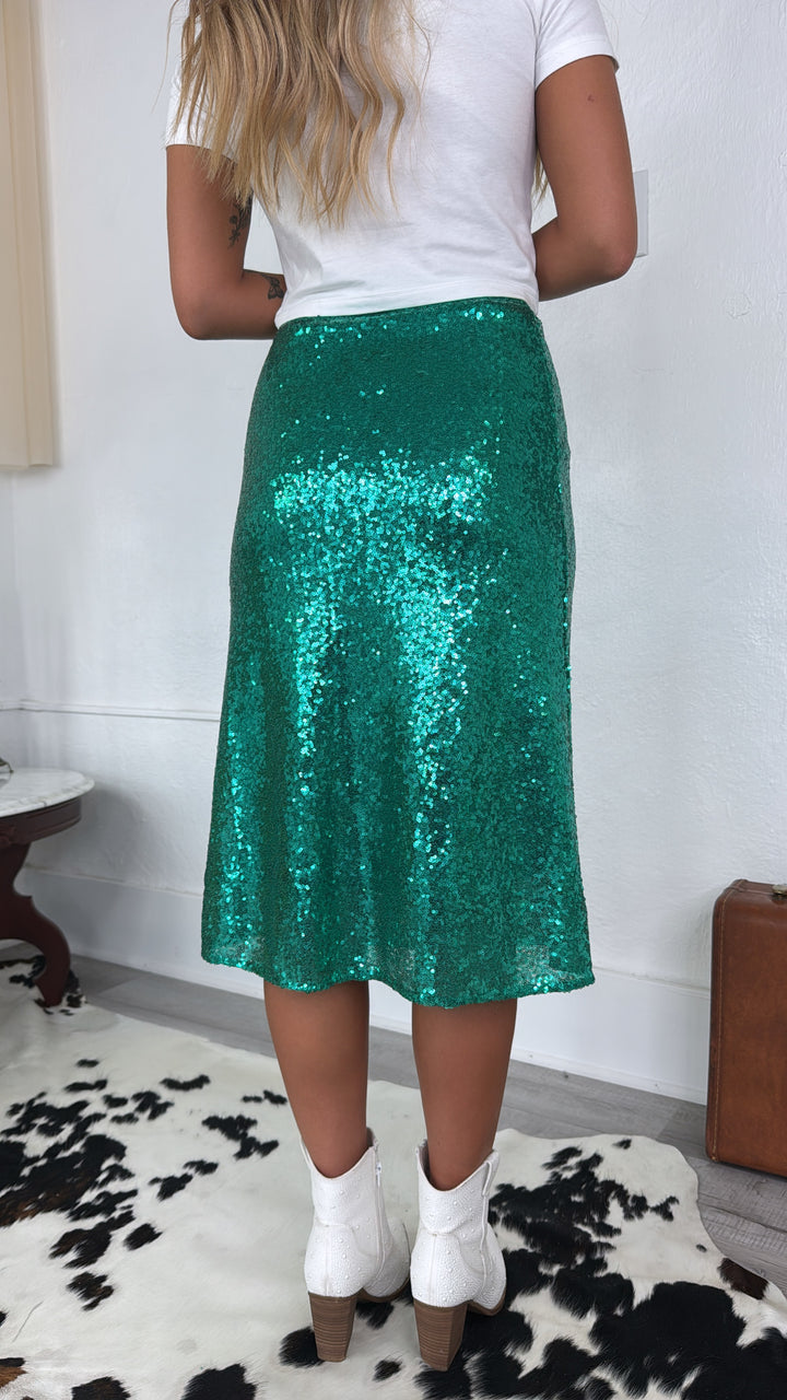The More of Glam Sequin Skirt offers a statement-centered look with sequin detailing throughout and an elevating midi length. Elevate your style with a sleek, polished look in this midi skirt.
