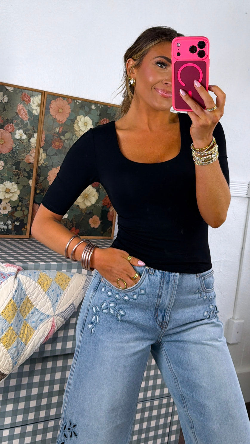 A timeless essential you’ll reach for again and again. The Double Layered 3/4 Sleeve Tee in black is designed for a sleek, flattering fit with all-day comfort.