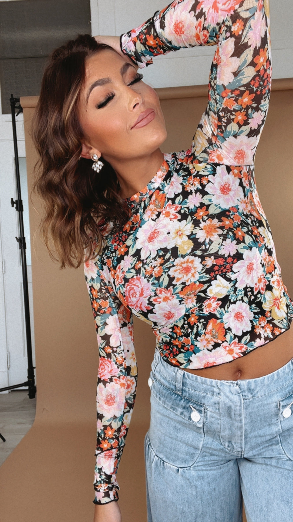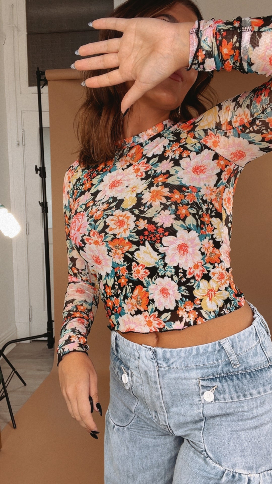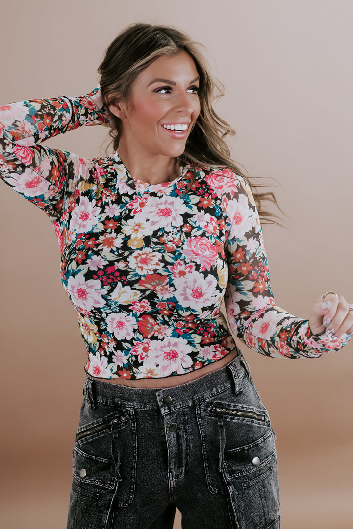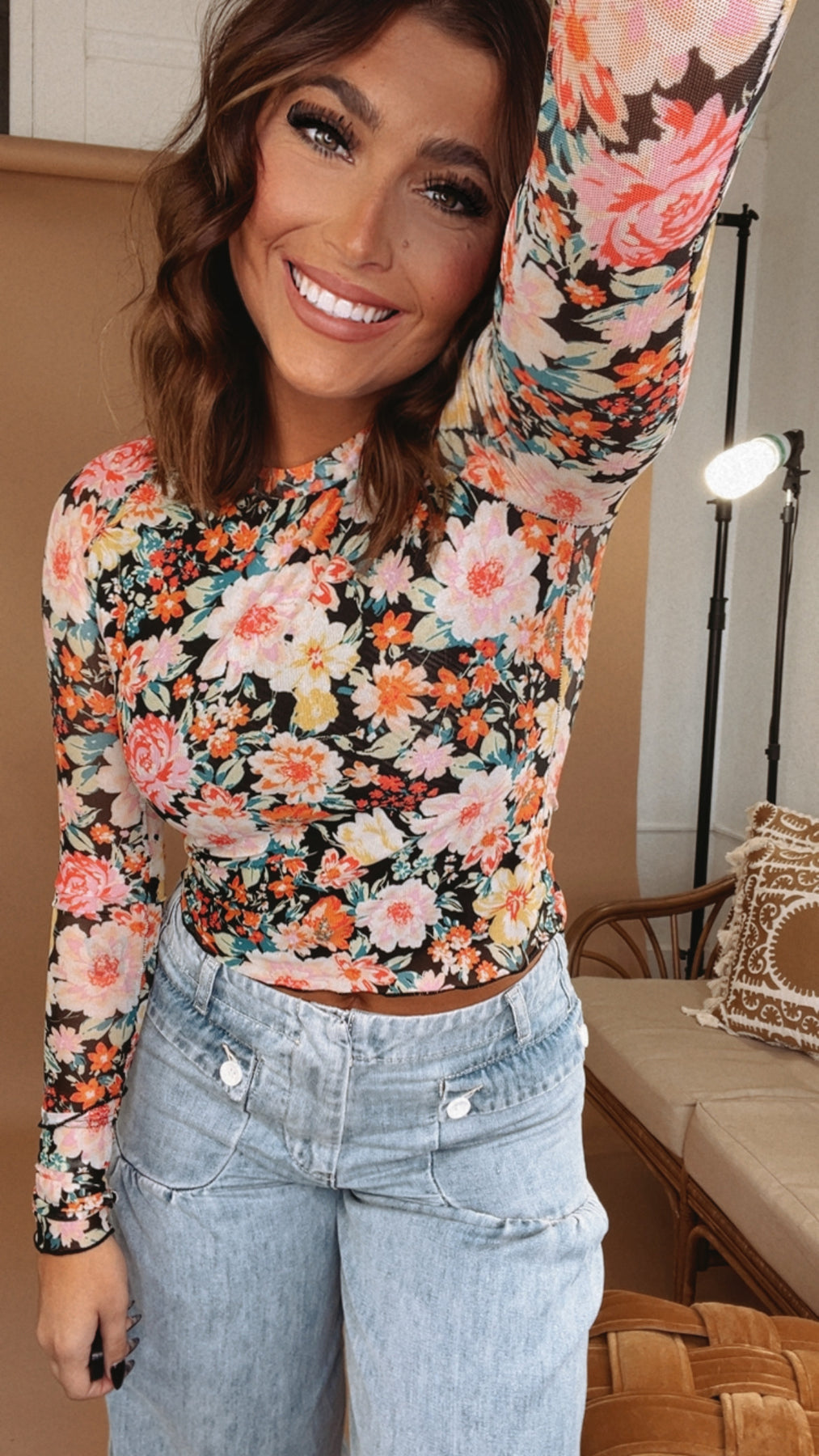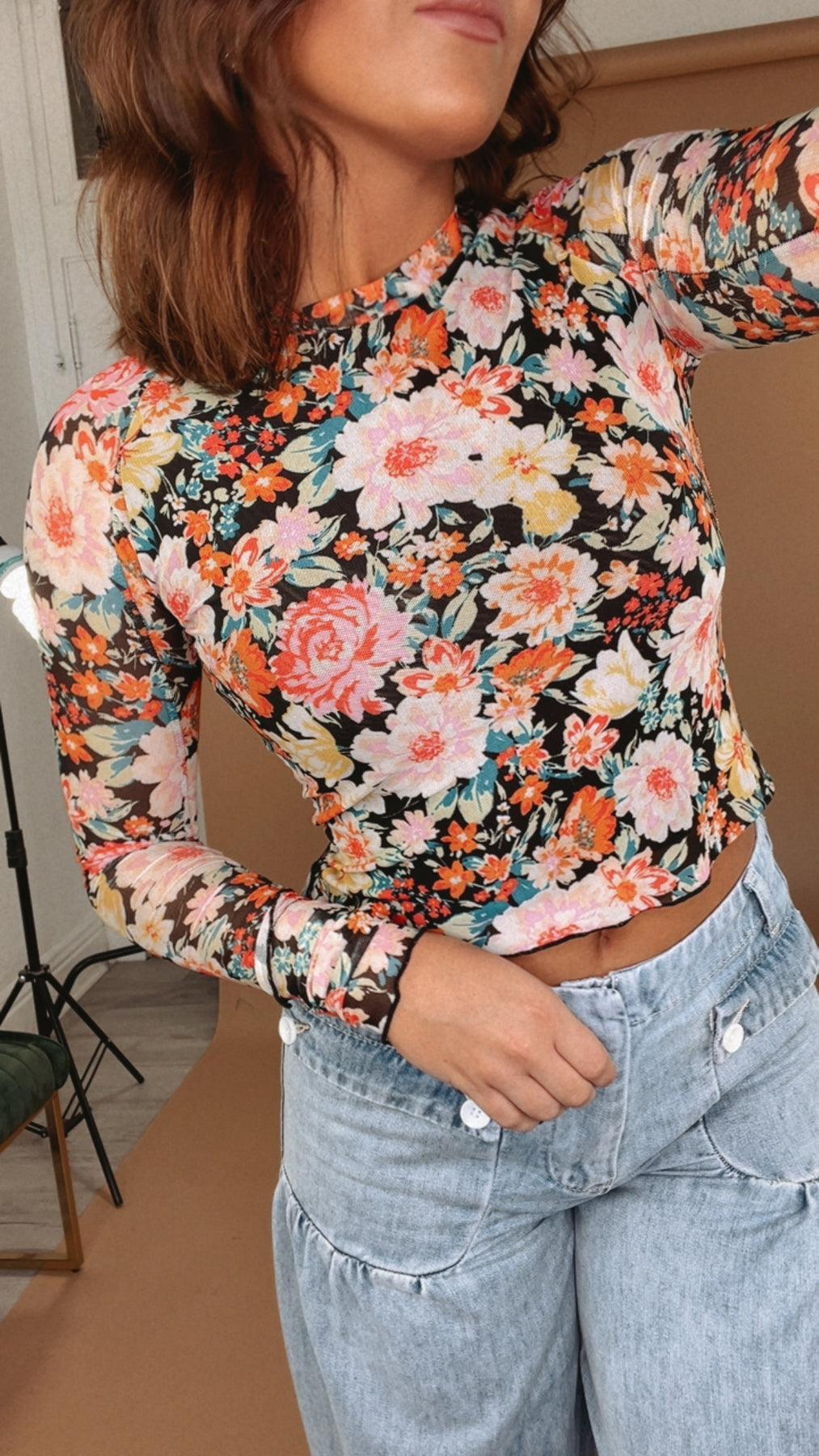 This top combines elegance and edge with its intricate floral mesh detailing and classic black hue. The long sleeves add a touch of elegance, making it suitable for both casual and dressier occasions.