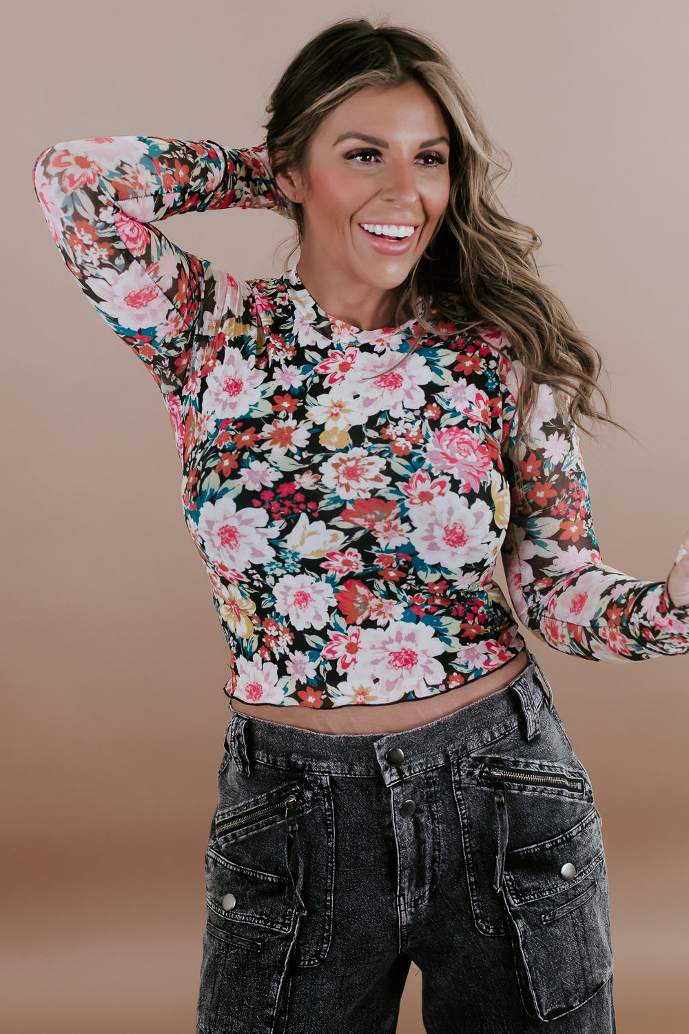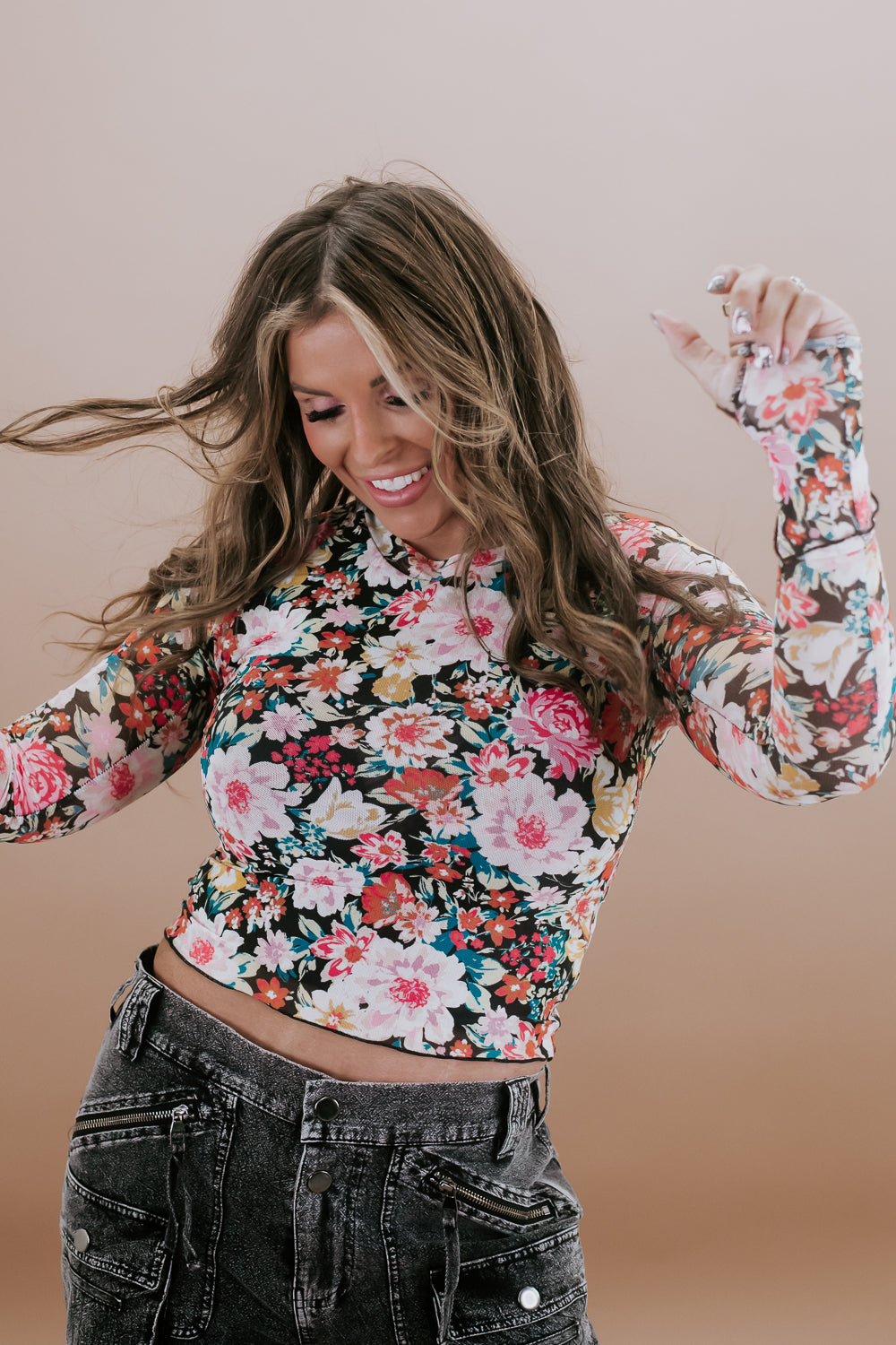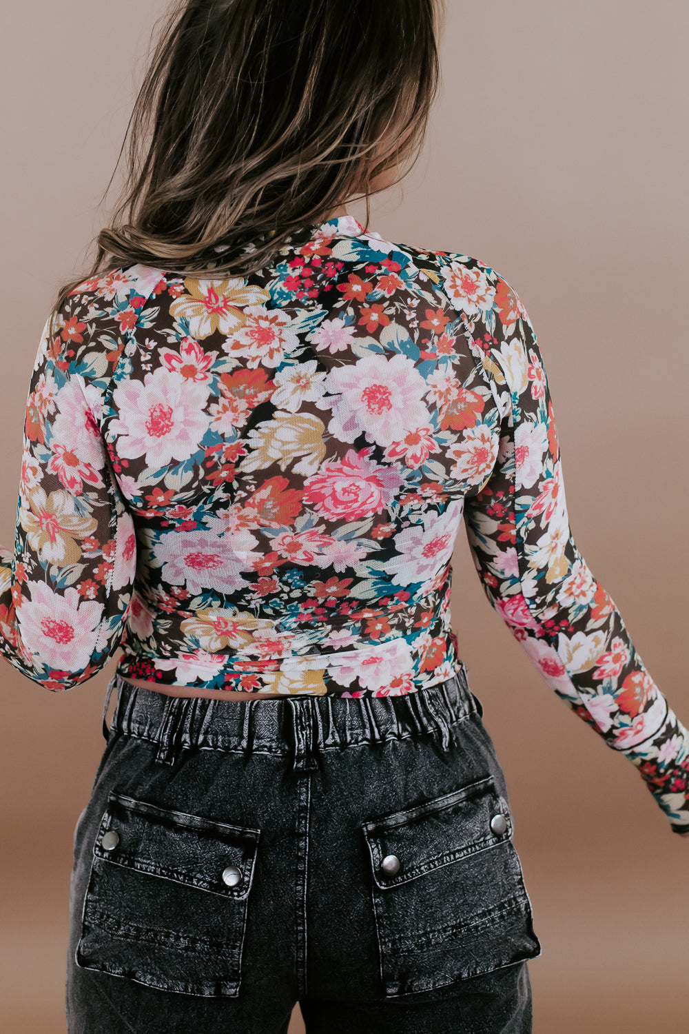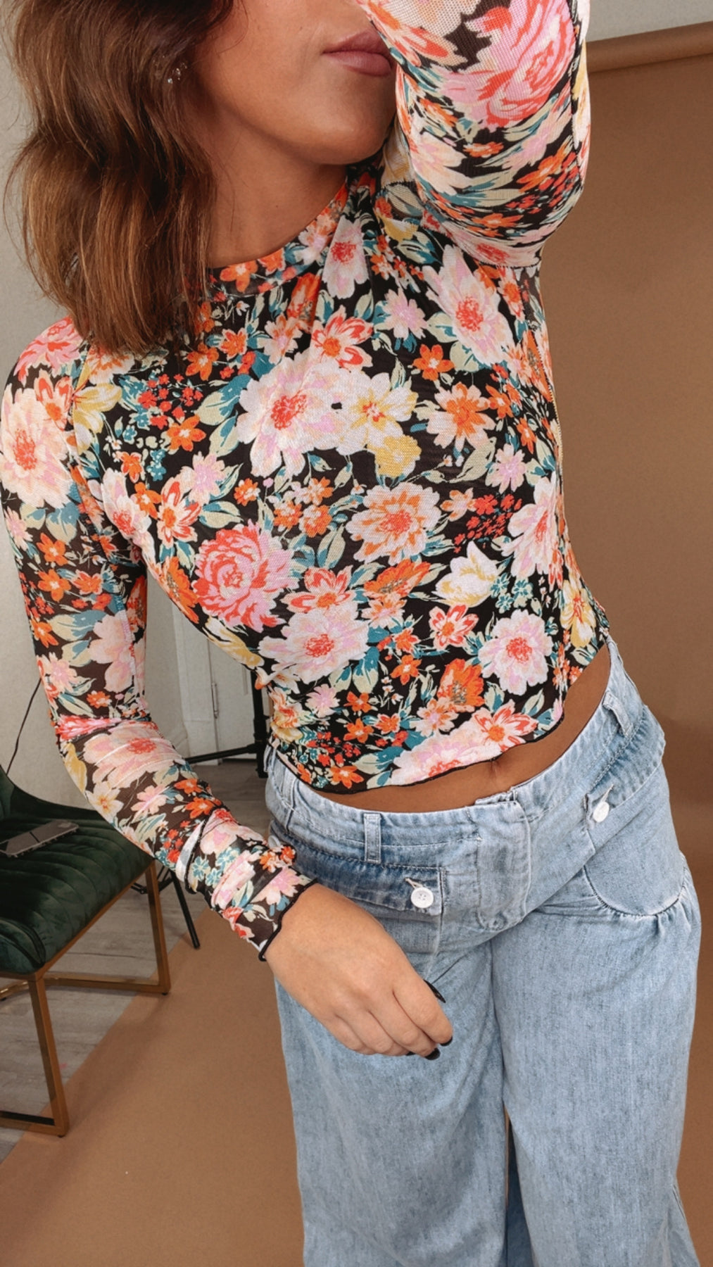 This top combines elegance and edge with its intricate floral mesh detailing and classic black hue. The long sleeves add a touch of elegance, making it suitable for both casual and dressier occasions.