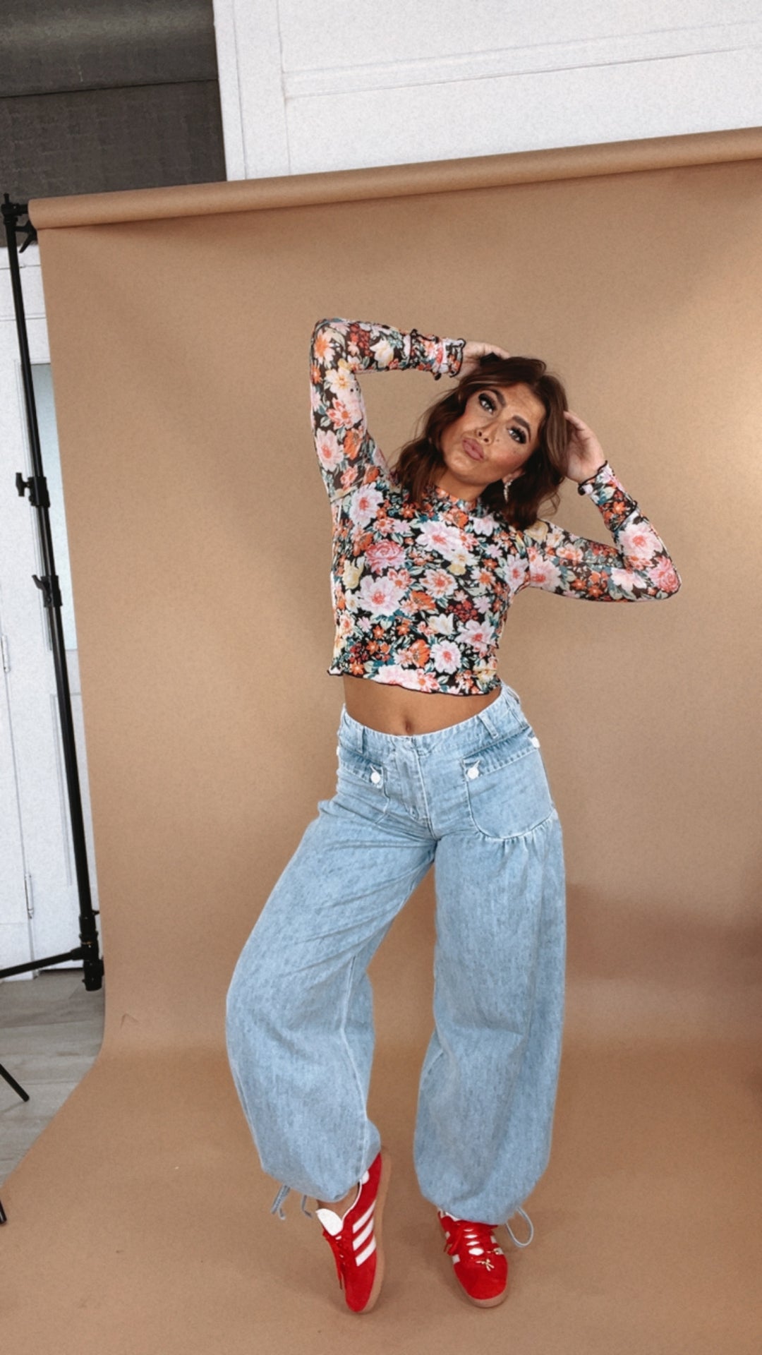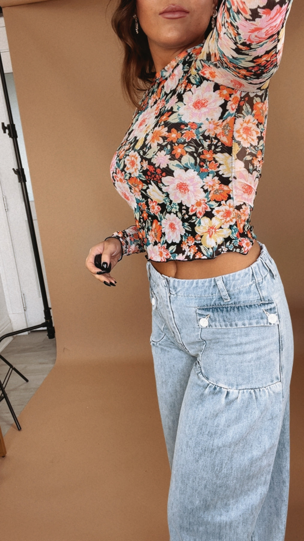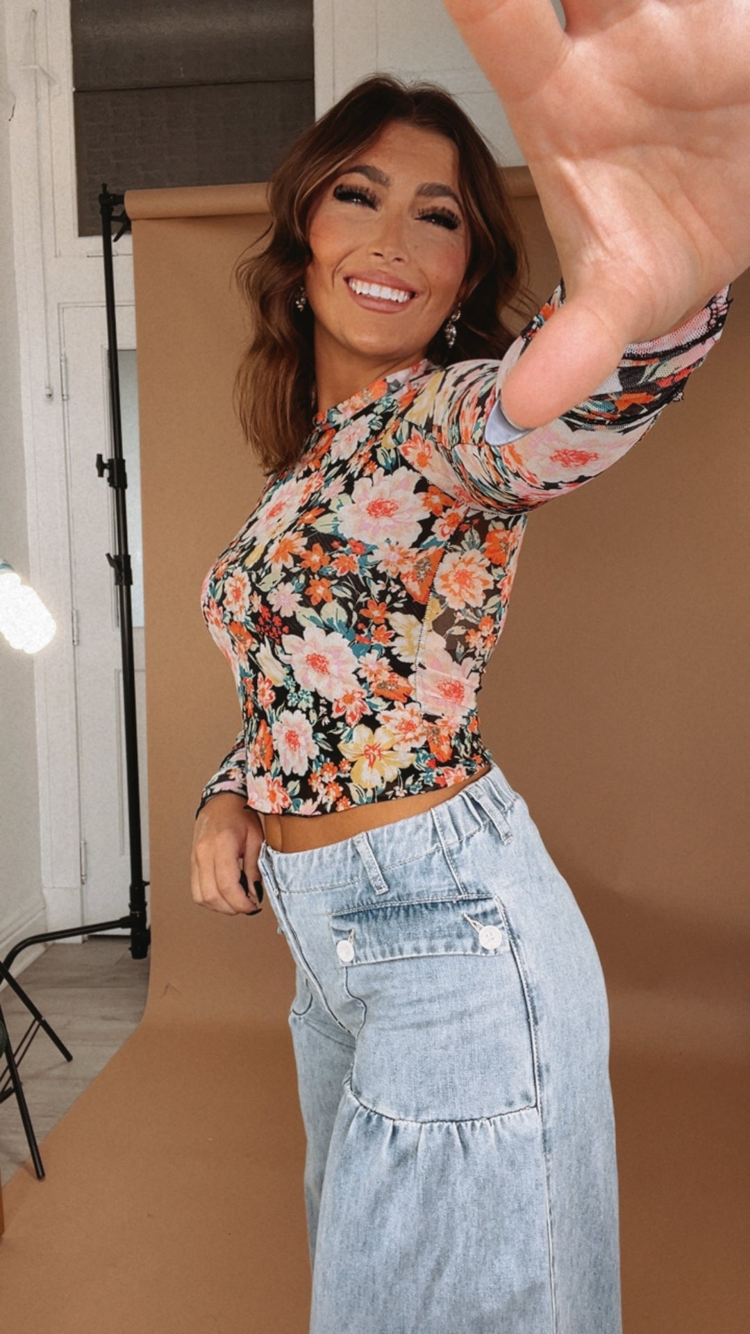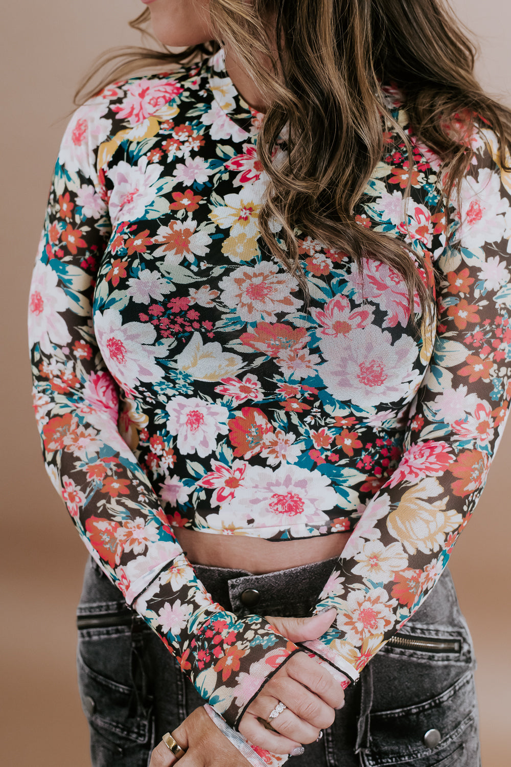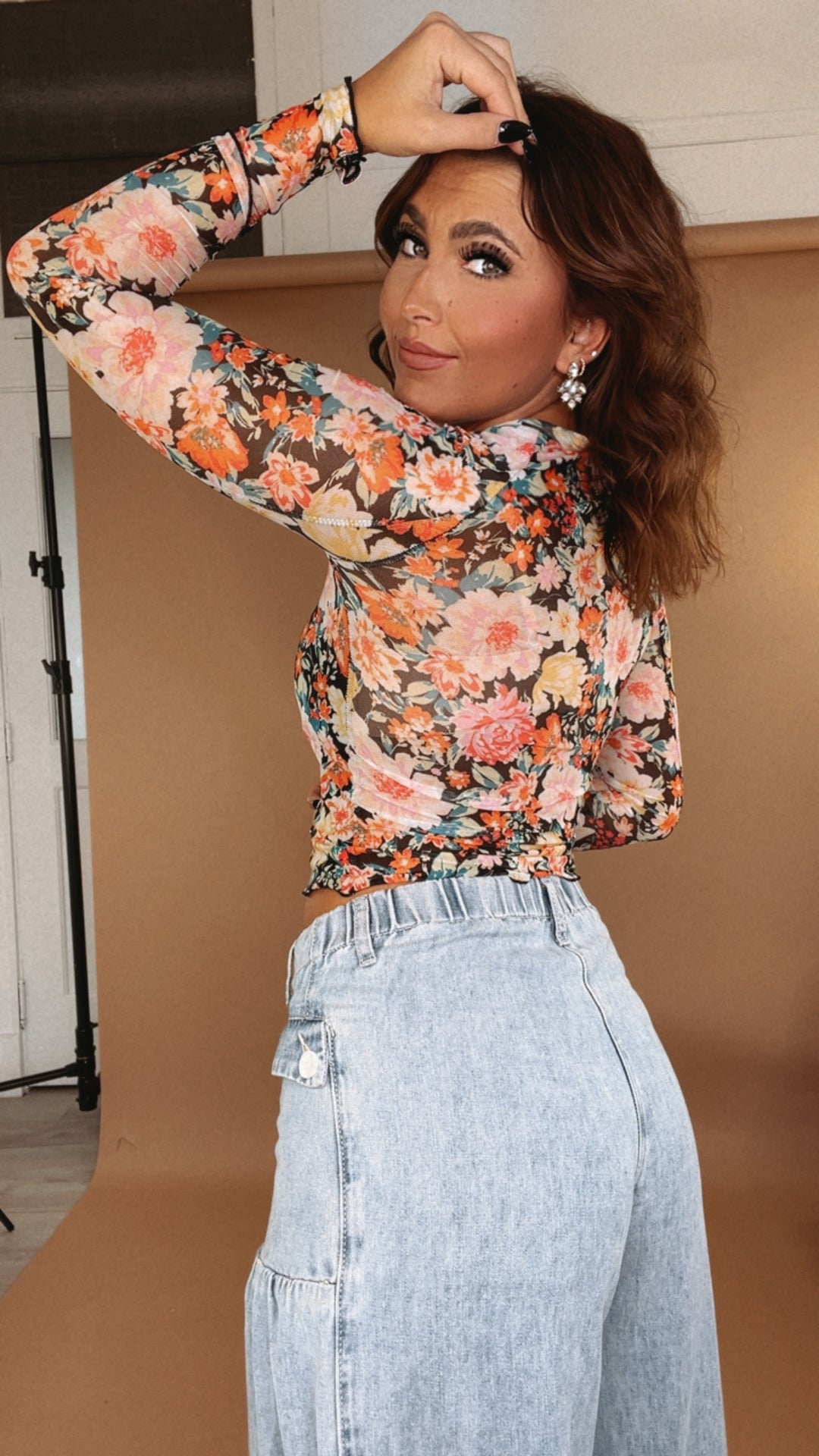 This top combines elegance and edge with its intricate floral mesh detailing and classic black hue. The long sleeves add a touch of elegance, making it suitable for both casual and dressier occasions.