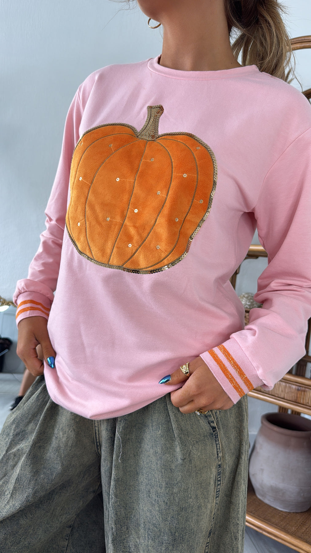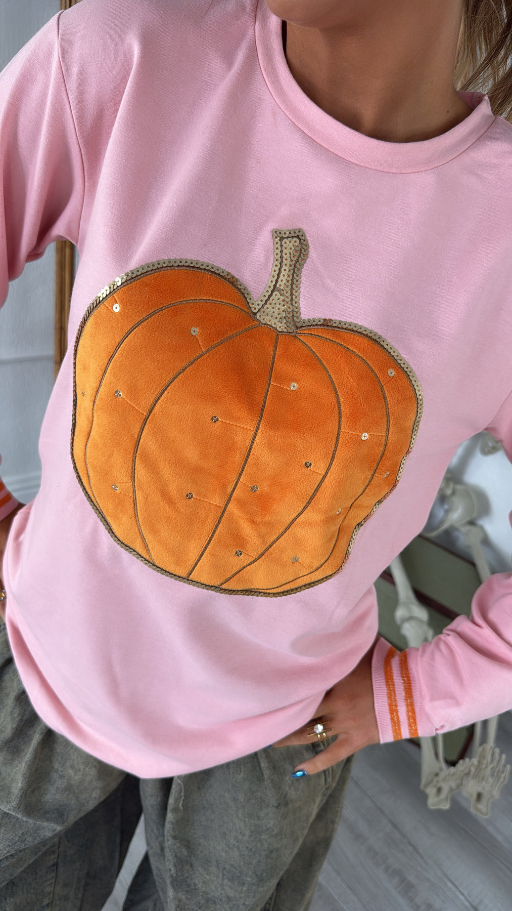 Embrace the Autumn season in our Pumpkin Patch Cutie Crewneck - This cozy crewneck features an adorable pumpkin graphic with sequin details throughout. The pink colored body gives this piece the right amount of feminine pop.