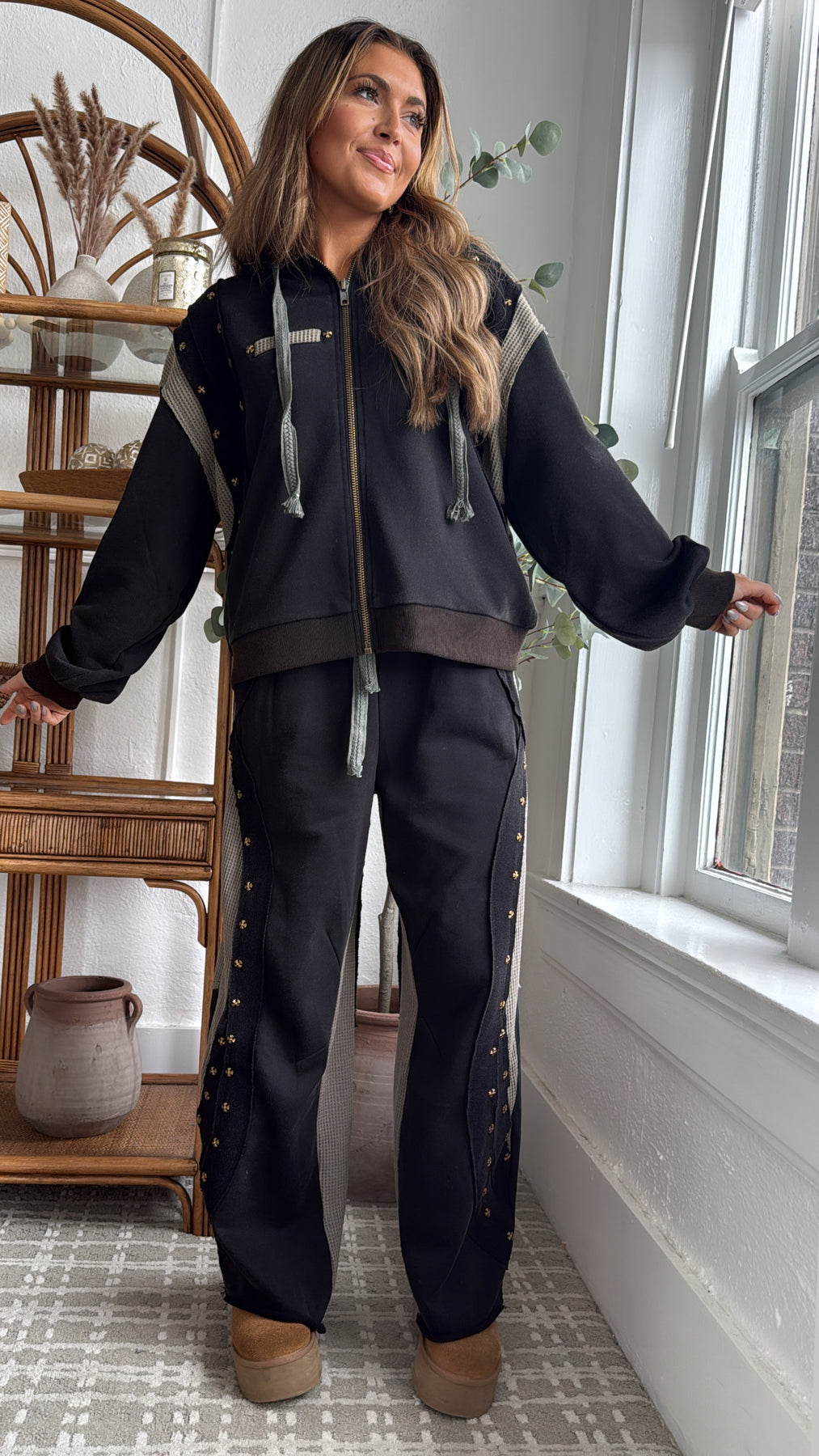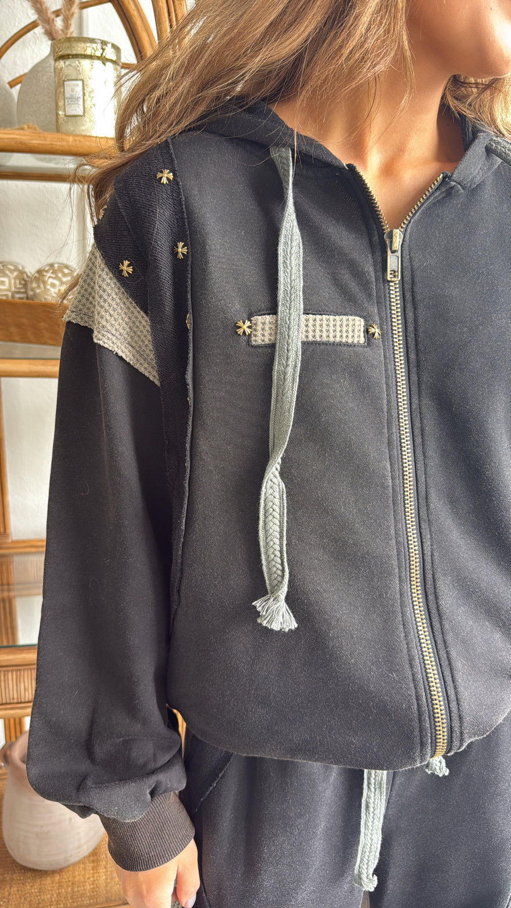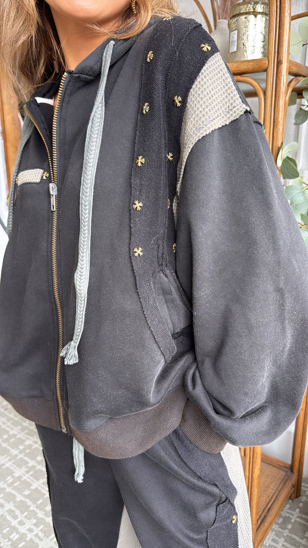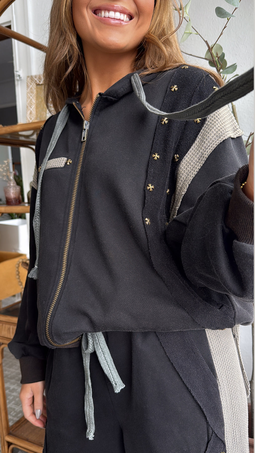 Gold-tone star studs add the perfect touch of edgy sparkle along the shoulders and chest, while the braided drawstrings give it a relaxed, boho-inspired vibe. Finished with balloon sleeves and ribbed cuffs for a lived-in, comfy feel, this jacket elevates your casual outfits with zero effort.