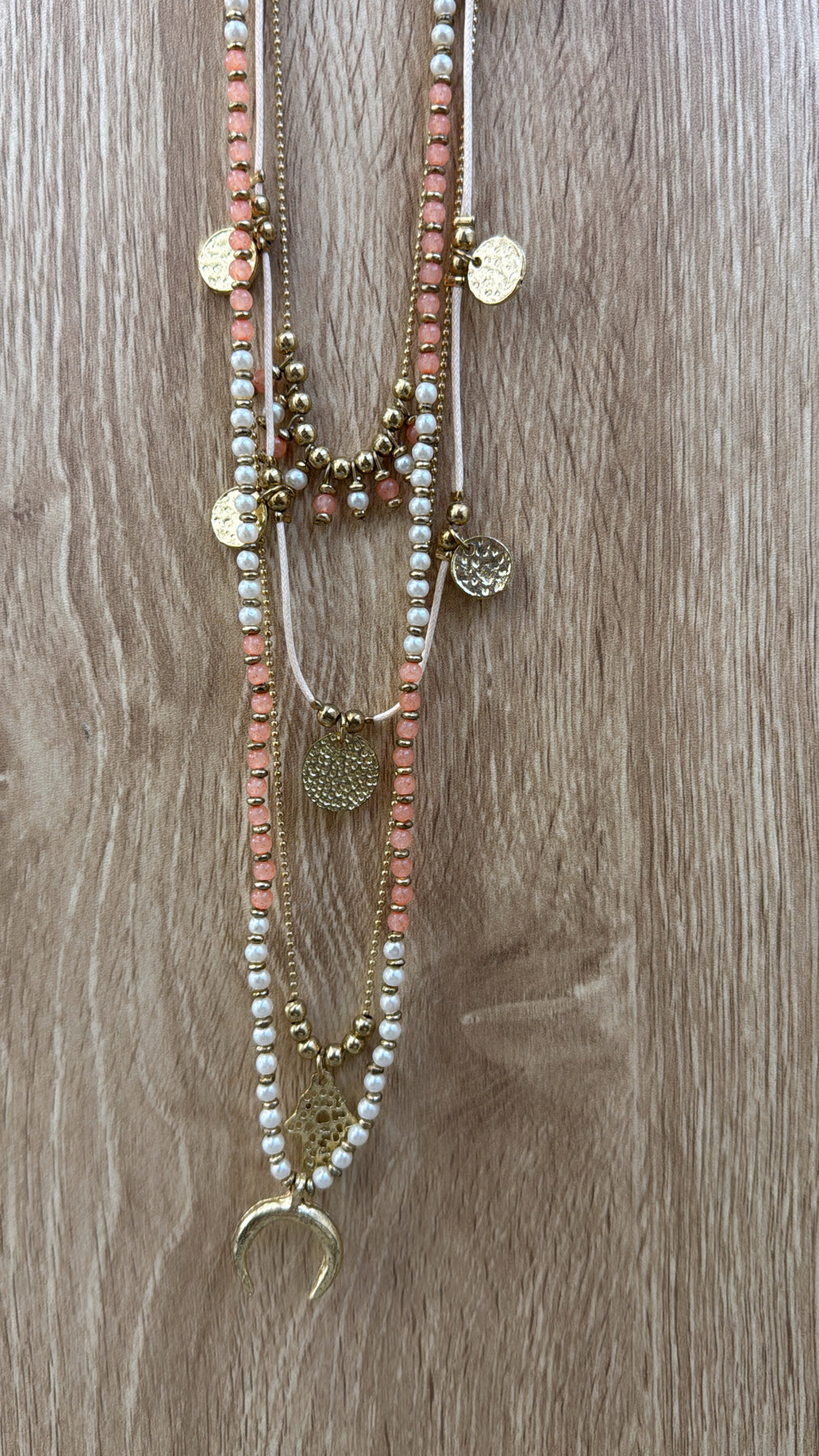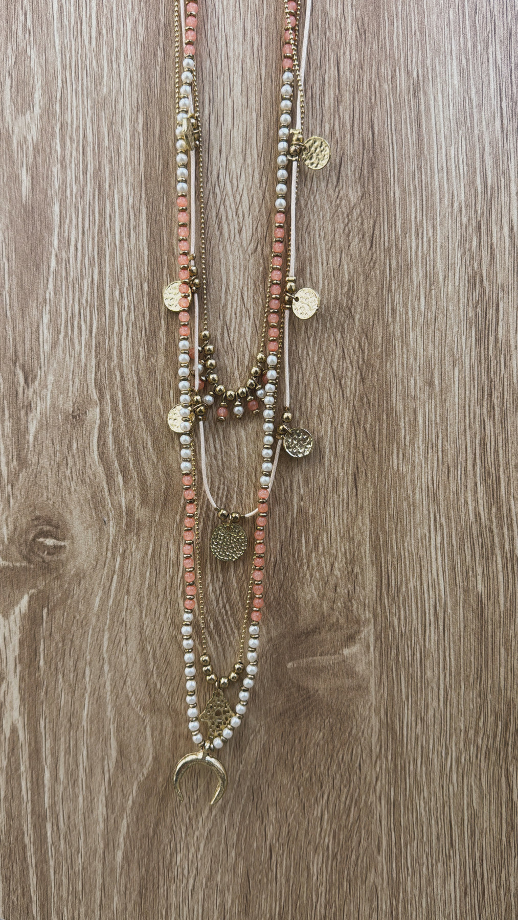 This stunning layered necklace brings effortless boho-glam to your look. With coral, ivory, and pearl-inspired beading, hammered gold accents, and eye-catching charms, it’s the ultimate statement piece for everything from flowy dresses to casual knits.