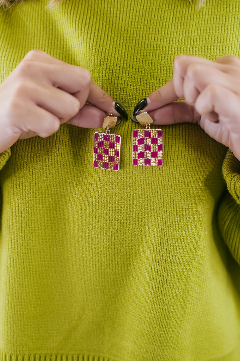 Checkered Seedbead Rectangle Earring, Fuchsia/Gold