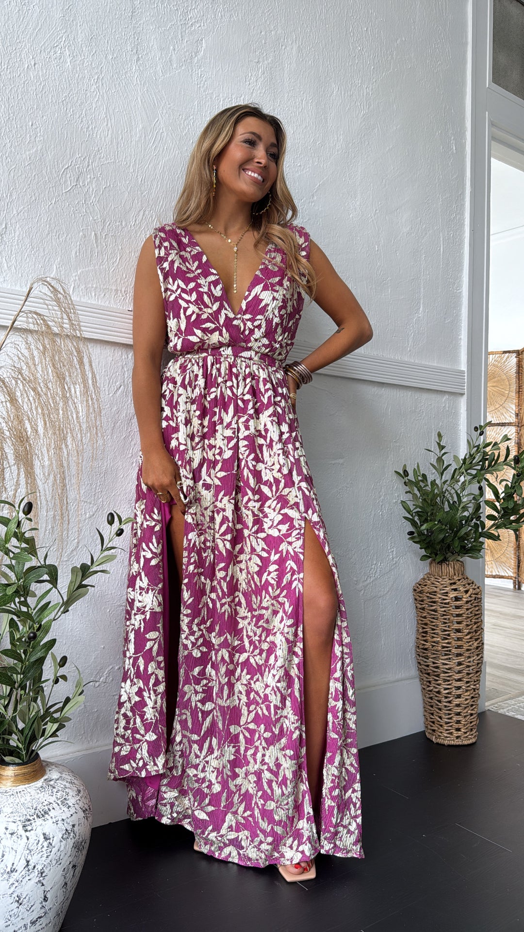 Rosaline Plunge Maxi Dress, Magenta/Gold