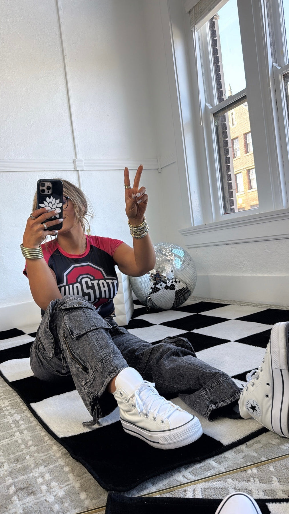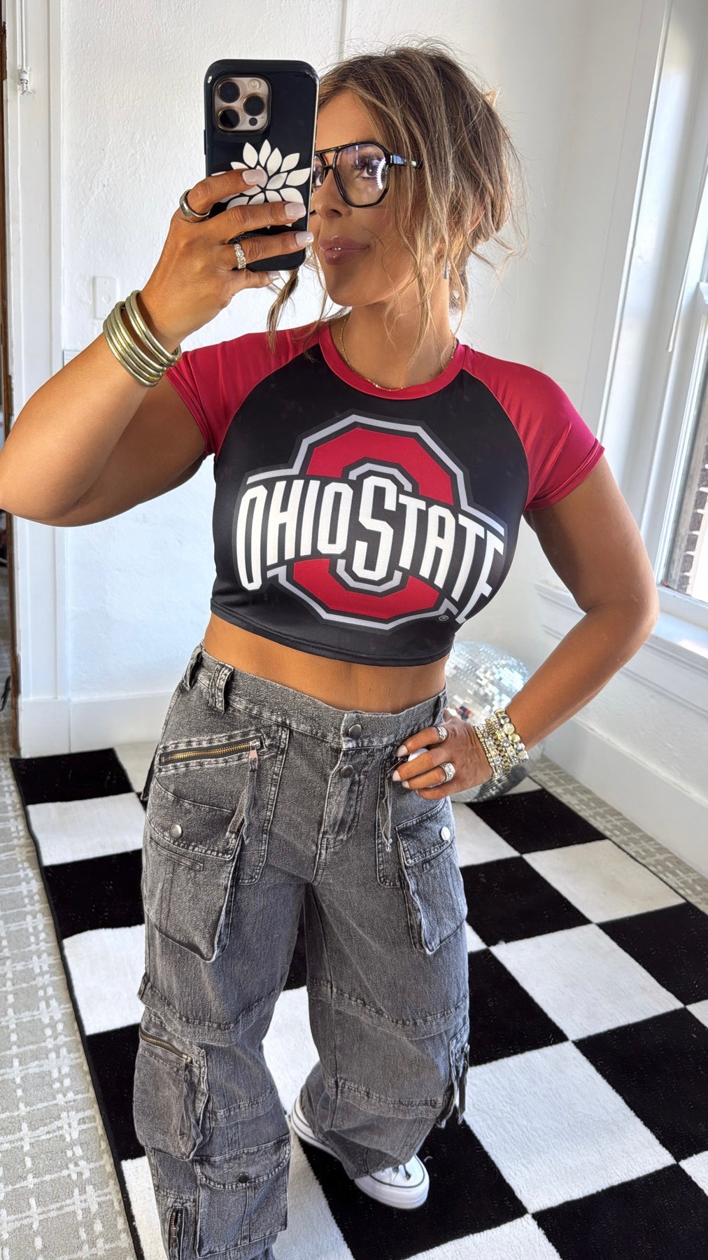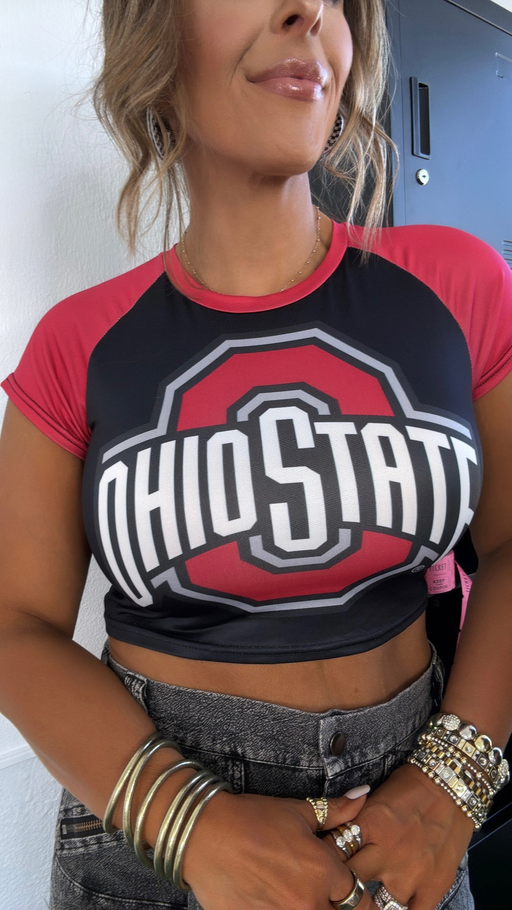 Take your game day style to the next level with our Ohio Crop Baby Tee, perfect for college game day! Its stretchy fabric makes it the perfect option for a comfy game-day look.