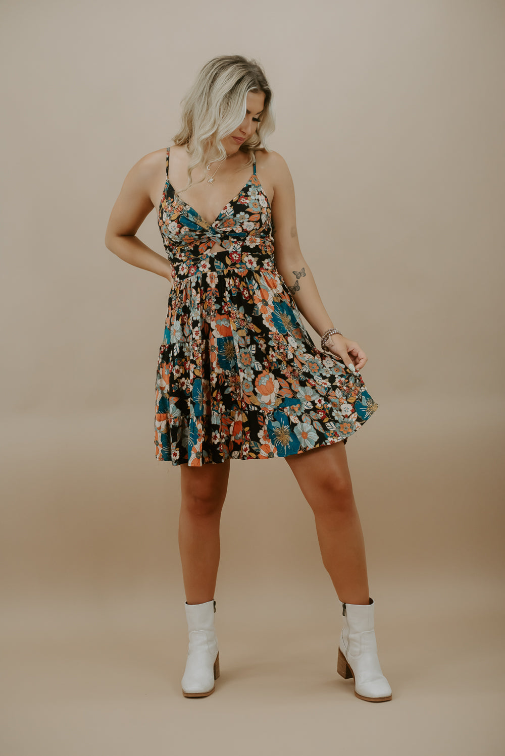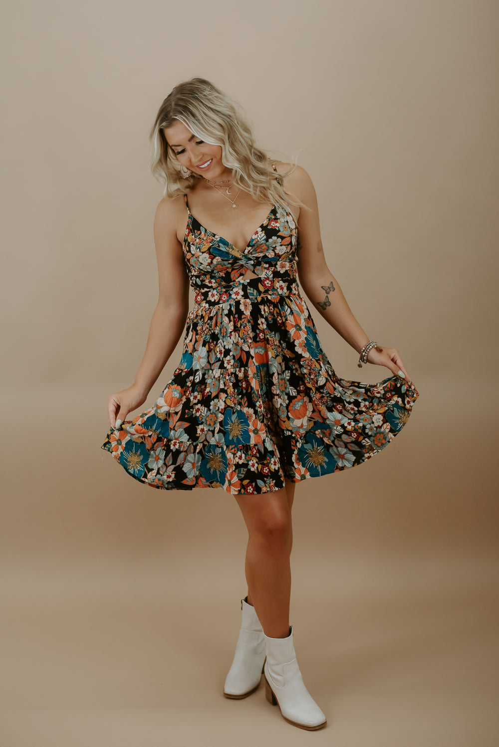 Della Dainty Floral Bubble Sleeve Mini Dress, Fall Black Multi