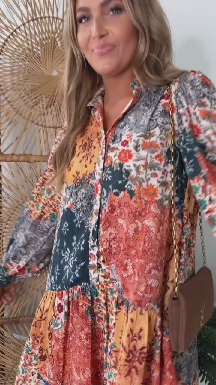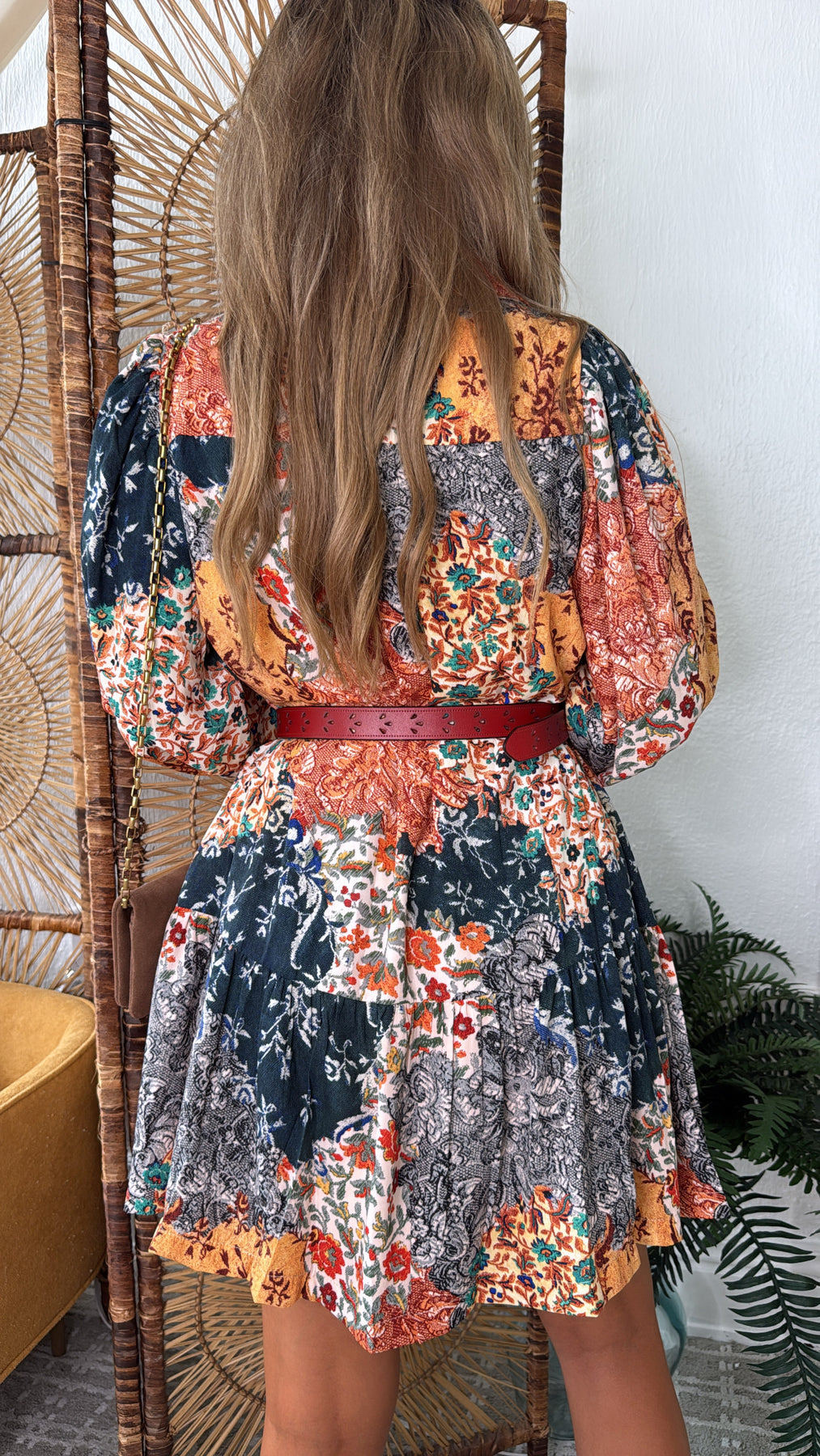 Make a bold style statement with the Nellie Patchwork Long Sleeve Mini Dress. This trendy piece combines comfort and fashion in an effortlessly chic design. Pair it with cowgirl boots for a trendy boho western look.