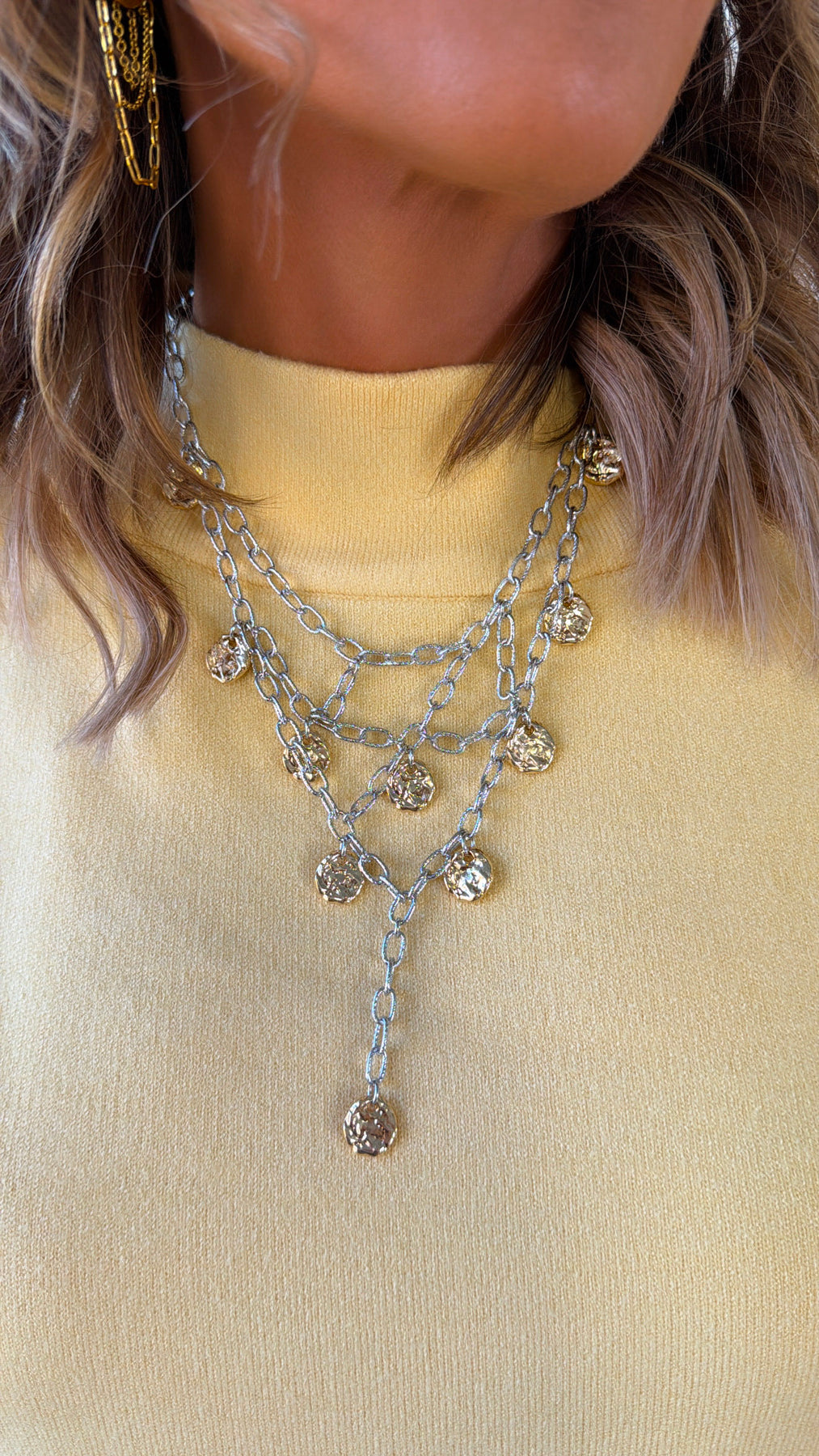Bold, layered, and effortlessly cool the Coined Chain Necklace is the statement piece your jewelry collection has been waiting for. Designed with cascading silver-tone chains and hammered gold coin charms, this mixed-metal beauty gives you that perfectly layered look in one easy piece.