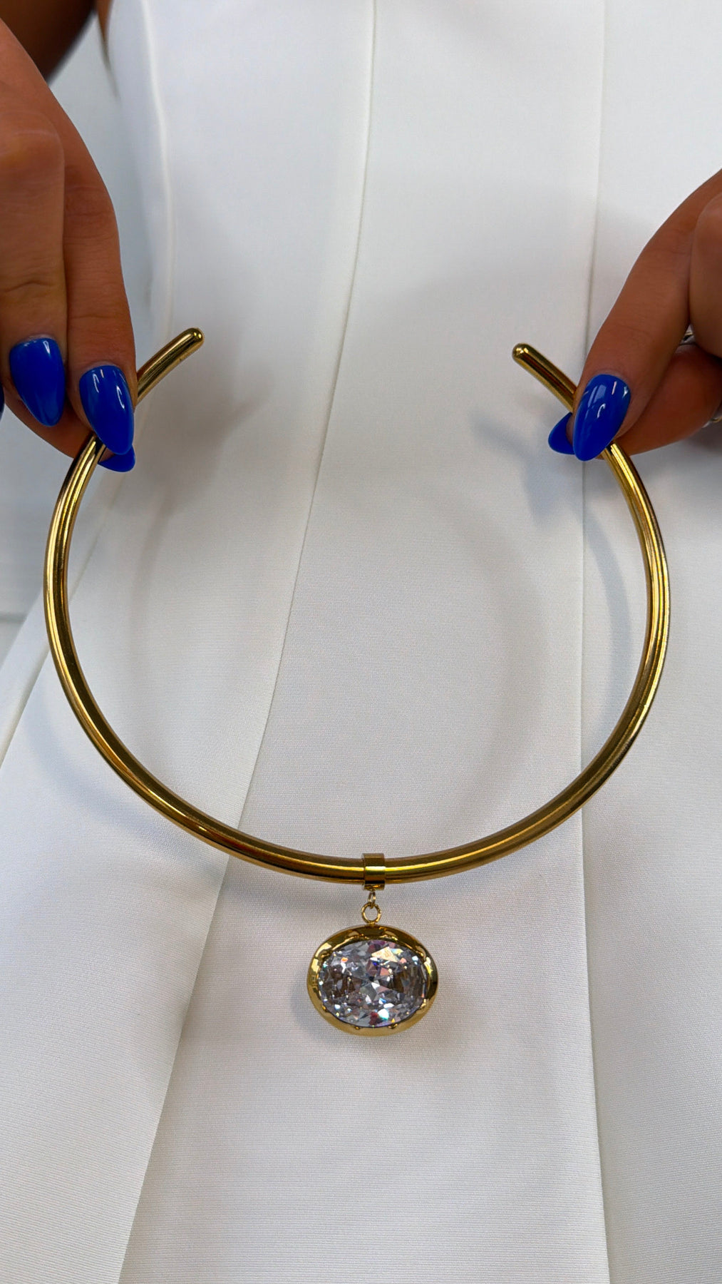 Bold, modern, and undeniably eye-catching. the Jaclyn Necklace is a statement piece designed to elevate any look. Featuring a sleek gold collar silhouette with an open front design, this necklace is finished with a stunning faceted crystal pendant that catches the light beautifully. The structured shape adds a contemporary edge while the sparkling charm brings just the right amount of glam.