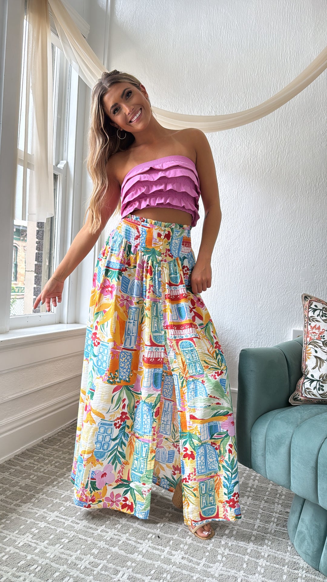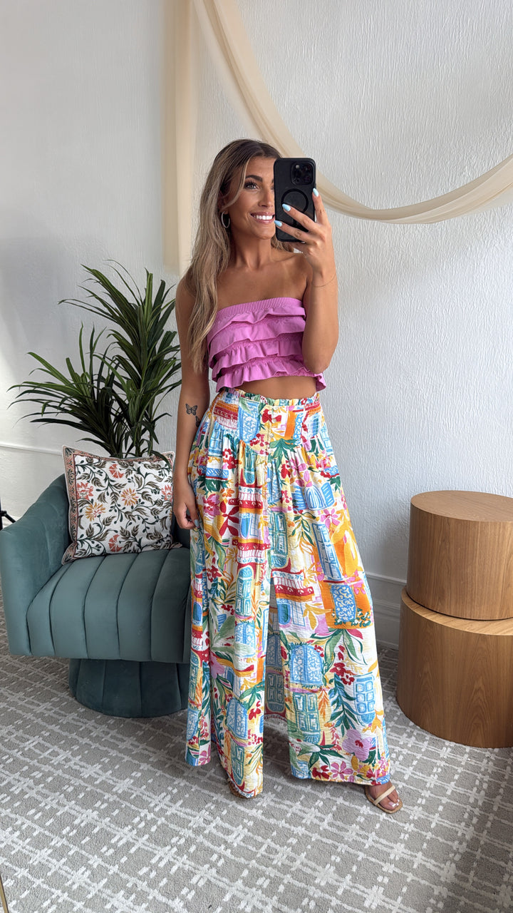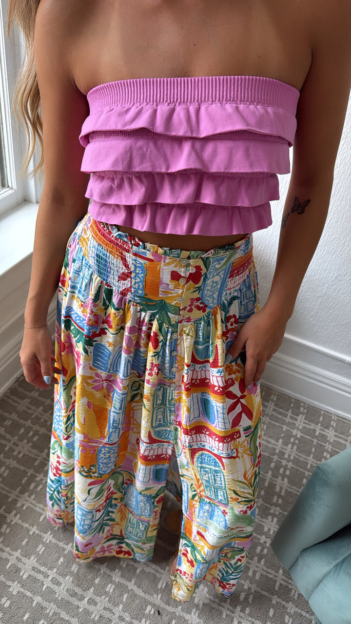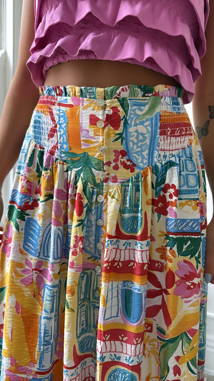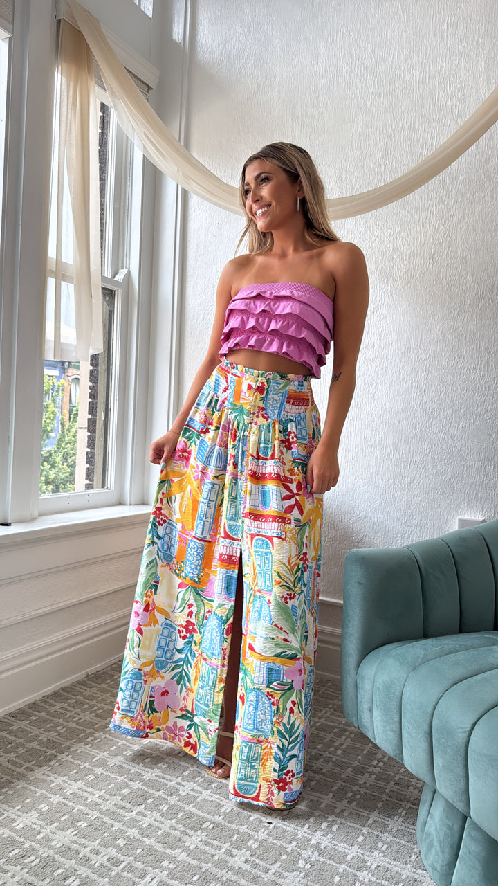 Elevate your style with the Amalfi Breeze Maxi Skirt. This skirt effortlessly blends elegance and comfort with its charming print and bright color mix, making it a versatile addition to your wardrobe.