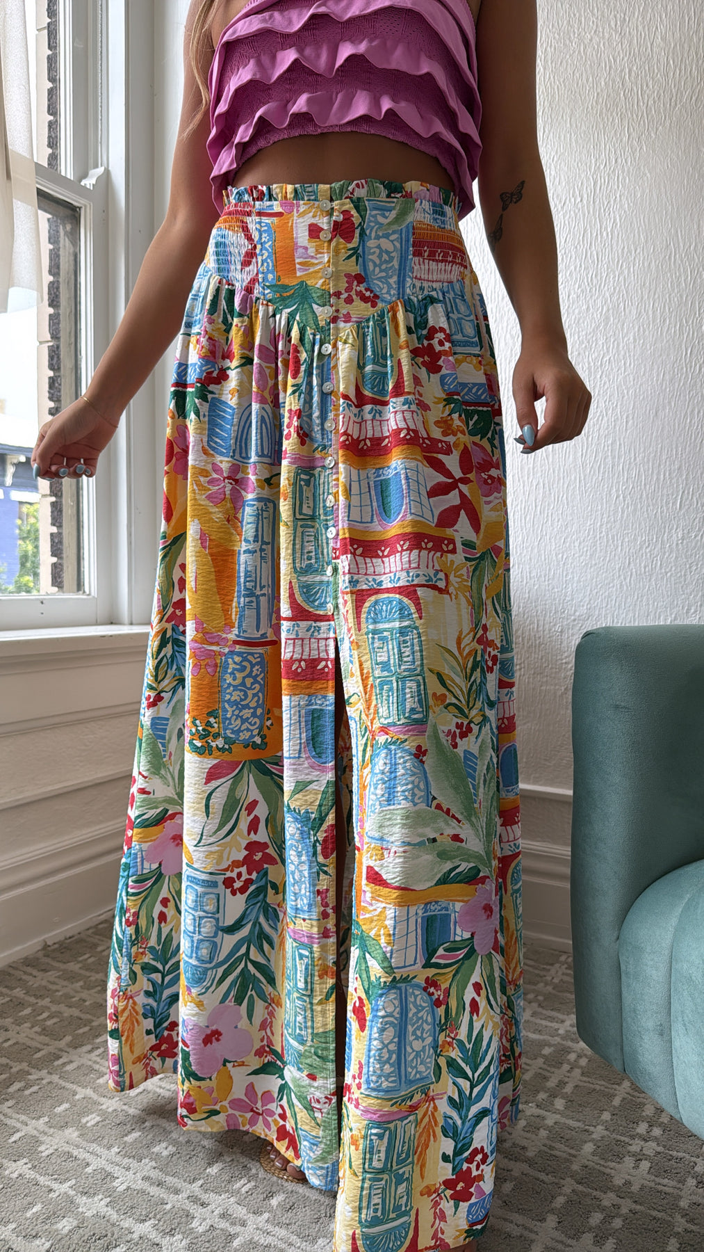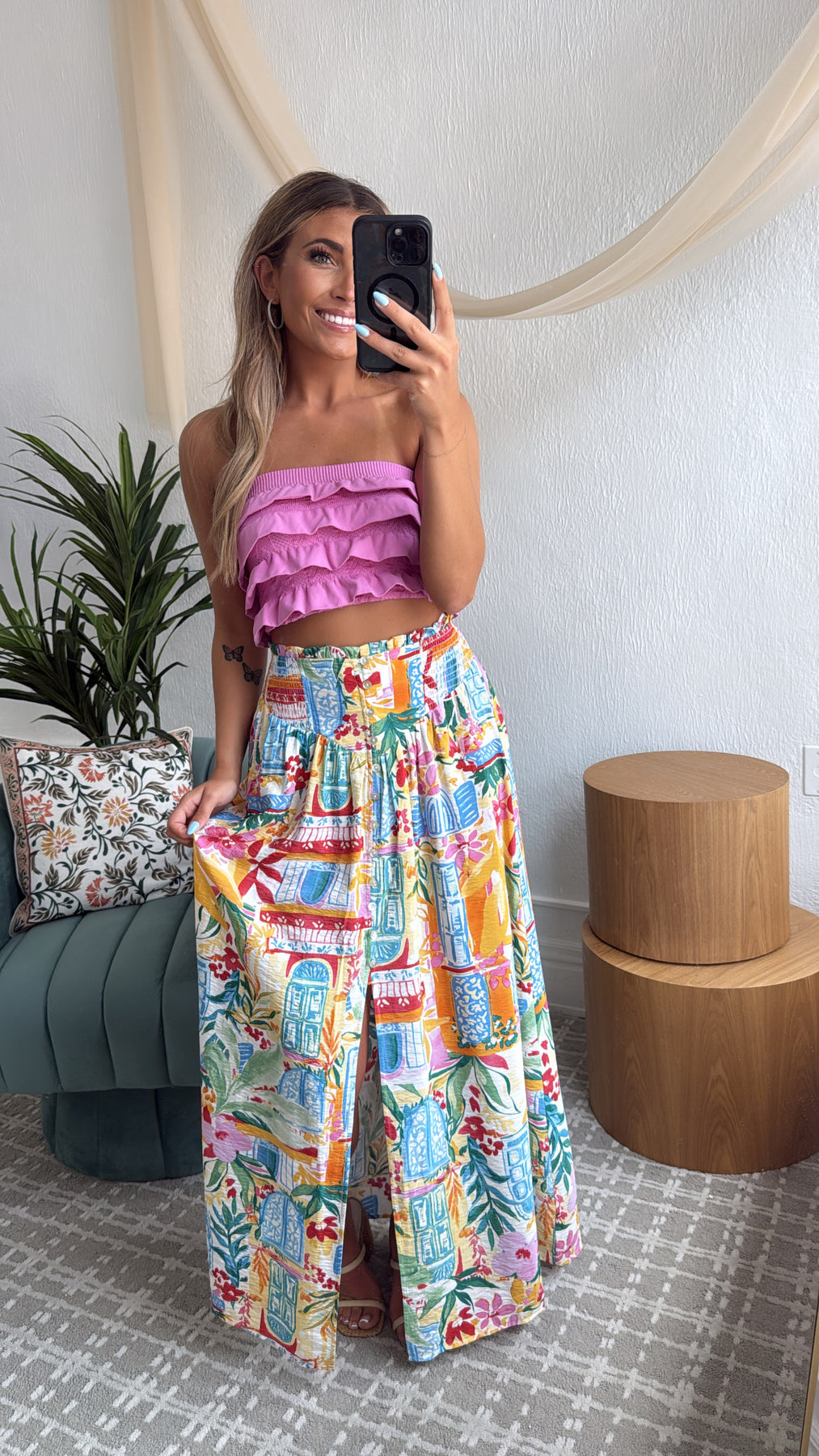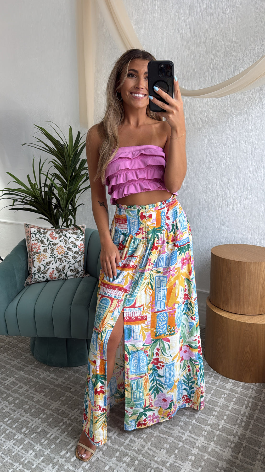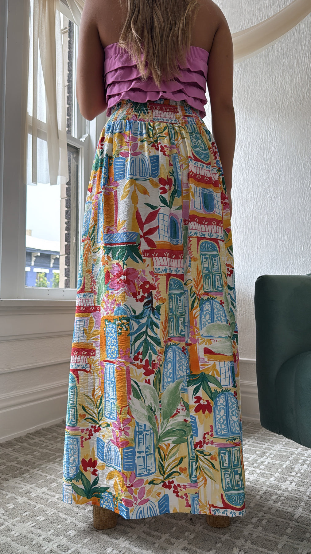 Elevate your style with the Amalfi Breeze Maxi Skirt. This skirt effortlessly blends elegance and comfort with its charming print and bright color mix, making it a versatile addition to your wardrobe.