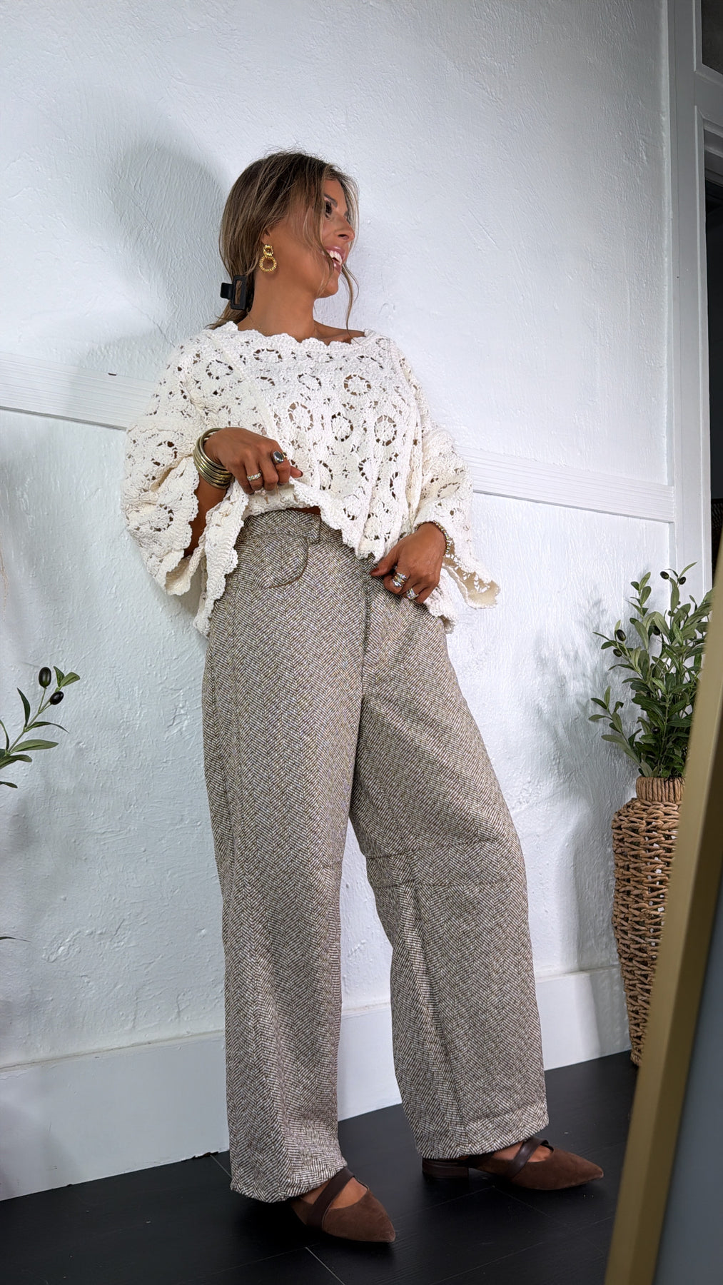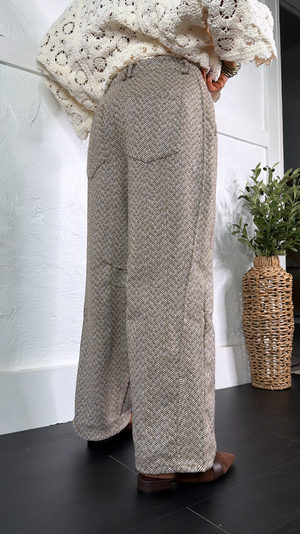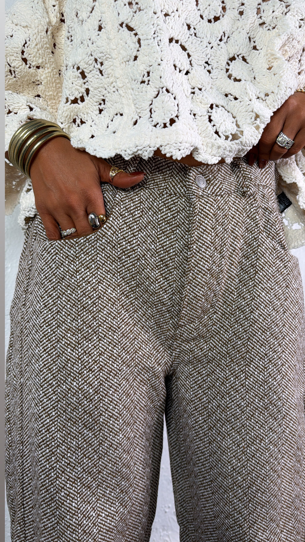 Elevate your wardrobe with the Crescent Bay Pants - designed for both comfort and style. A tweed herringbone pattern and relaxed barrel leg fit. The tailored button waist offers a flattering fit while the rich brown color and design add a touch of Fall!