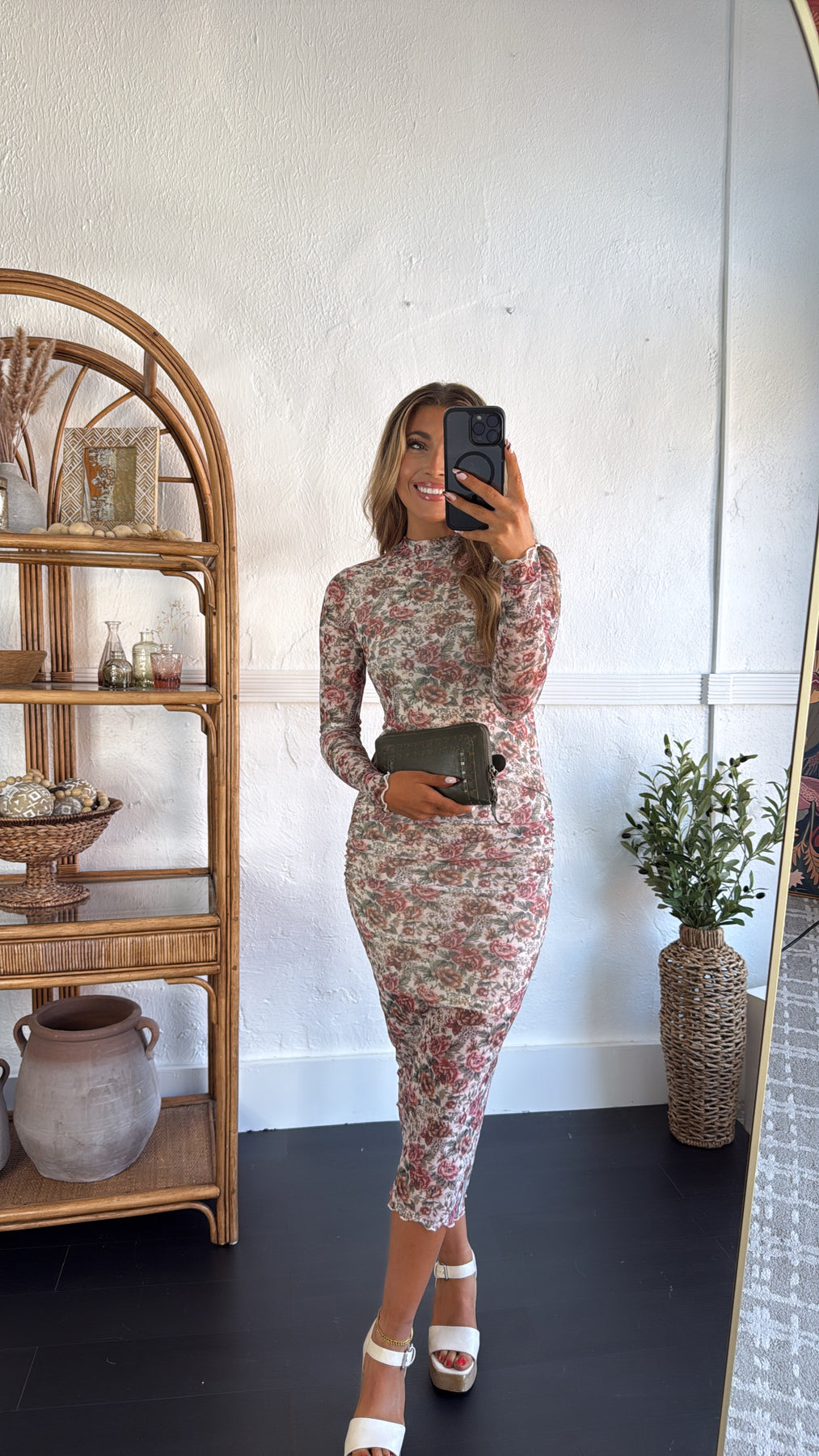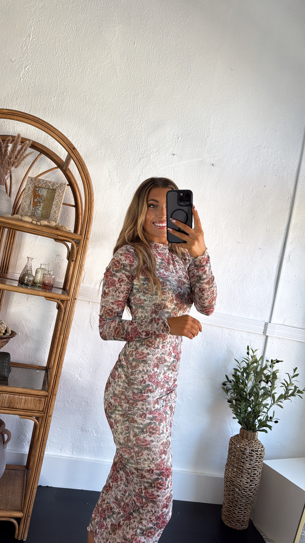 Introducing the Garden of Dusk Mesh Dress, a charming addition to your wardrobe. This midi dress effortlessly blends femininity and sophistication, making it a versatile choice for various occasions.