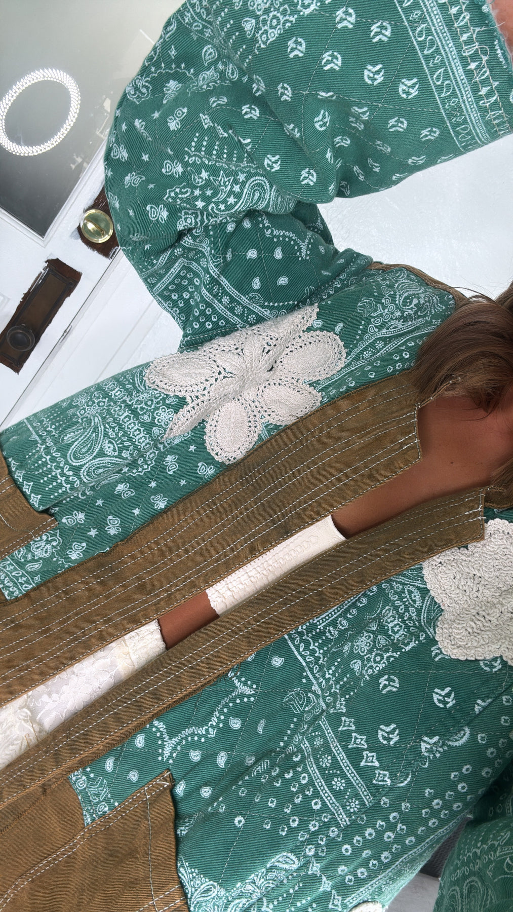 The Jewel Loom Woven Jacket is a true bohemian treasure it effortlessly blending earthy tones, vintage charm, and whimsical detail. This lightweight patchwork jacket features a mix of olive canvas and teal bandana prints, accented with soft crochet floral appliqués for that handcrafted, one-of-a-kind feel. The open-front silhouette, wide sleeves, and raw edge hem make it the perfect layering piece for any season.