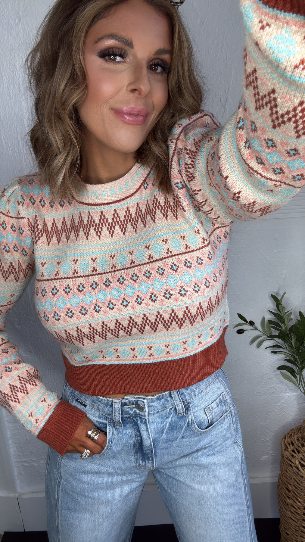 The Maple Mist Sweater features a fun boho pattern, with a touch of cool girl energy. This piece has a brown contrast design, cropped hemline and a comfortable stretchy fit. Upgrade your wardrobe with this cozy cool piece!