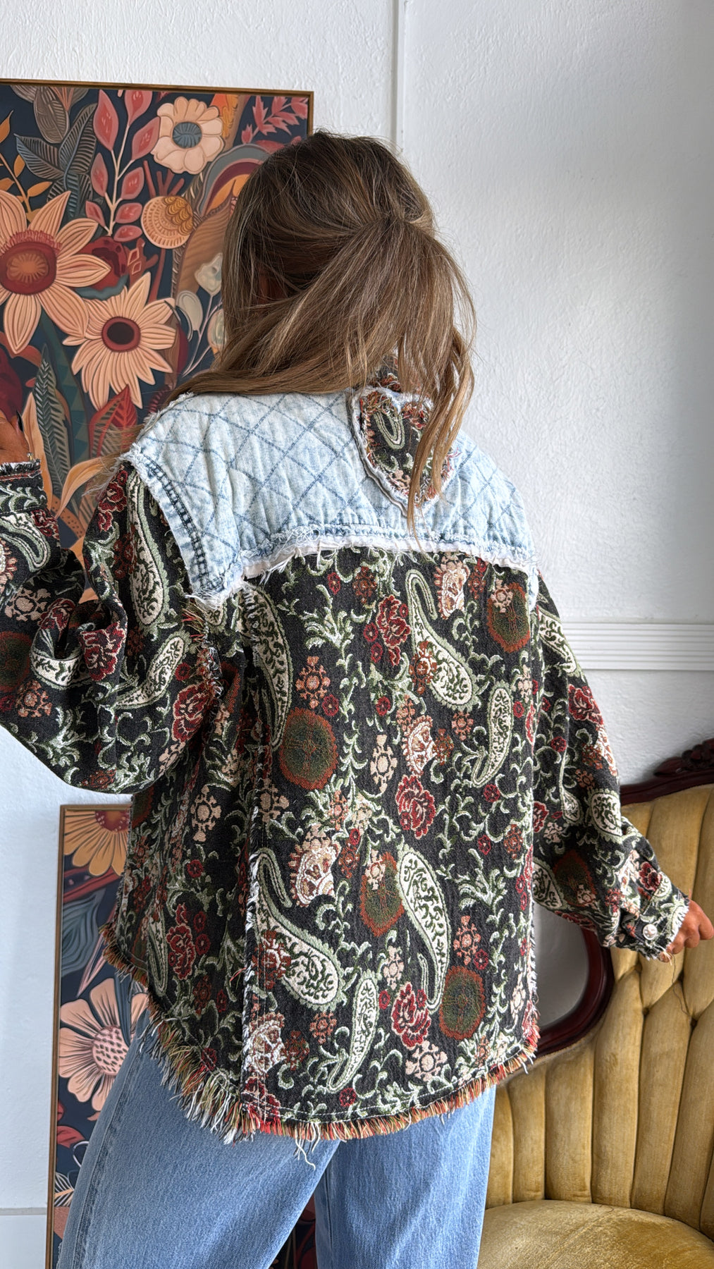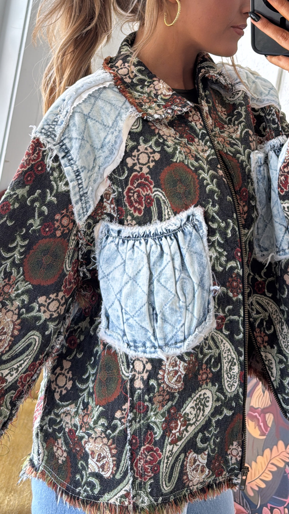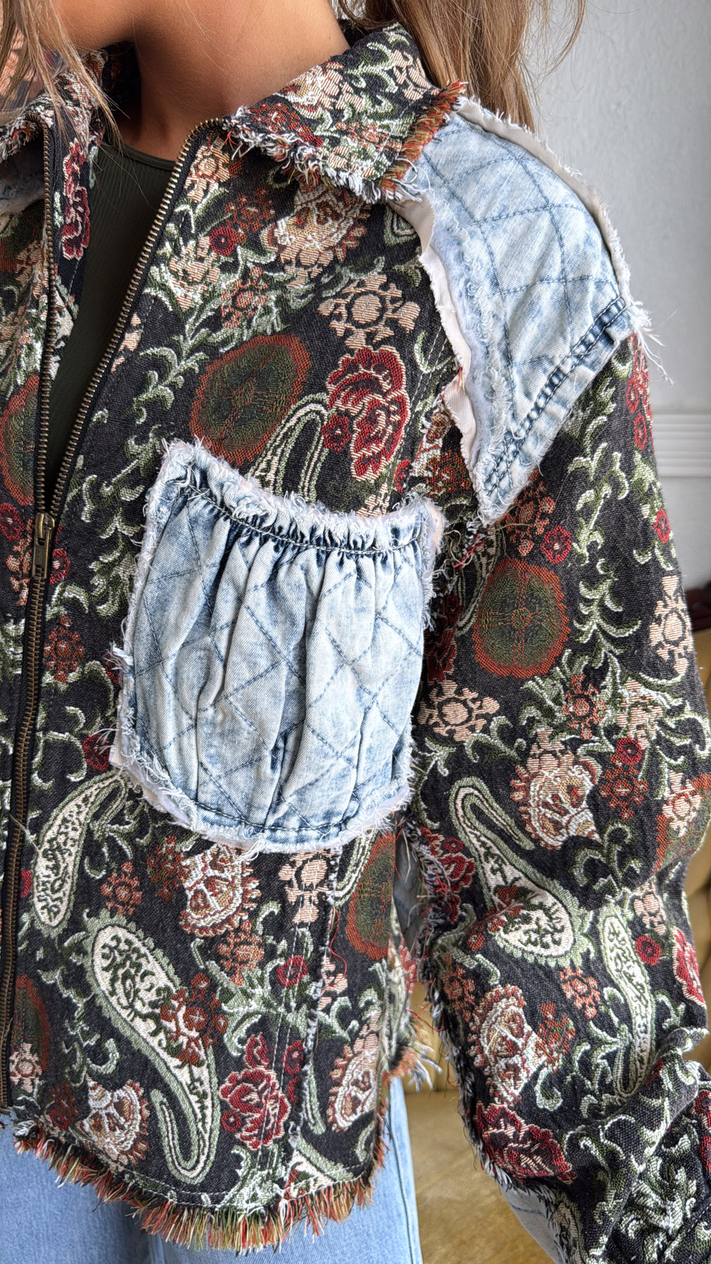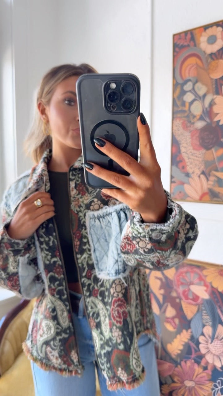 Equal parts vintage and edgy, this jacket is a true statement-maker. With its tapestry-style paisley base and quilted denim patchwork accents, it gives you that one-of-a-kind, collected-over-time feel.