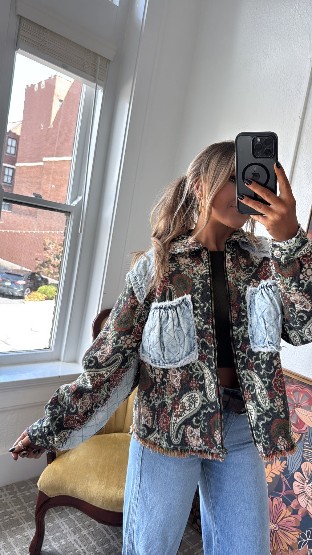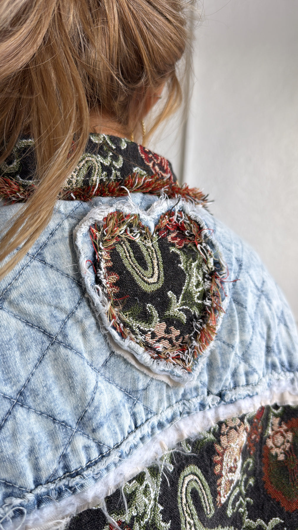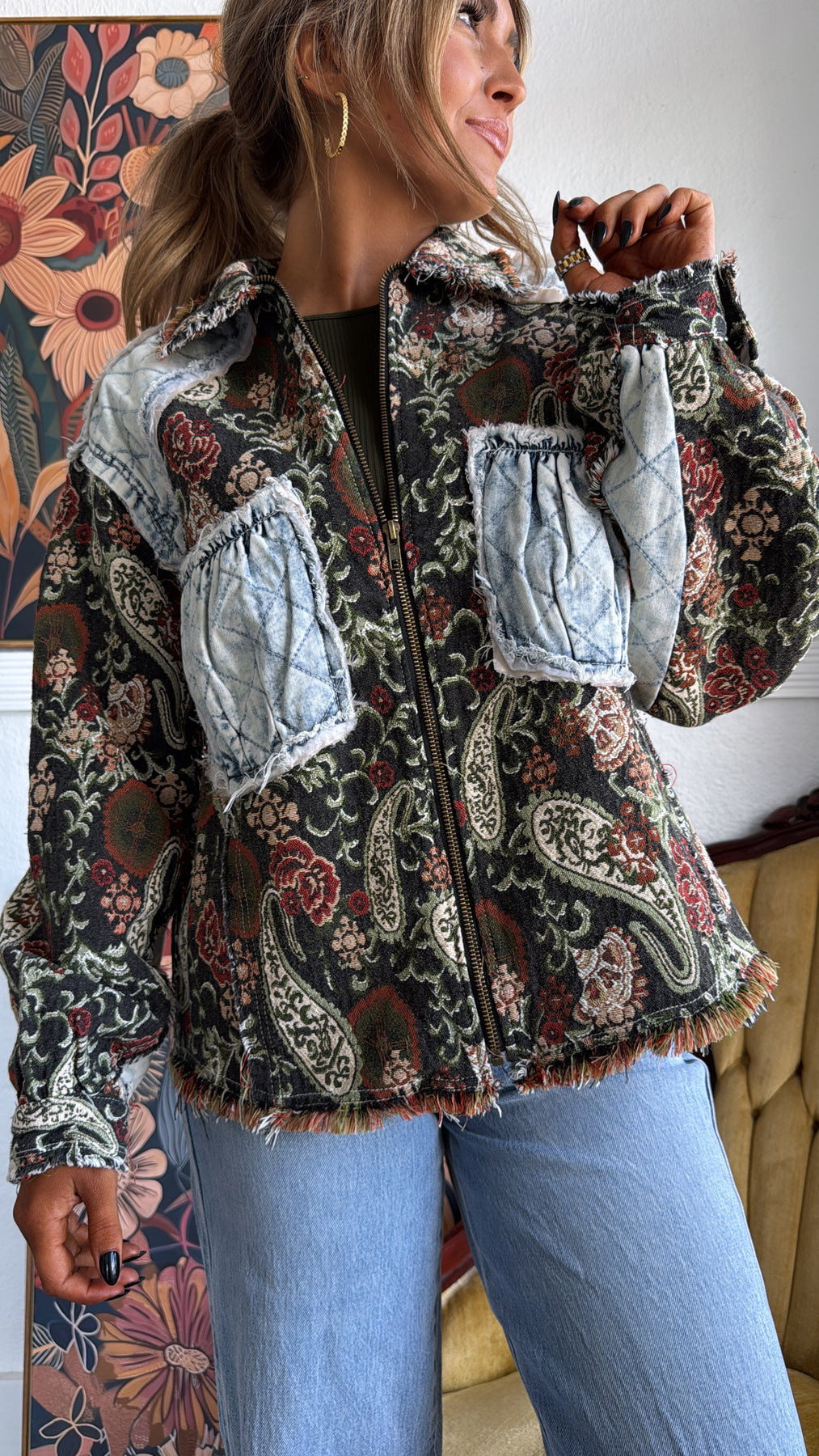 Equal parts vintage and edgy, this jacket is a true statement-maker. With its tapestry-style paisley base and quilted denim patchwork accents, it gives you that one-of-a-kind, collected-over-time feel.