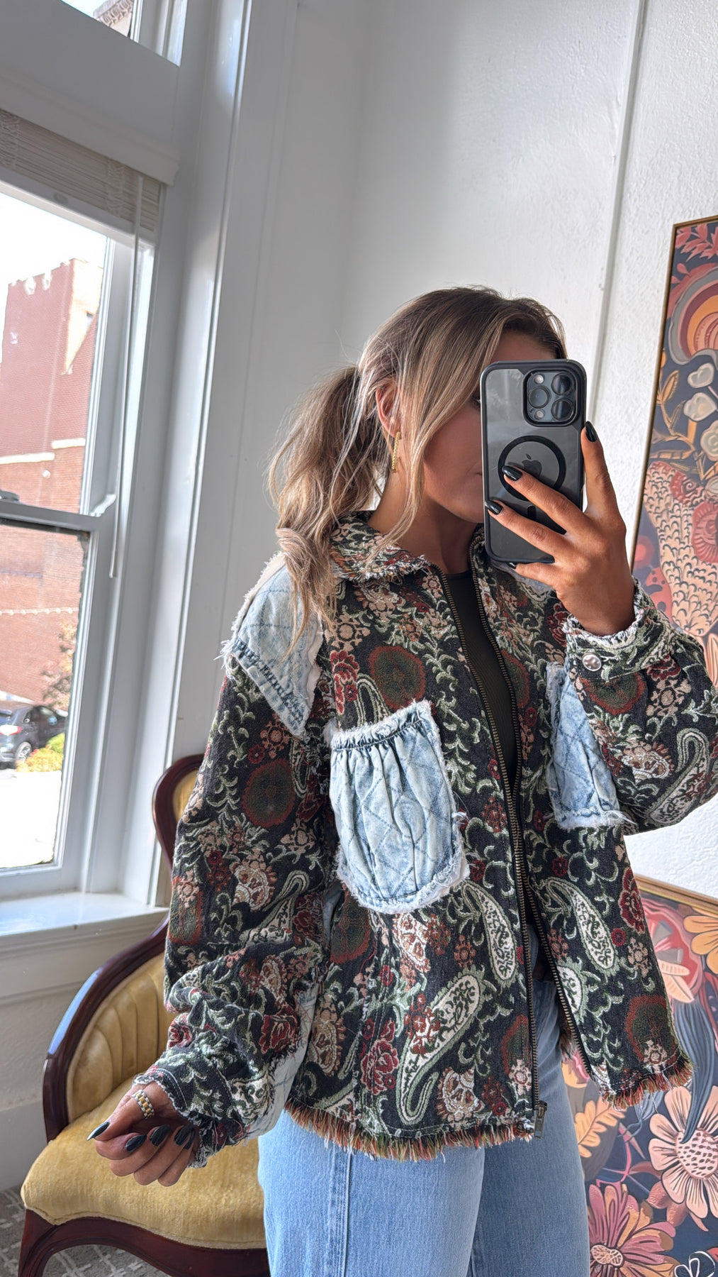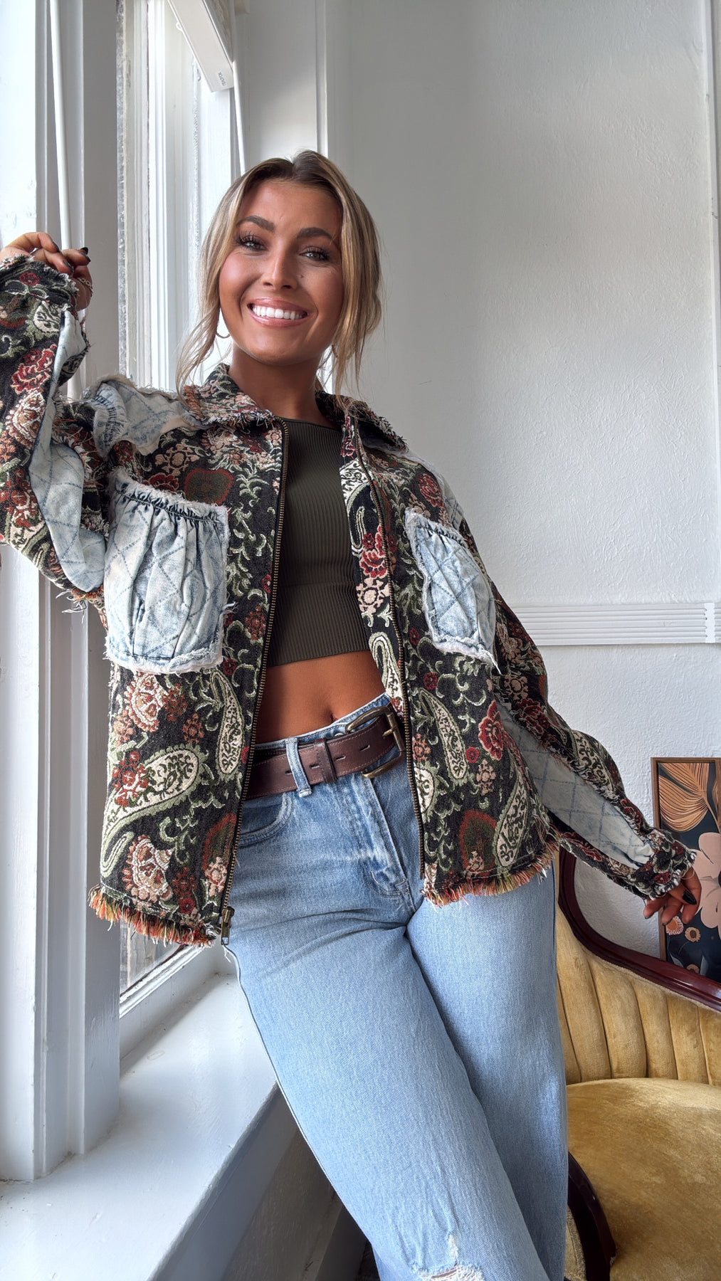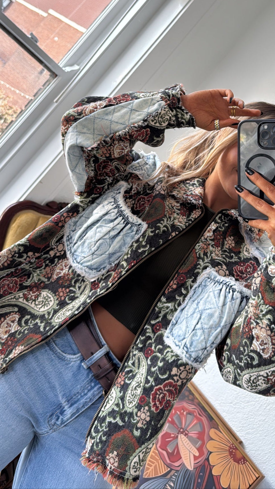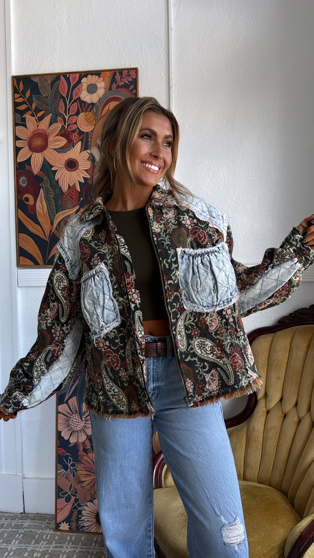 Equal parts vintage and edgy, this jacket is a true statement-maker. With its tapestry-style paisley base and quilted denim patchwork accents, it gives you that one-of-a-kind, collected-over-time feel.