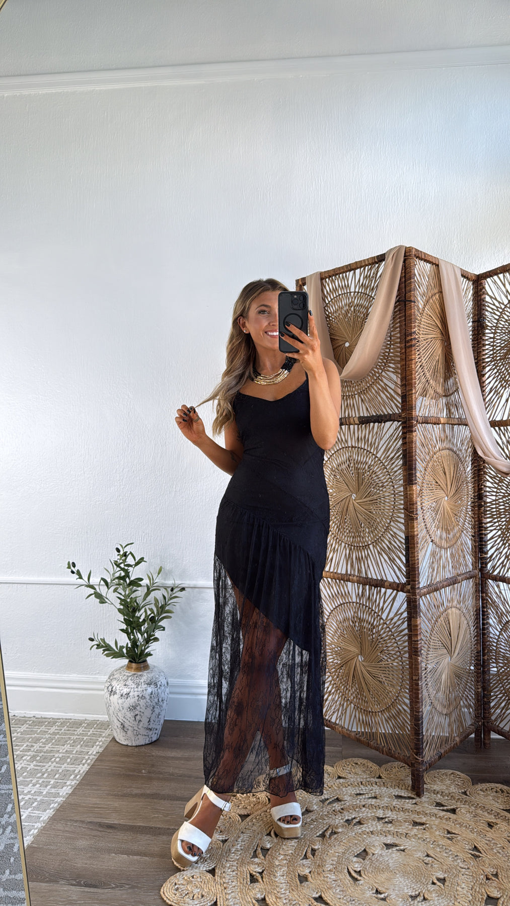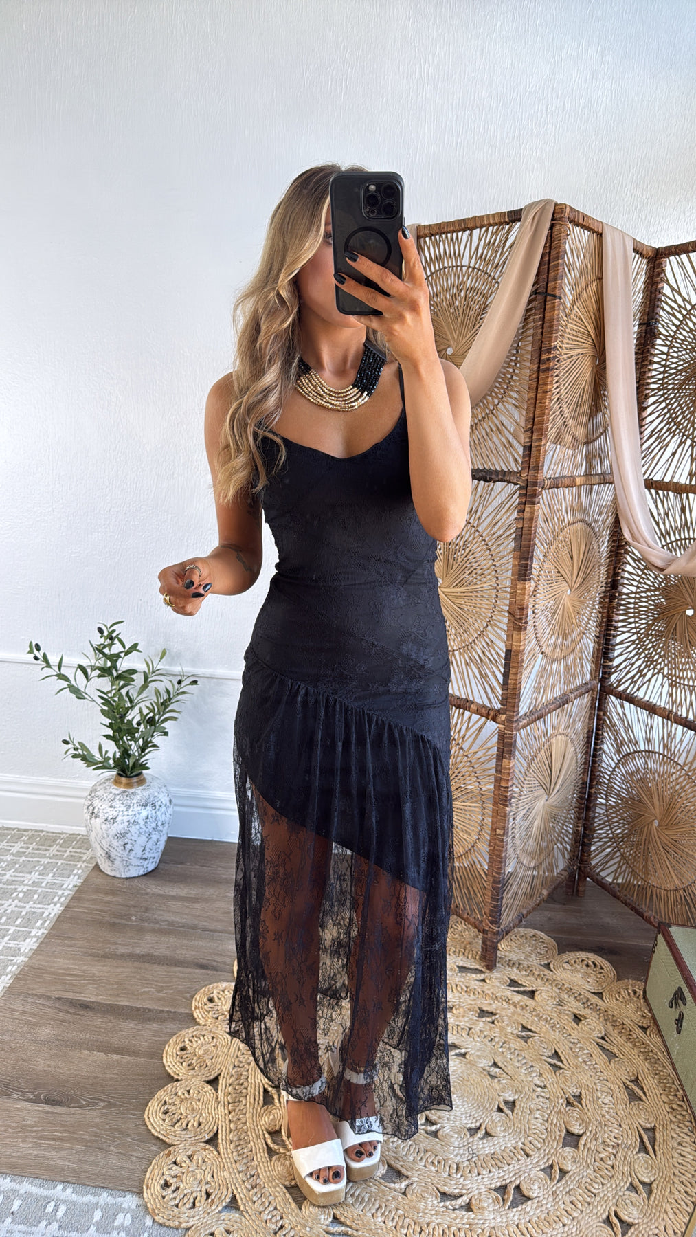 This Moonlit Lace Maxi Dress is the ultimate statement piece for your next night out or special occasion. Featuring a flattering fitted bodice with delicate floral lace, adjustable straps, and an asymmetrical layered lace skirt overlay, this dress blends romantic detailing with a bold, modern vibe. The sheer lace skirt reveals just the right amount of leg for an effortlessly sultry look.