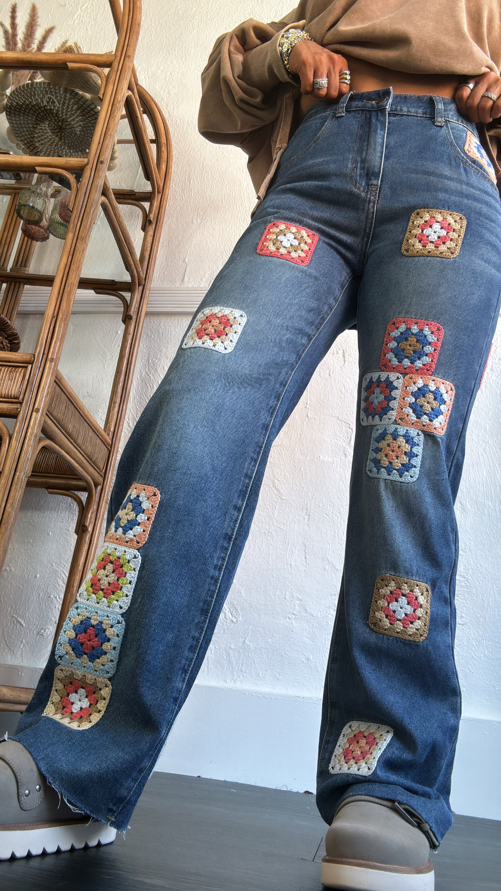 Hit the streets wearing these OLI & HALI: The Mixed Thread Denim! With granny square patchwork detailing and wide legs, you'll be sure to turn heads no matter the occasion. Make 'em your go-to for a unique look!