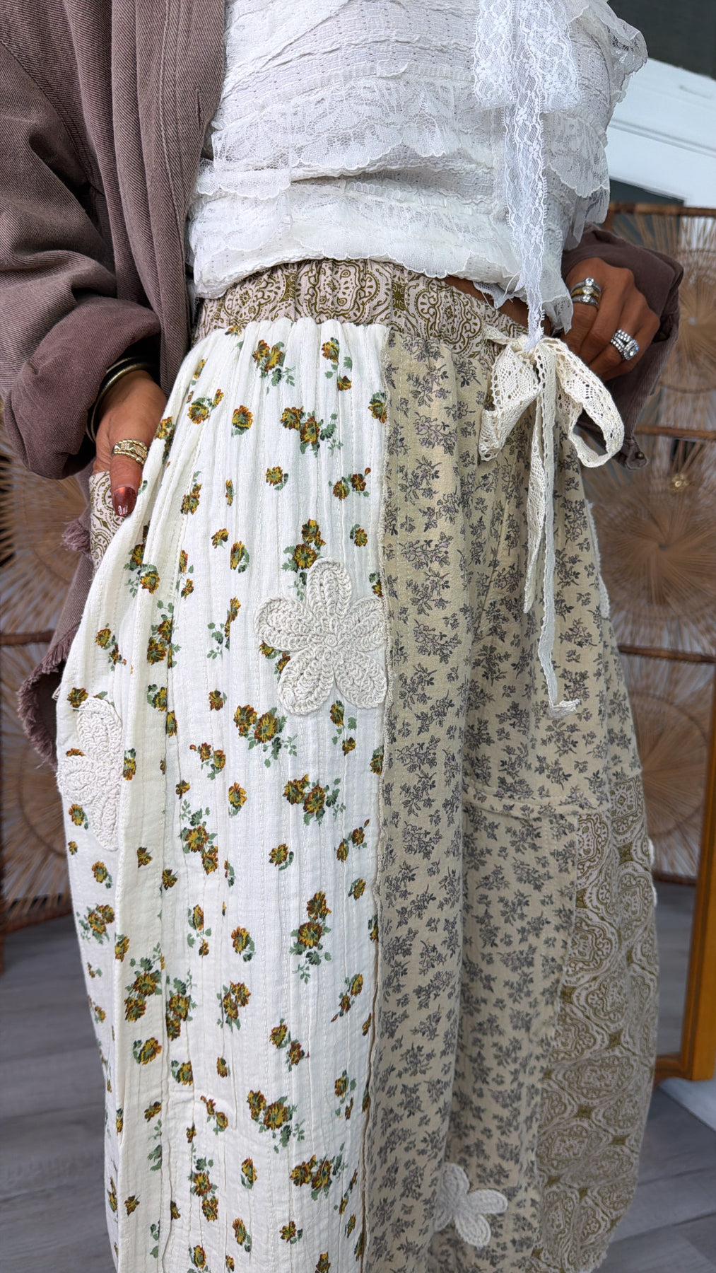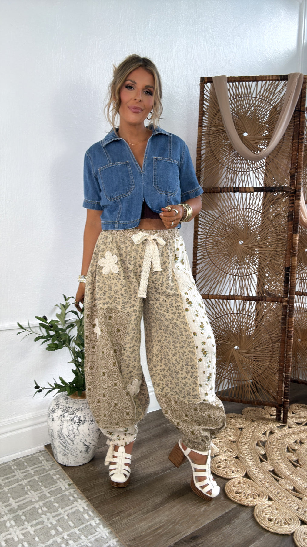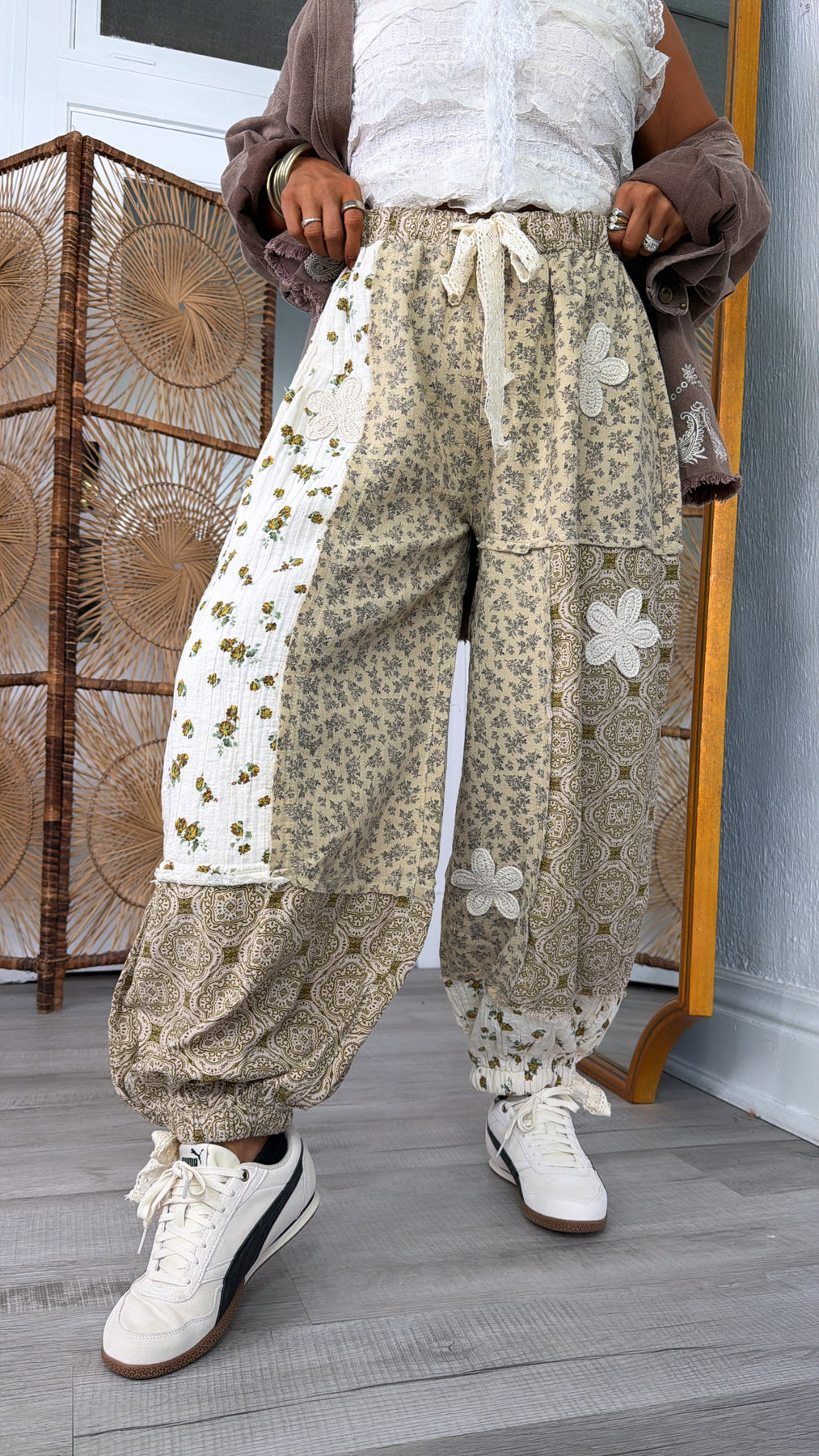 These dreamy patchwork joggers are giving effortless boho vibes with a perfectly lived-in look. Designed with mixed vintage inspired prints, crochet floral appliqués, and delicate lace trim, they’re an artful mix of textures that feels one-of-a-kind. The relaxed fit, elastic cuffs, and lace drawstring waist make them as comfortable as they are unique, perfect for styling with a simple tank, a cropped denim jacket, or even a cozy sweater when the weather turns cool.