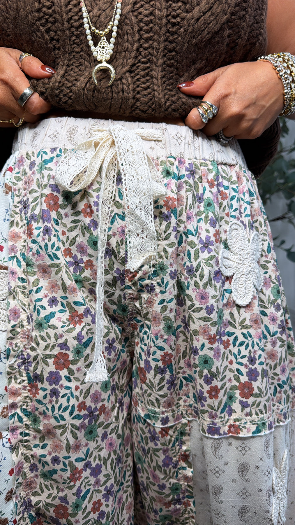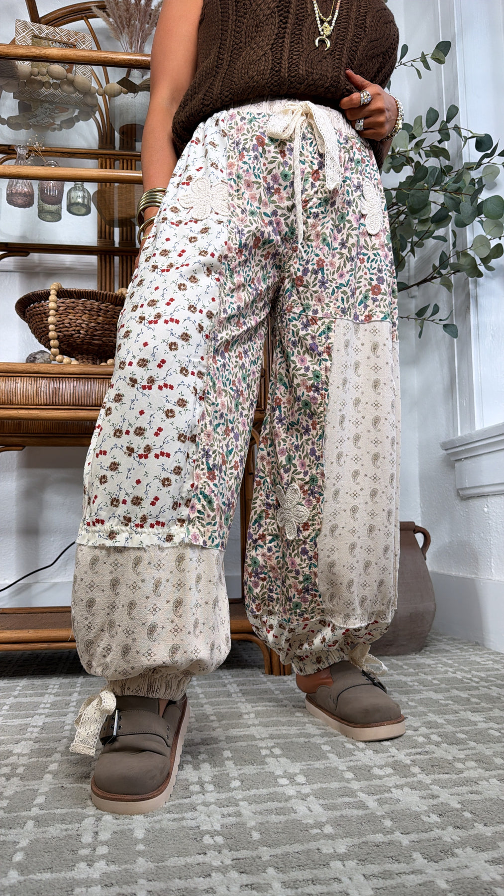 These dreamy patchwork joggers are giving effortless boho vibes with a perfectly lived-in look. Designed with mixed vintage inspired prints, crochet floral appliqués, and delicate lace trim, they’re an artful mix of textures that feels one-of-a-kind. The relaxed fit, elastic cuffs, and lace drawstring waist make them as comfortable as they are unique, perfect for styling with a simple tank, a cropped denim jacket, or even a cozy sweater when the weather turns cool.