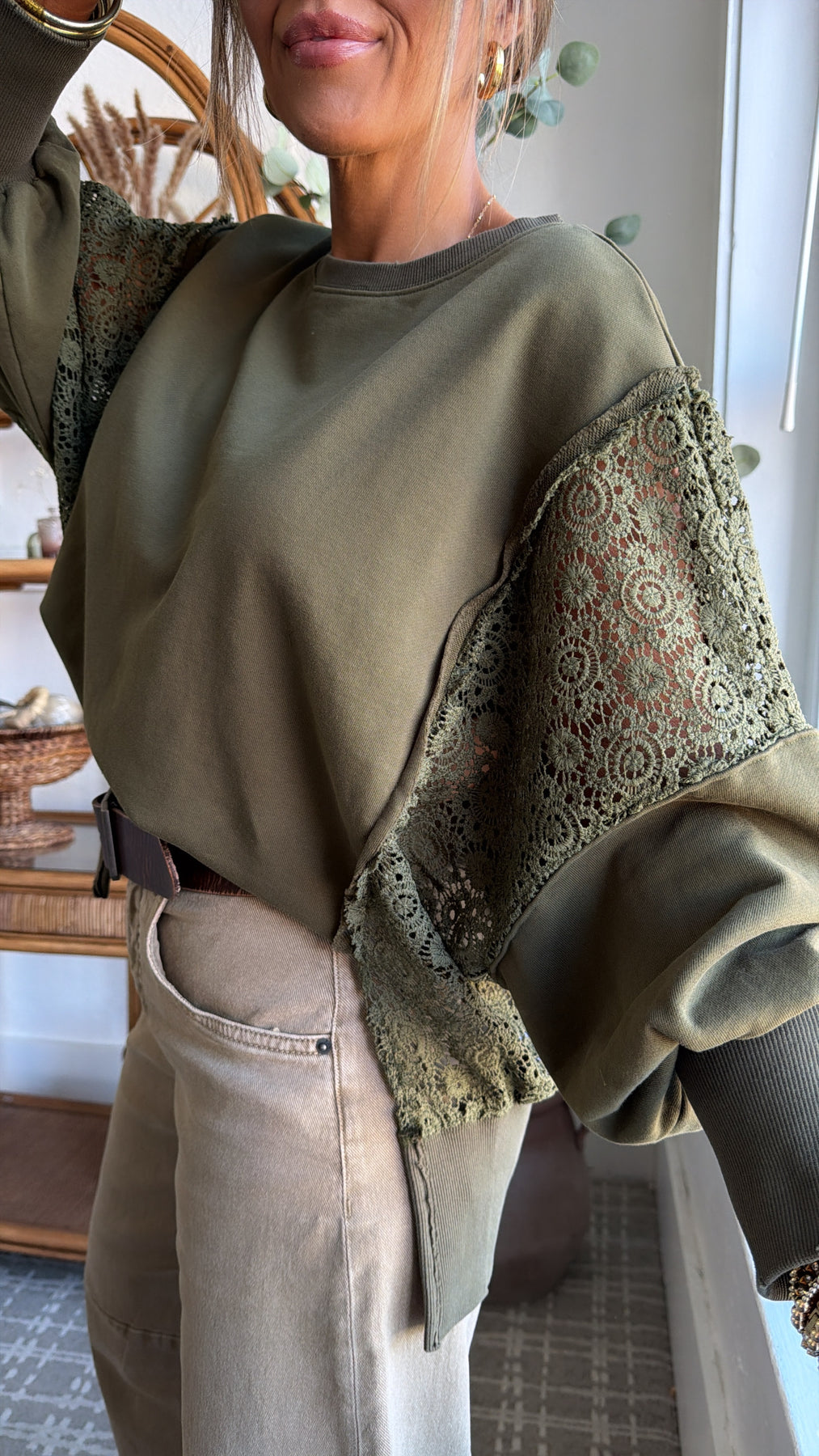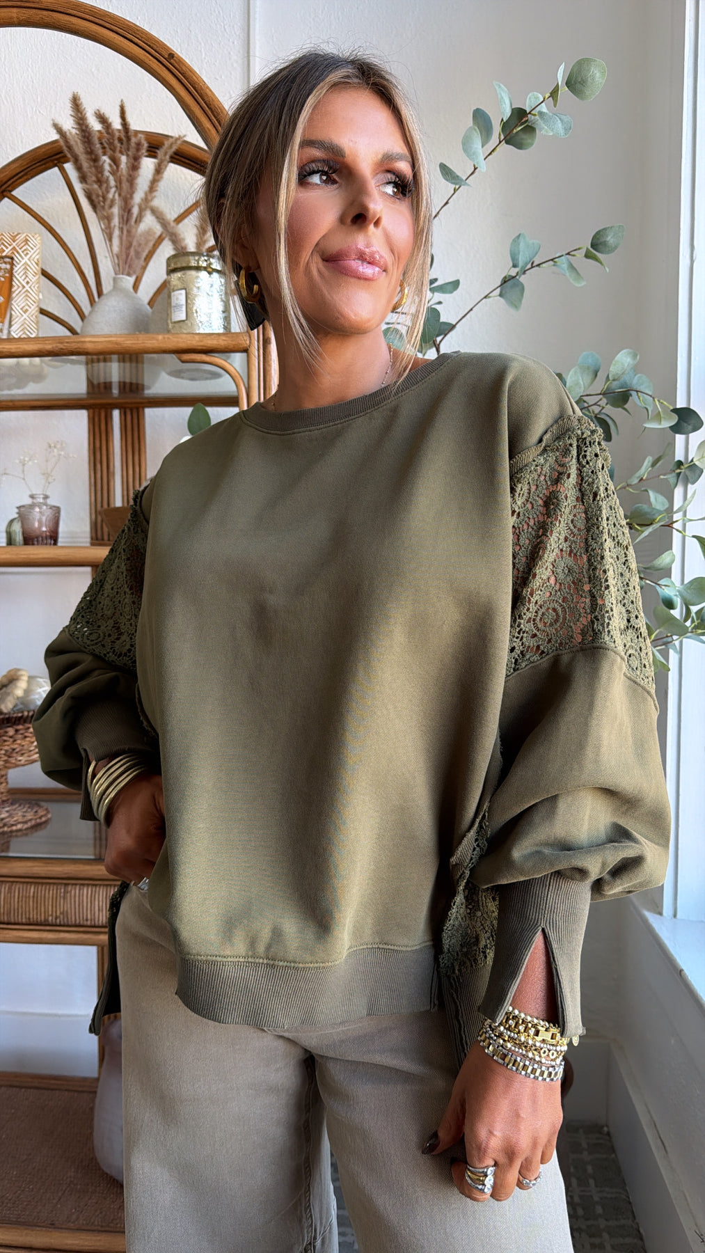 Effortless comfort meets feminine charm in the Vine Vale Top. This soft olive pullover brings an elevated twist to casual wear with its relaxed fit and stunning lace-detailed sleeves. The crochet-style inserts add texture and a touch of romance, while the ribbed hem and side slits keep it easy and flattering.