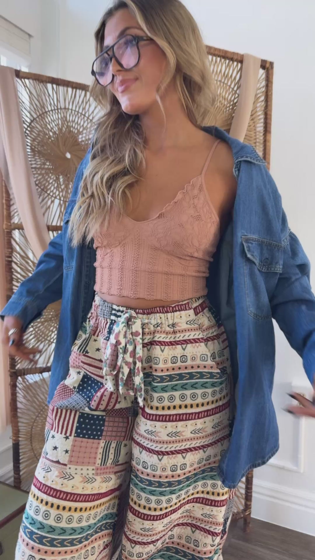 These boho patchwork pants bring all the personality, playful patterns, vibrant hues, and that perfectly slouchy vibes. The smocked elastic waistband and functional drawstring make them comfy for all-day wear, while the jogger-style cuffs keep the silhouette modern and versatile. Pair them with a simple crop top or a denim jacket for an effortless, statement-making look.