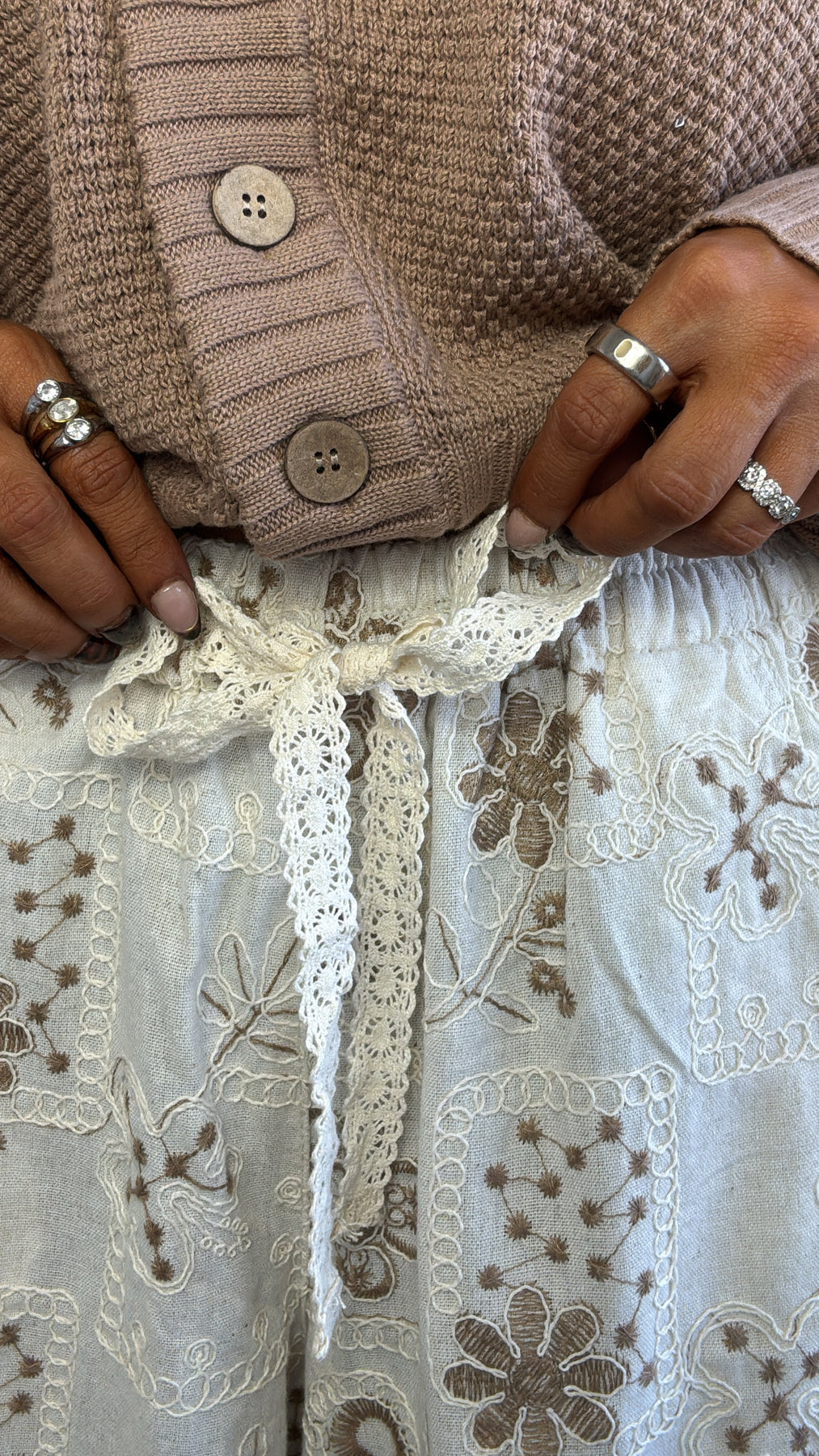 I saw these pants and immediately knew I needed to have them. The fabric is sturdy but soft. The embroidery is so well done and such a beautiful pattern. These are a must have for any closet. You can pair lots of different top options with them as well, because of the neutral colors.