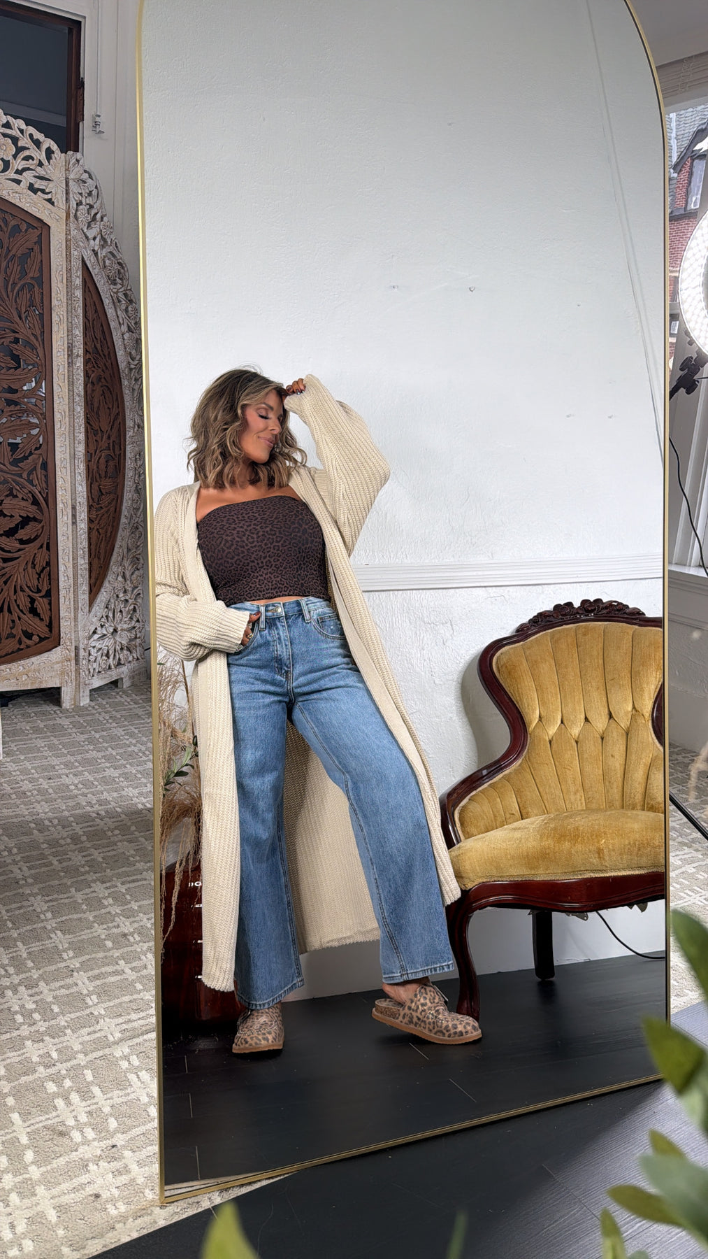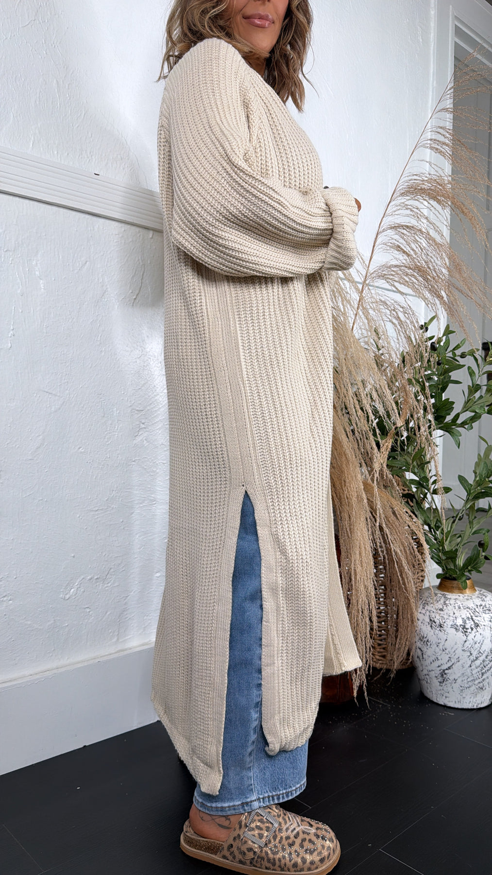 The Toasted Birch Knit Cardigan in Beige is the ultimate layering piece for cozy, effortless style. Crafted from a soft, chunky knit, this longline cardigan drapes beautifully for a relaxed yet refined look. Its open-front design and roomy sleeves make it perfect for throwing over your favorite basics, from jeans and tees to dresses. The neutral beige tone adds timeless versatility, making this a must-have staple for any season.