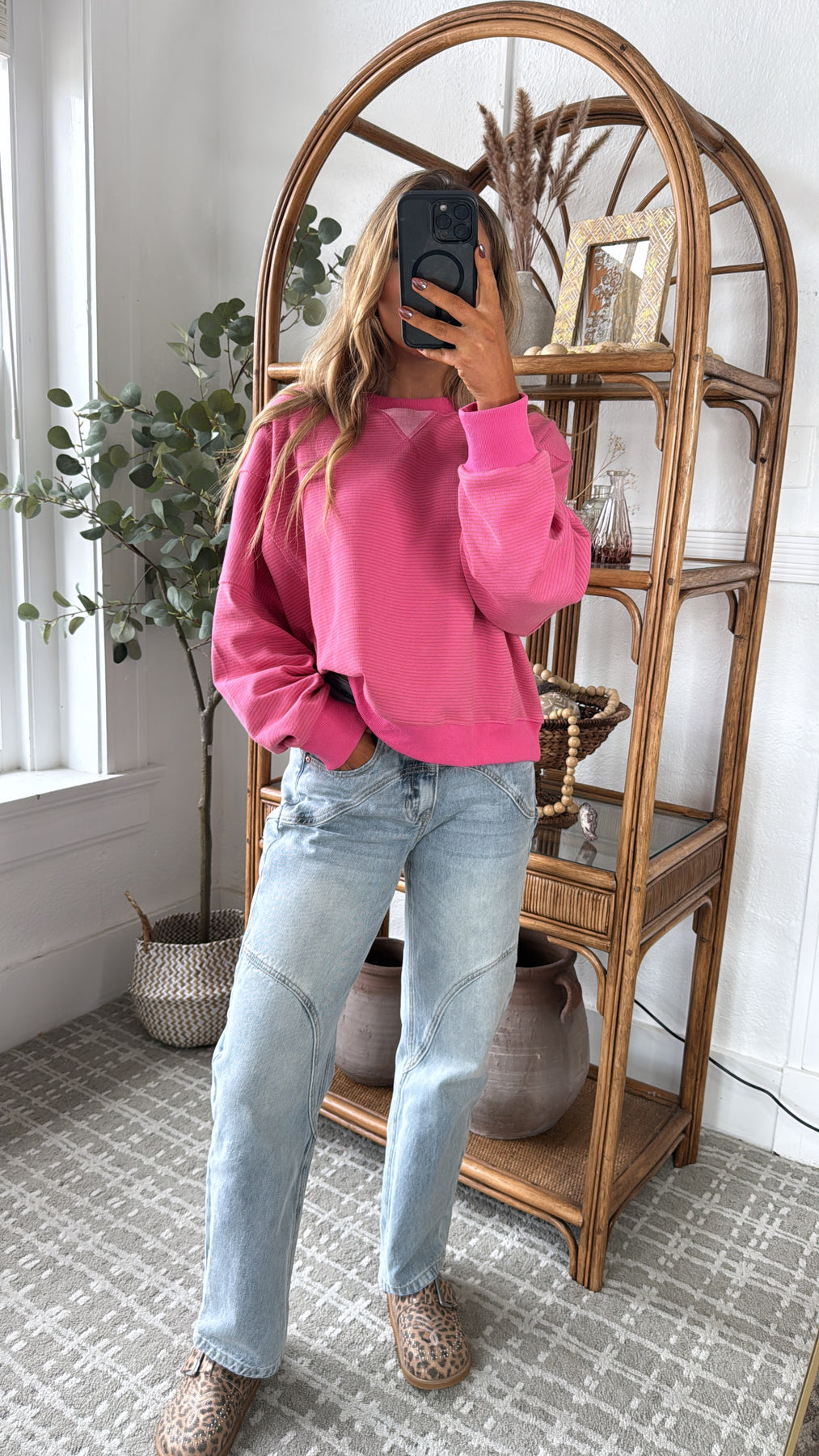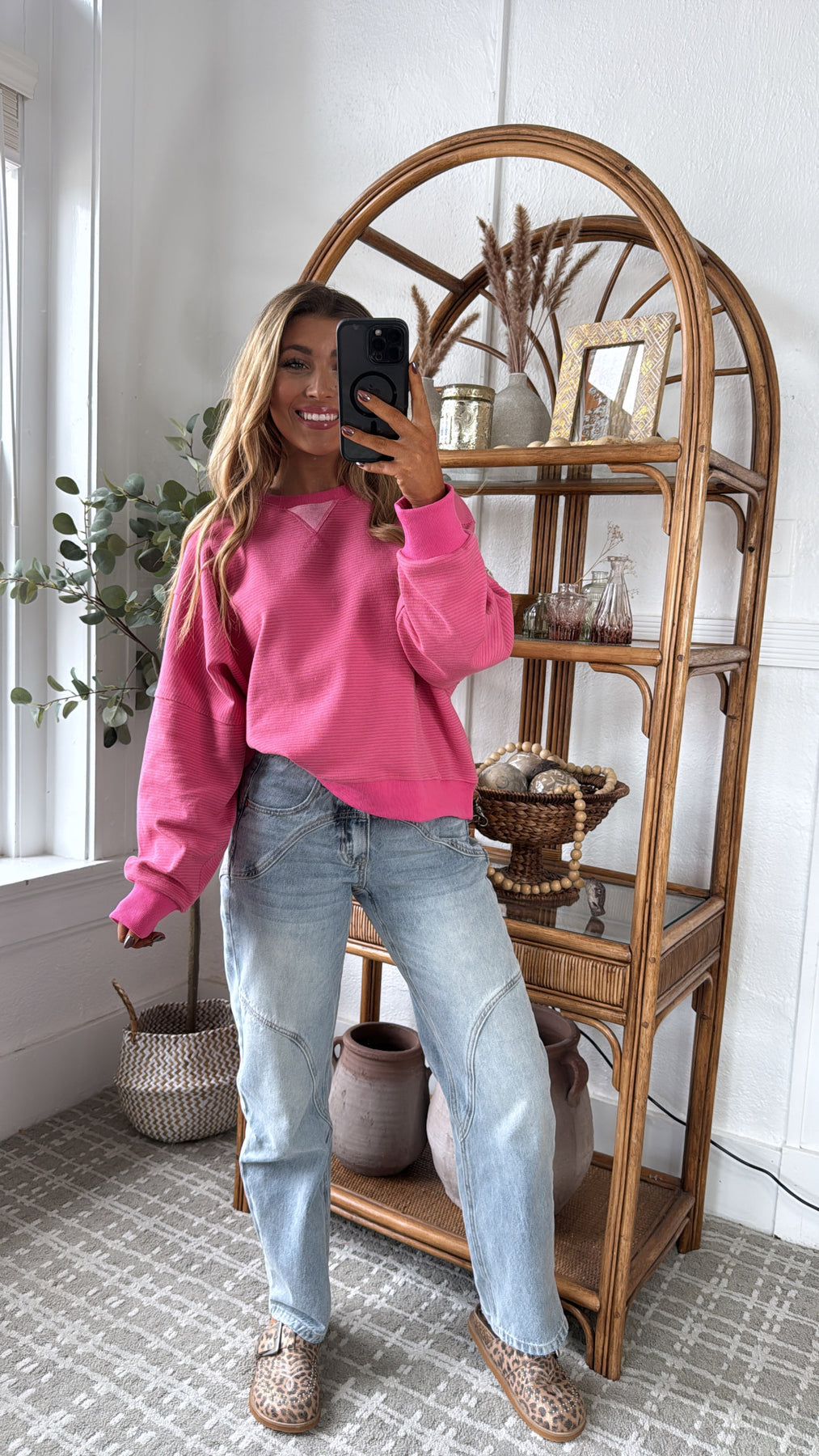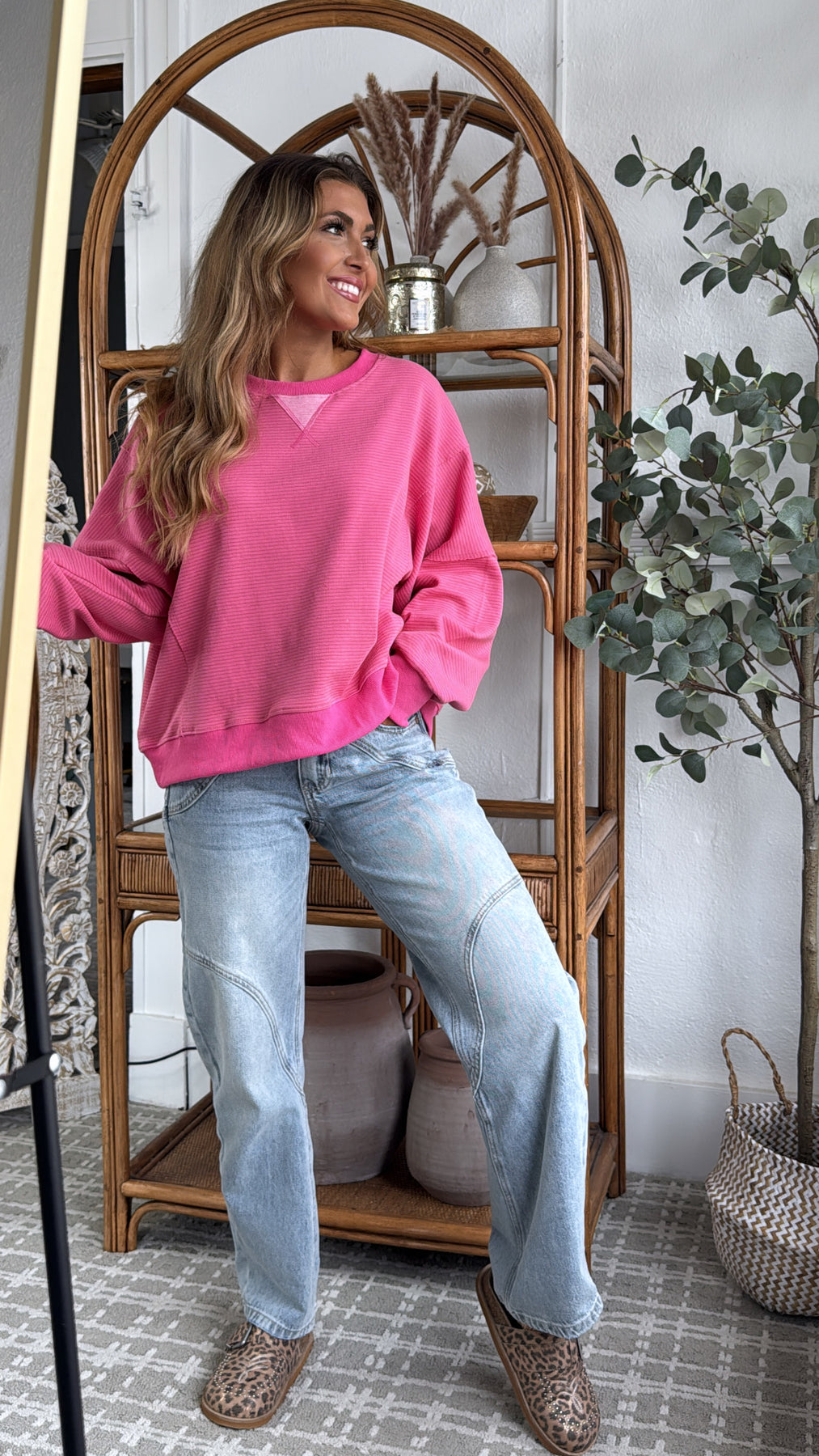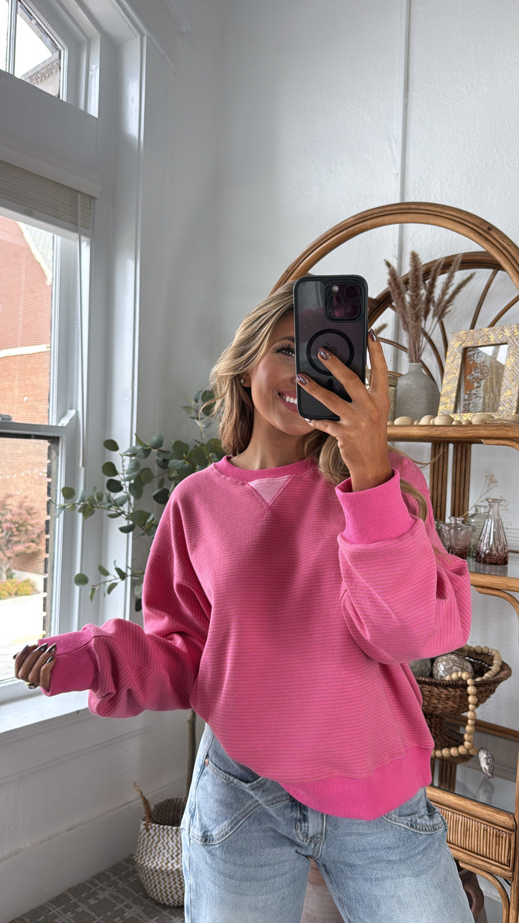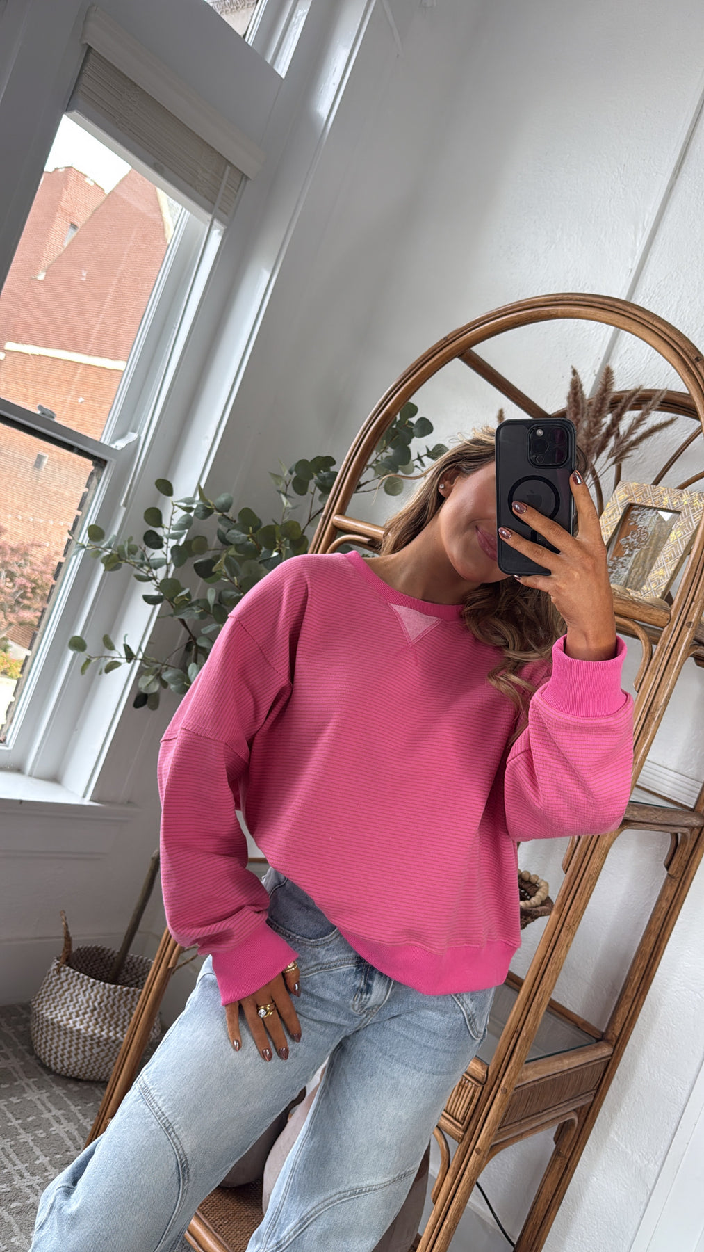 Relaxed, cheerful, and oh-so-comfy — the Sunday Ease Striped Top is your new weekend essential. Featuring a soft ribbed knit with subtle tonal stripes, this easygoing pullover blends casual comfort with a pop of color. The relaxed fit and drop shoulders create that effortless, lived-in look that’s perfect for lounging or brunching.