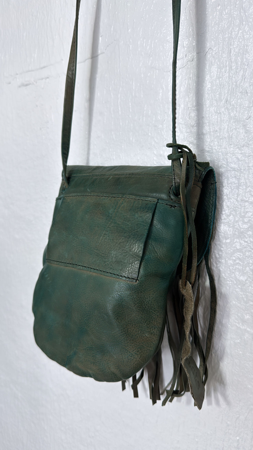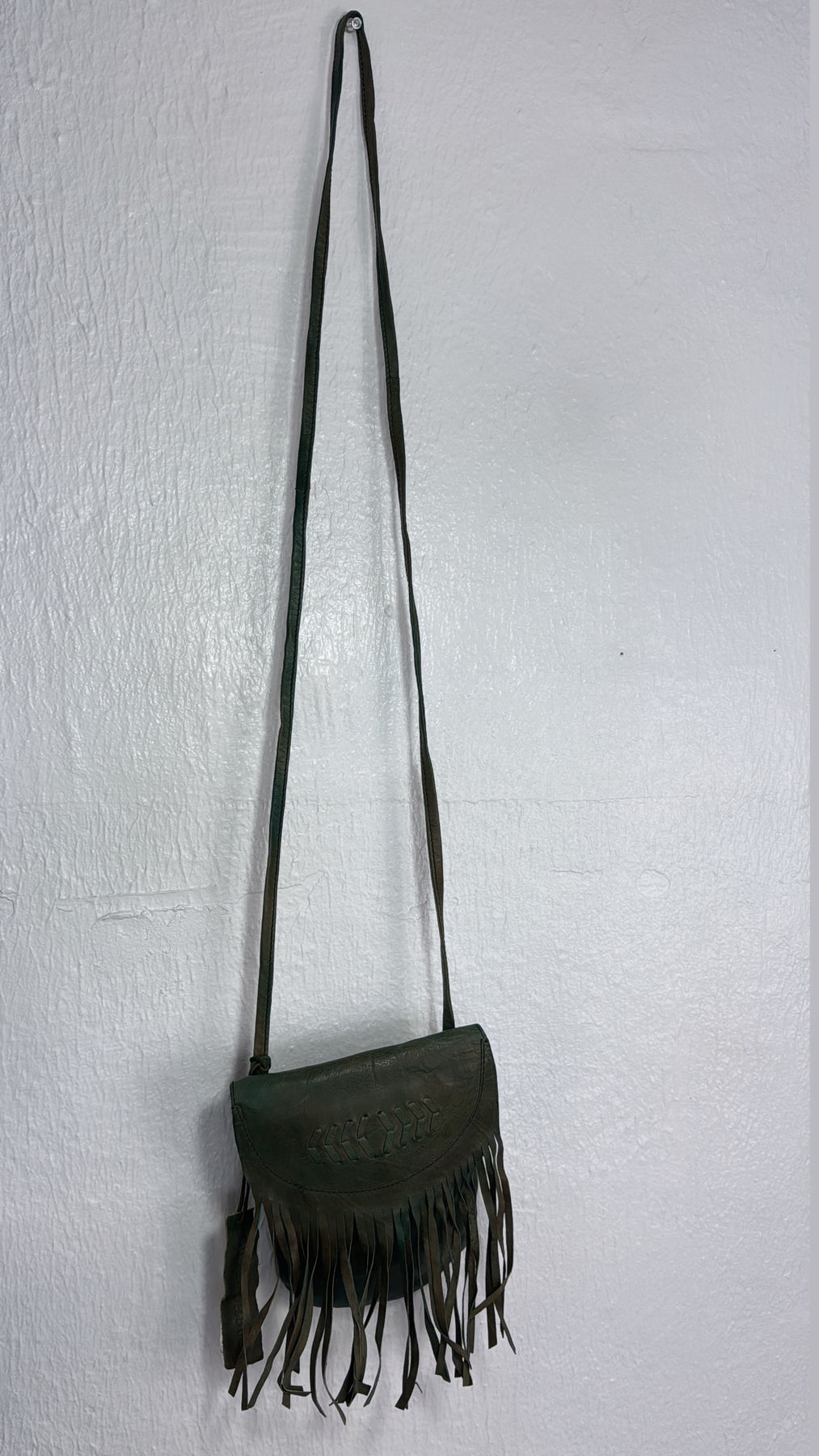 Ultimate festival fringe bag. Flap over with staple whipstitch arrows to main slip compartment. Inside credit cards slots. Backside belt loop that can be worn as a belt bag or own strap can be used to make into a belt bag style. Backside slip pocket. A timeless heirloom piece.
