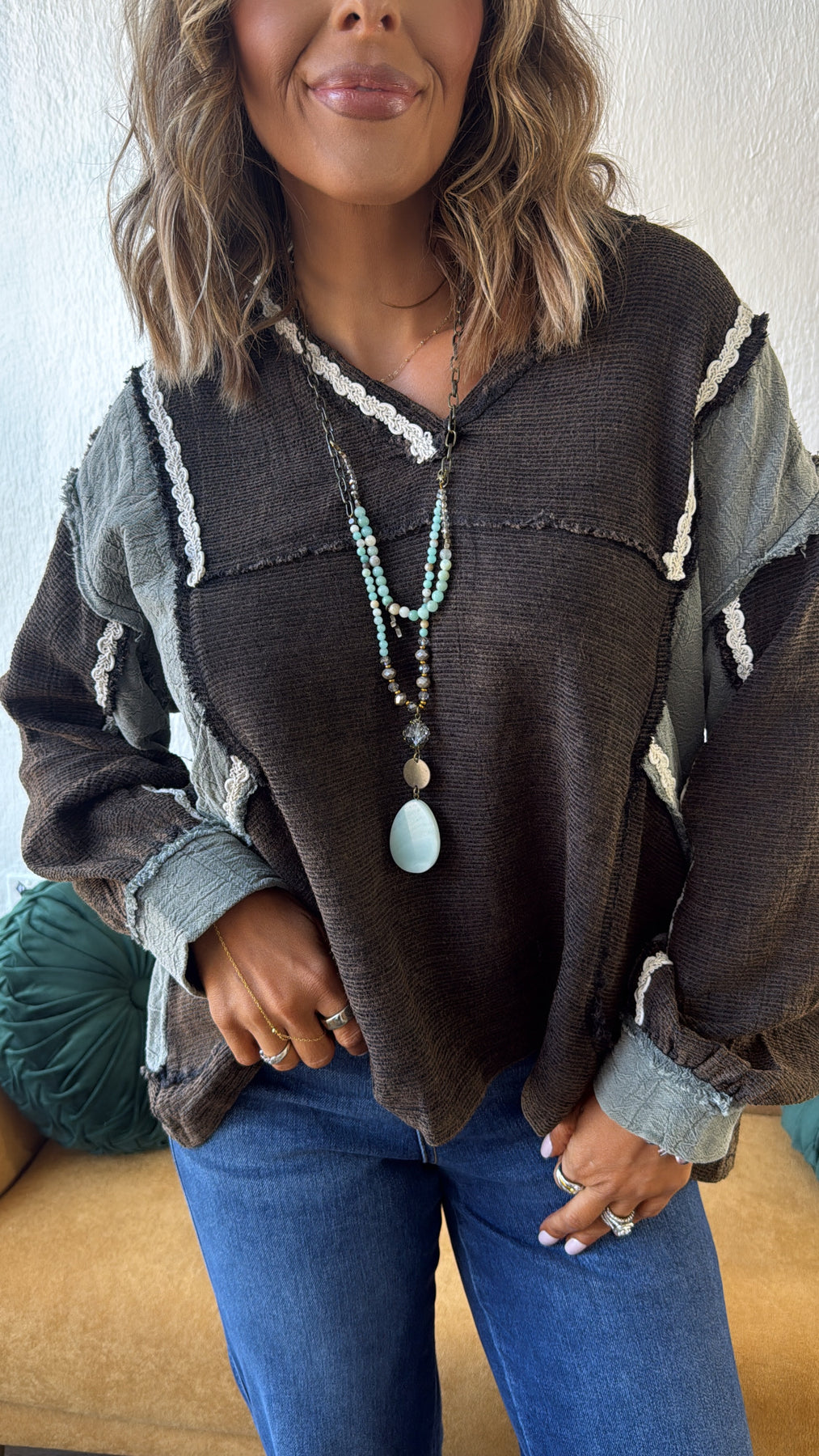 Add effortless boho vibes to any outfit in the Woven Dona Necklace Featuring two layers of bronze hardware and multicolored blue hue beads.