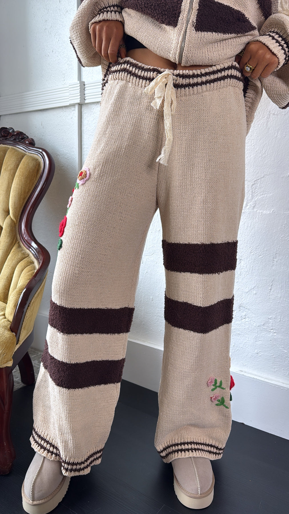 Cozy meets chic in our Flower Petal Pant. Crafted from a soft, lightweight knit, these cream-colored pants feature bold chocolate stripes and delicate hand-embroidered floral accents for that perfect touch of charm. The relaxed, wide-leg silhouette offers ultimate comfort while keeping your look effortlessly stylish.