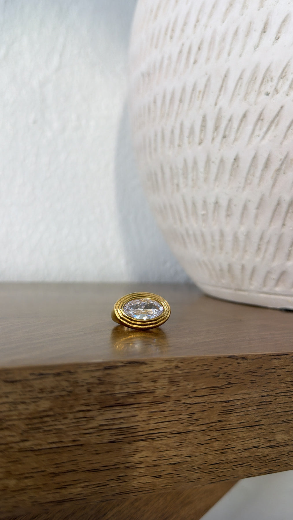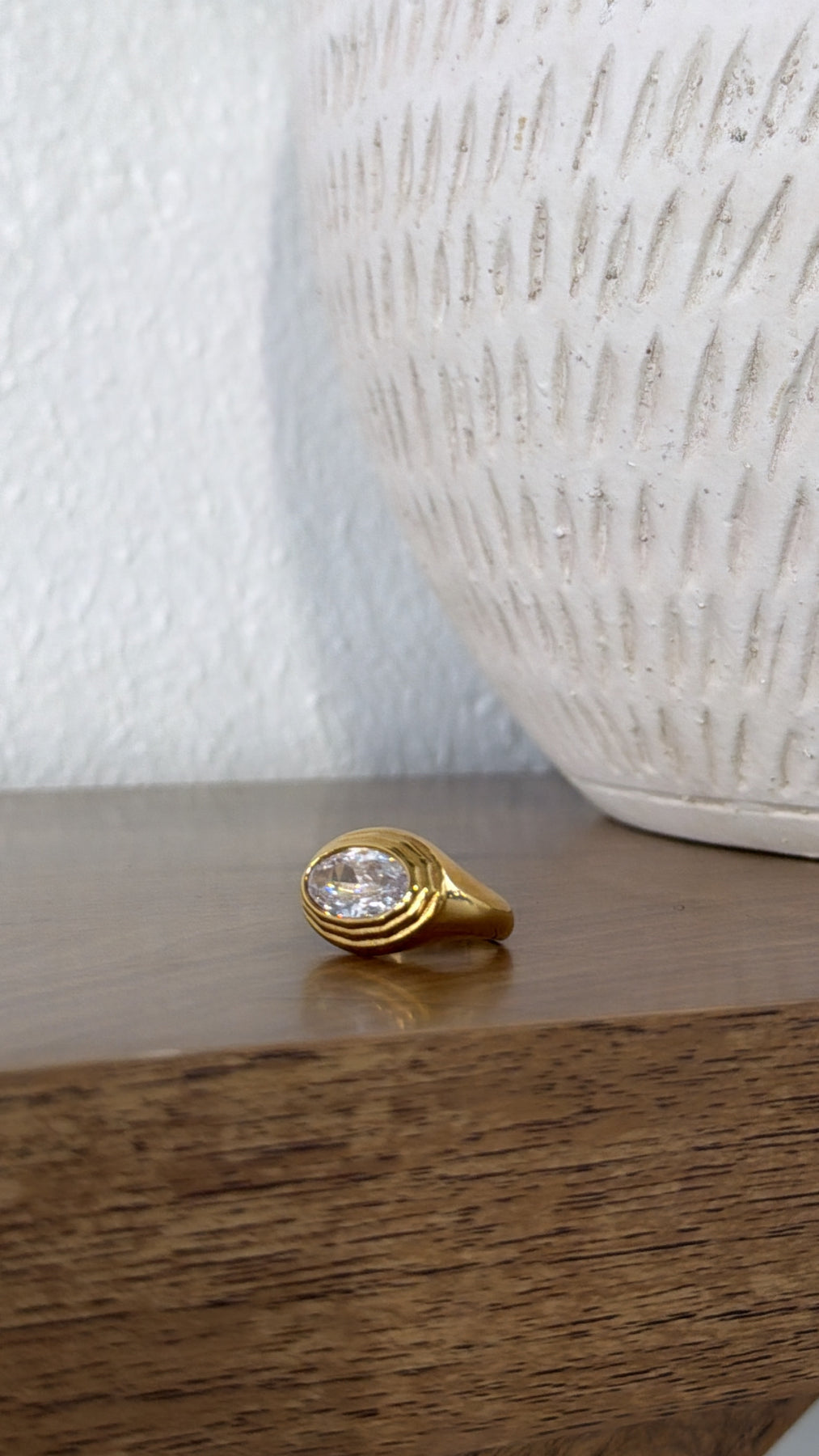 Classic elegance meets modern edge with the Carley Ring. Designed with a bold gold band and a stunning oval-cut crystal centerpiece, this ring brings just the right amount of shine without feeling overdone. Its smooth, sculpted setting gives it a timeless signet-inspired feel perfect for everyday wear or dressing up your stack.
